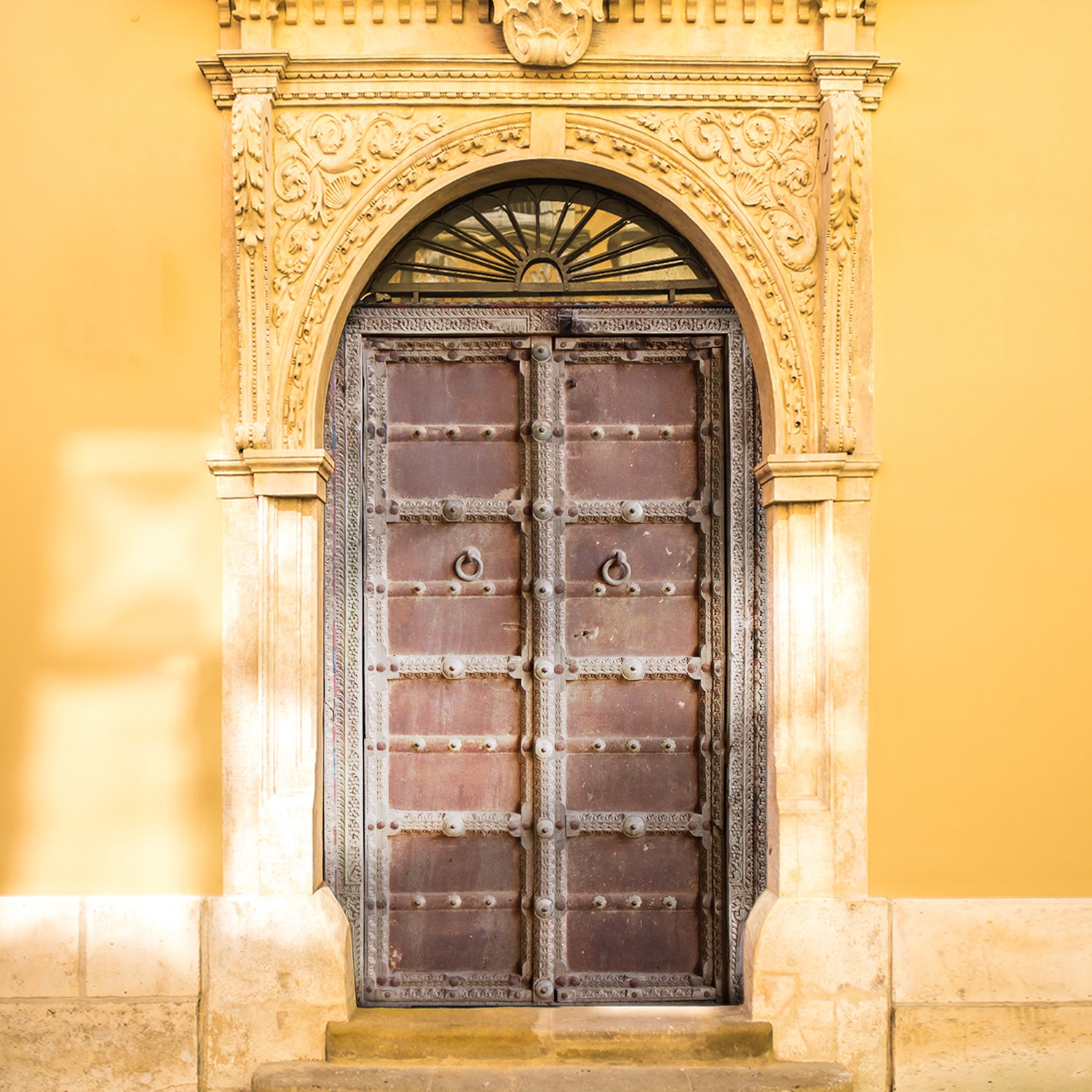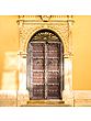 Crafted from high-quality wood, this vintage door stands as a stunning attraction for any home or building. The rich coffee color adds a touch of warmth and sophistication, creating an inviting entrance that welcomes guests with elegance. The intricate borders of the door showcase the artistry of Rajasthani craftsmanship - carved with tradition, these intricate patterns exhibit the skill and dedication of our artisan, leaving admirers in awe of its beauty. Enhancing the door's charm are the shield-like pins that grace its surface completing its full appeal.