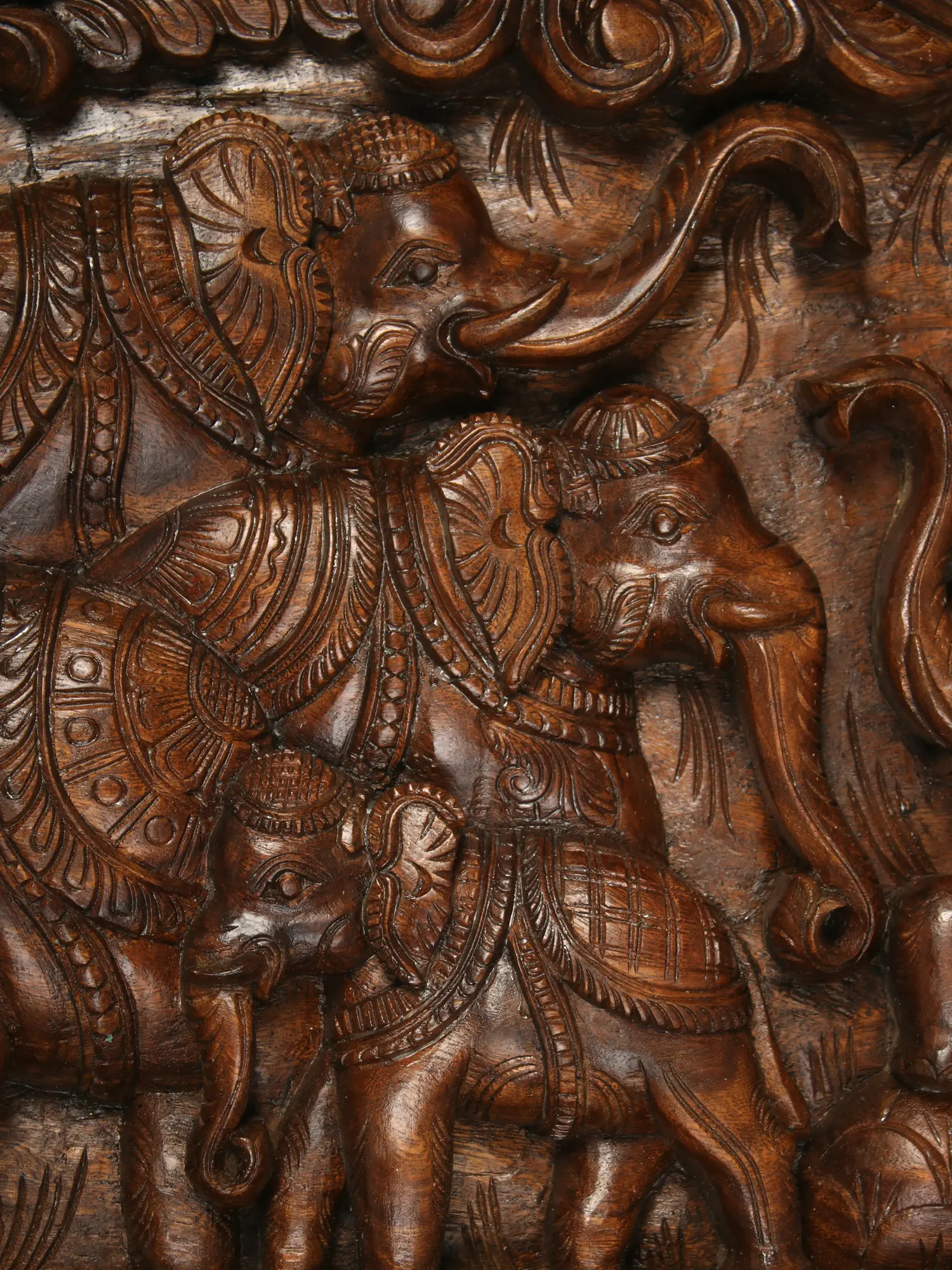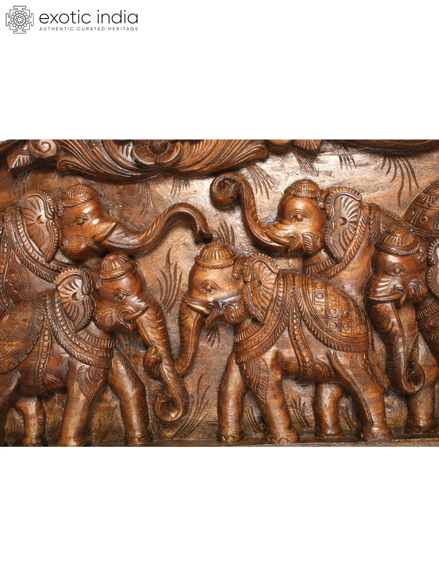 The beauty of this panel lies in its incredible level of detail. Each elephant is uniquely carved, capturing the grace and power of these magnificent creatures. The artisans have skillfully incorporated swirling floral patterns along the top and bottom borders of the piece, adding a touch of ornate beauty that elevates the entire design. The rich, deep brown hue of the wood lends a sense of timeless elegance, while the slightly textured surface adds a tactile dimension that is captivating to the touch. Imagine the compliments you'll receive from guests as they admire this stunning work of art.