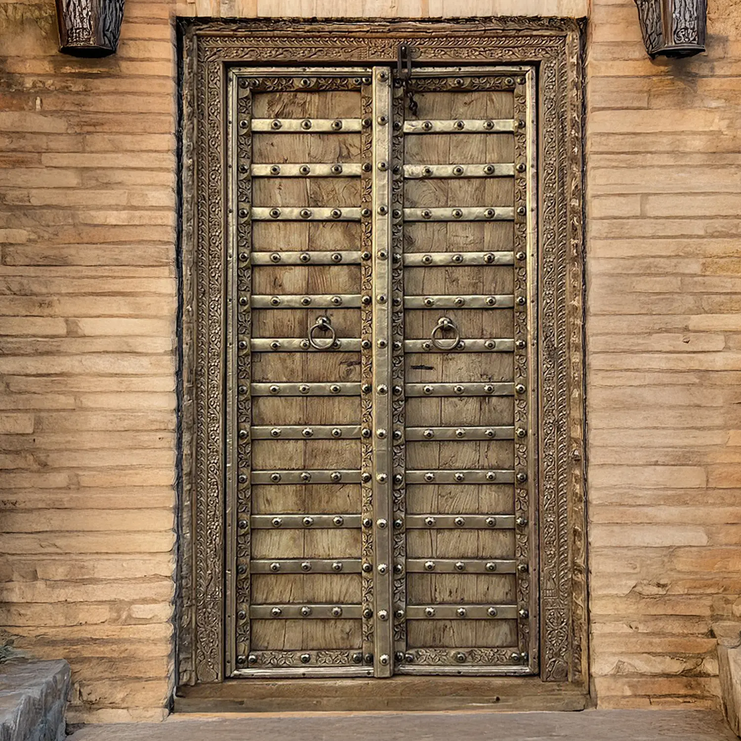 Prepare to be mesmerized by the exquisite craftsmanship and meticulous detailing showcased in every inch of this captivating door. The hand-carved frame is a testament to the artisan's skill, boasting an intricate design that showcases a delicate dance of motifs. The iron accents, complete with a classic knock, add a touch of rustic charm and reinforce the door's sturdy construction. Each element has been carefully considered to create a harmonious blend of aesthetics and functionality. Run your fingers along the carved frame and feel the history etched into the wood. Notice the strategic placement of the iron embellishments, each one adding to the door's unique character. This is more than just a door; it's an experience, an immersion into the world of handcrafted artistry.