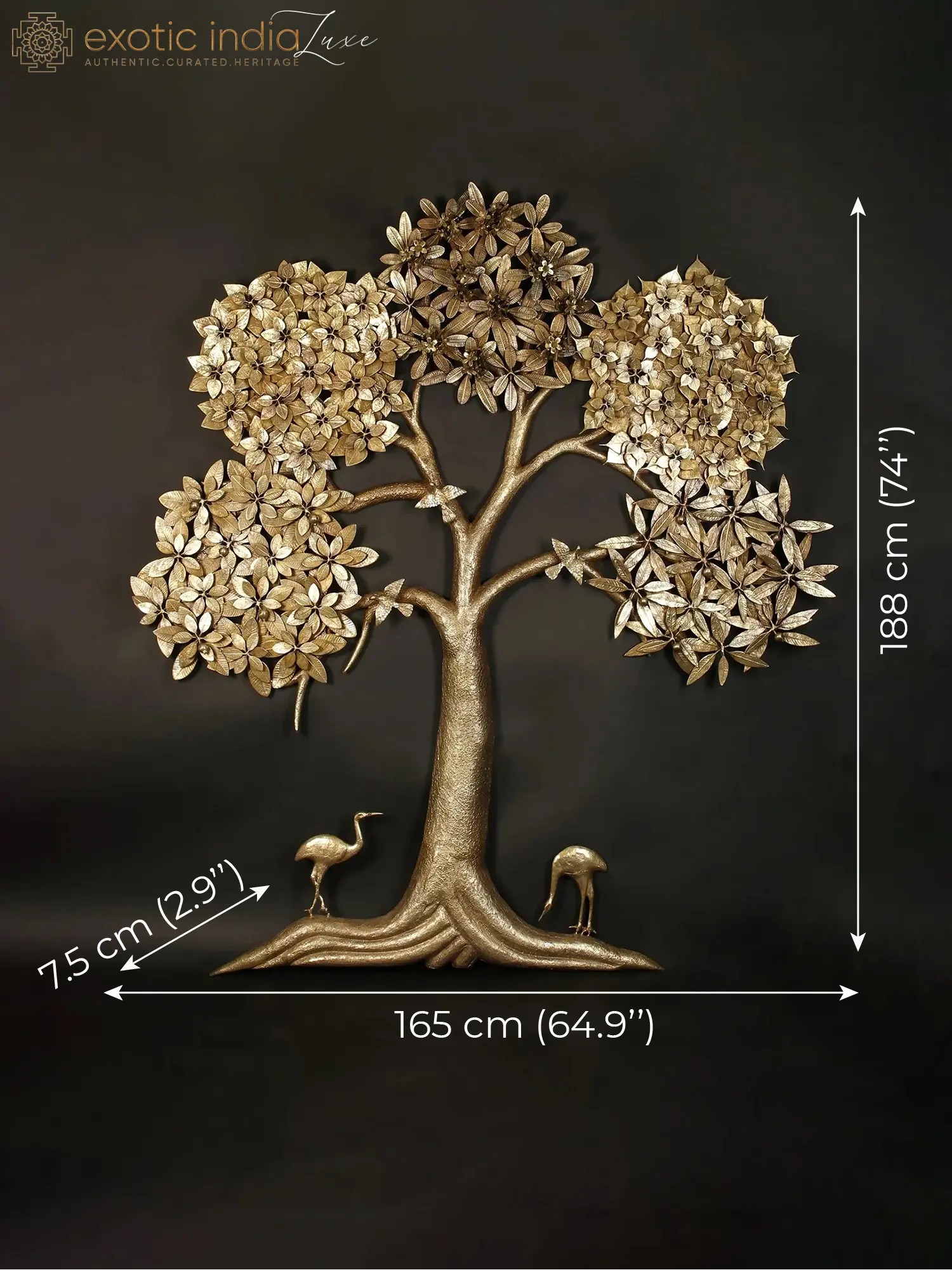 If you want to find all the wisdom of sacred plants in one place this brass tree with five sacred plants amalgamated in one place is the answer to your prayers. This piece This brass tree embodies all of the auspiciousness carried by five trees. Mango (Amra Pallava), Peepal (Aswatha), Banyan (Vata), Plumeria (Gour Champa), and Pomegranate (Anar) leaves have religious significance and are used as offerings to deities. Beautiful birds sit on the trees, symbolizing nature's peaceful atmosphere. The presence of two cranes walking gently around the tree adds to the piece's charm. This entire tree is a sign of peaceful growth and wealth.