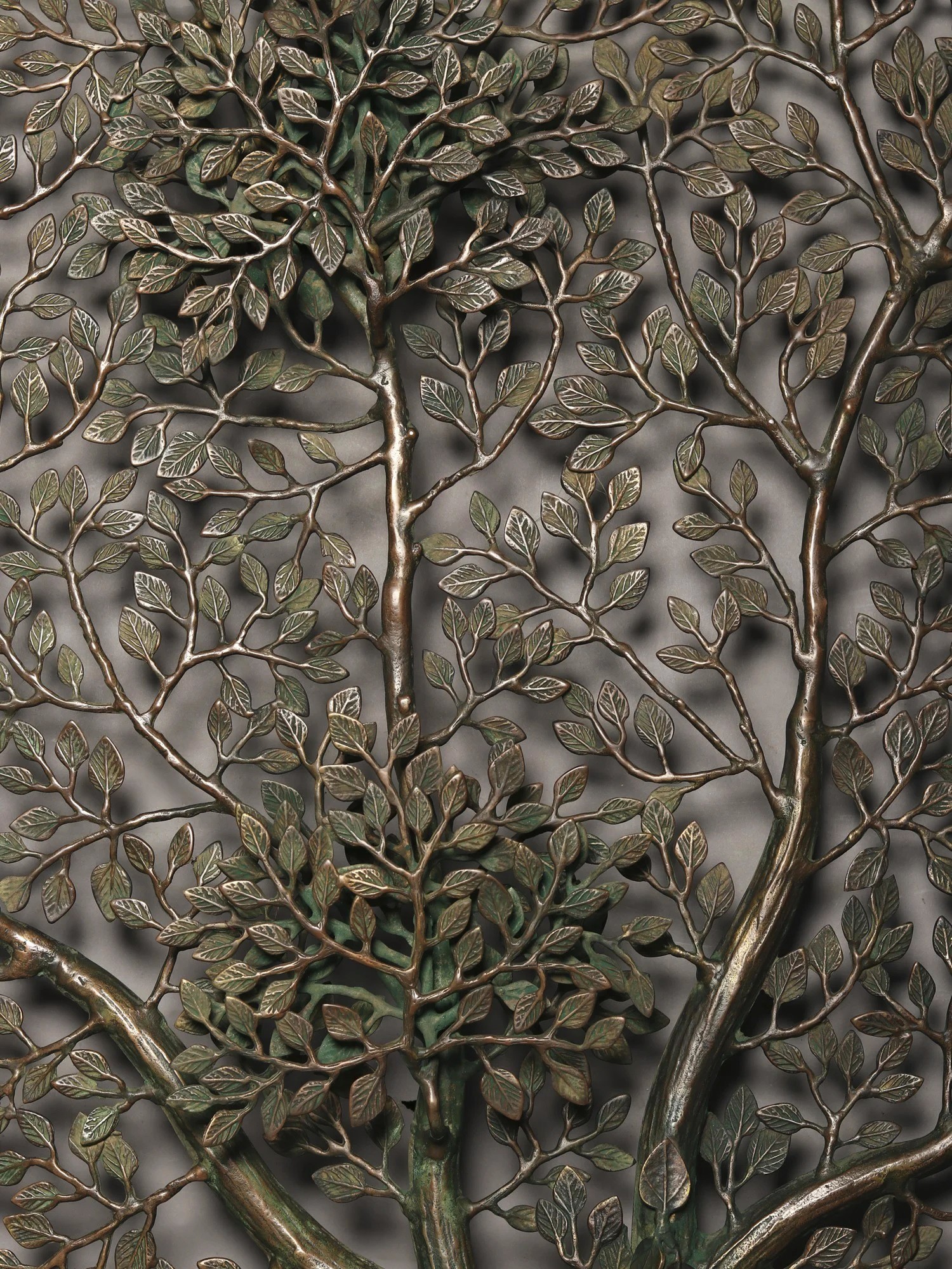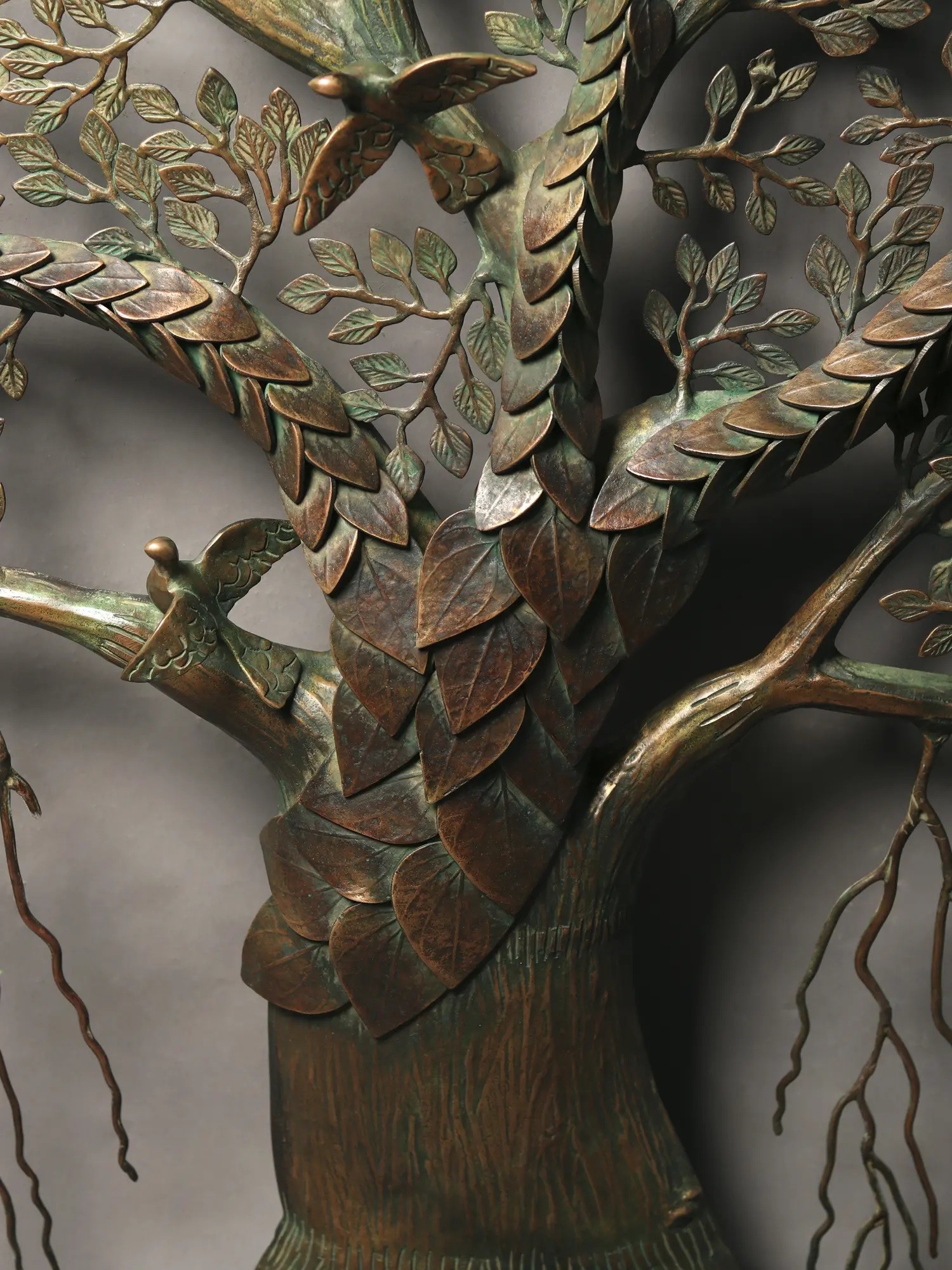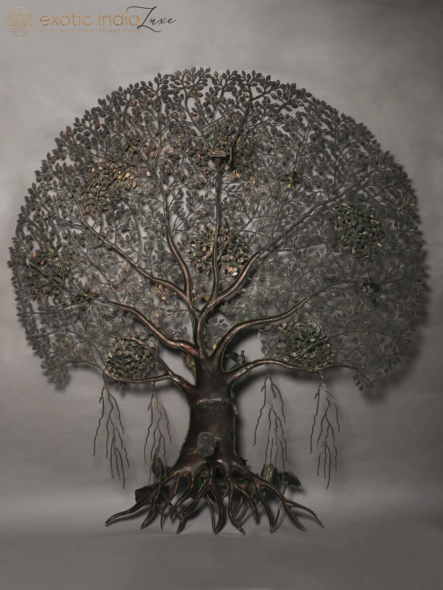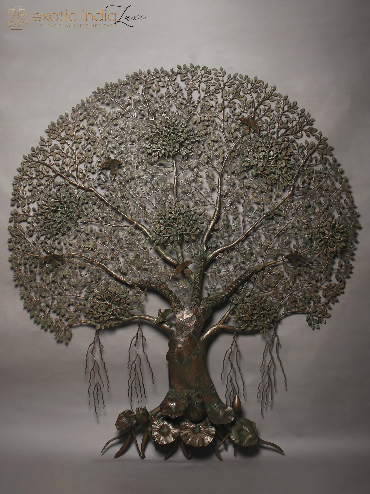 The life-size brass Tree of Life wall hanging here is the mesmerizing delineation of a blooming tree, which will become the attractor of luxuriance and beauty to your space. The roots shooting from branches of this brass Tree of Life suggest that it is a Banayan or Bargad, one of the most auspicious trees in the East.