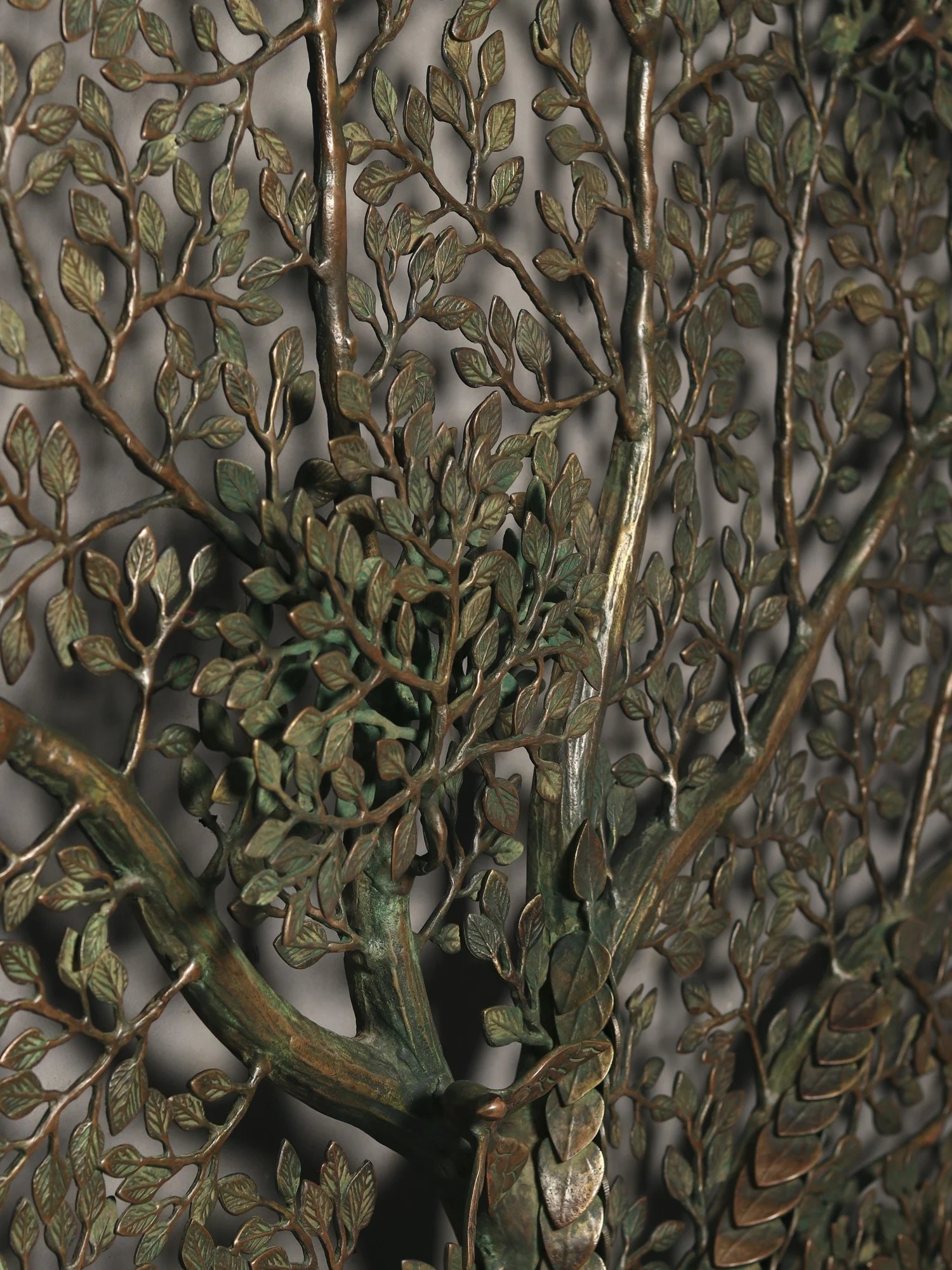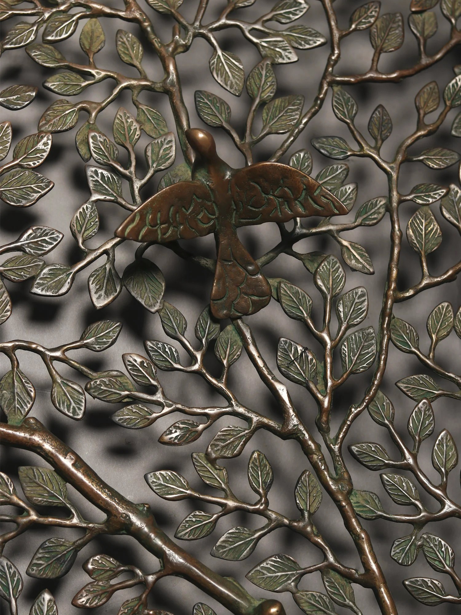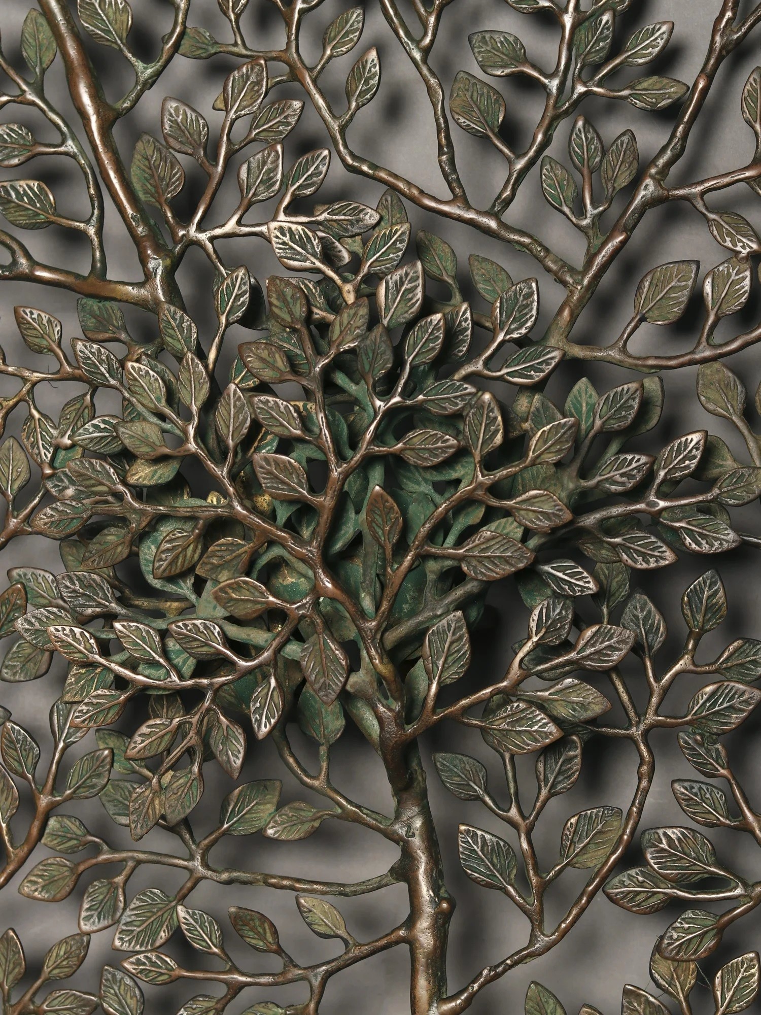 The life-size brass Tree of Life wall hanging here is the mesmerizing delineation of a blooming tree, which will become the attractor of luxuriance and beauty to your space. The roots shooting from branches of this brass Tree of Life suggest that it is a Banayan or Bargad, one of the most auspicious trees in the East.