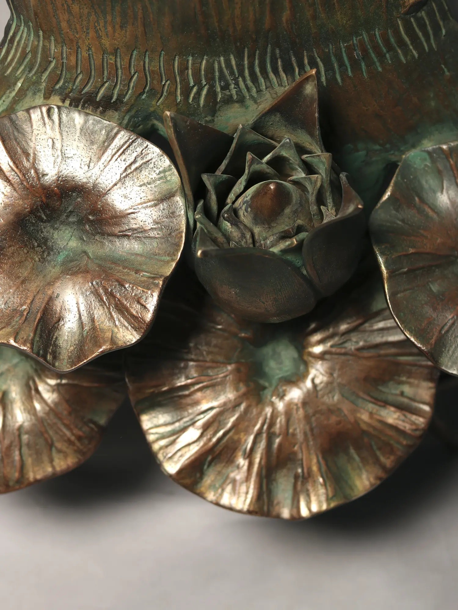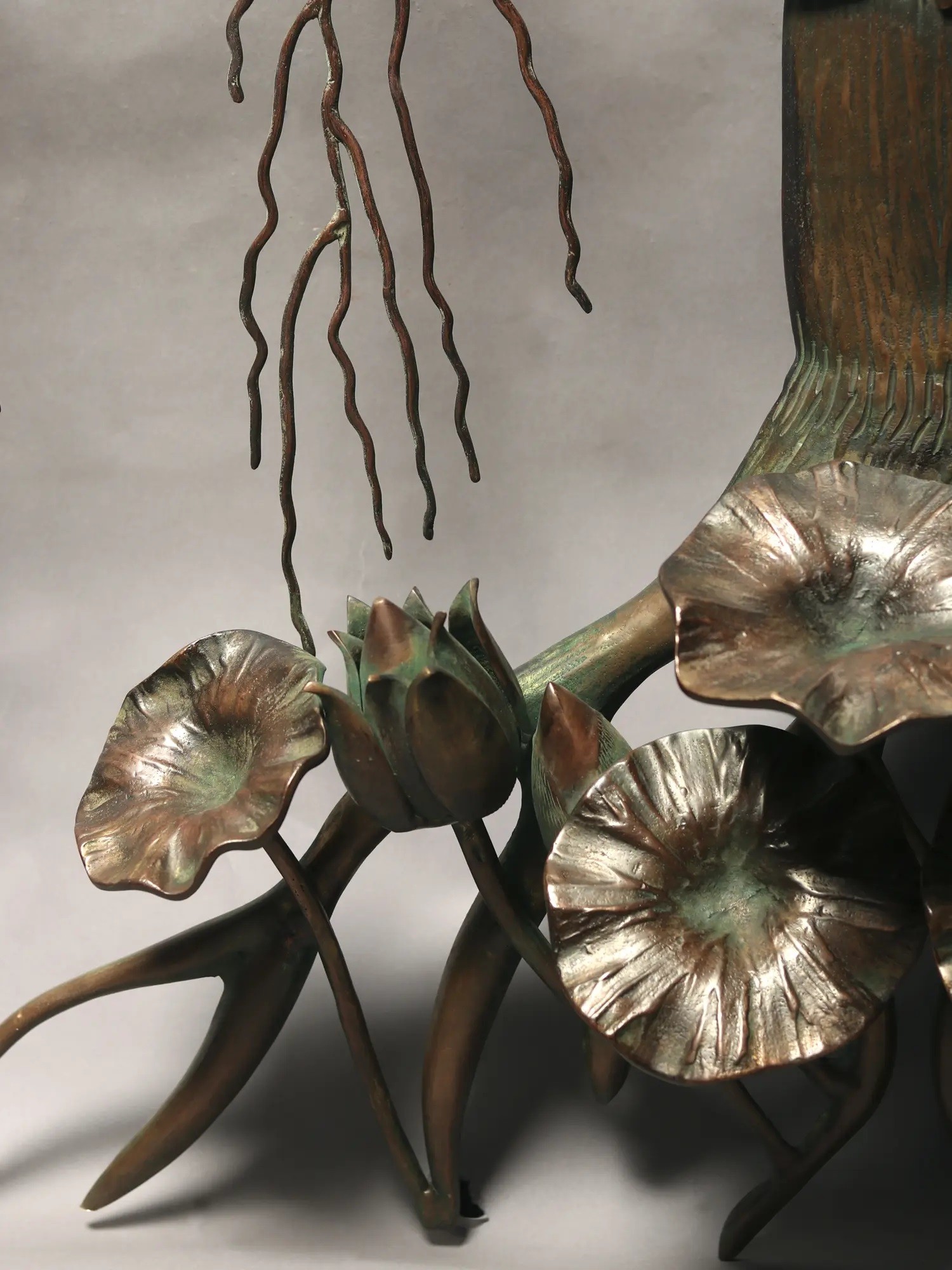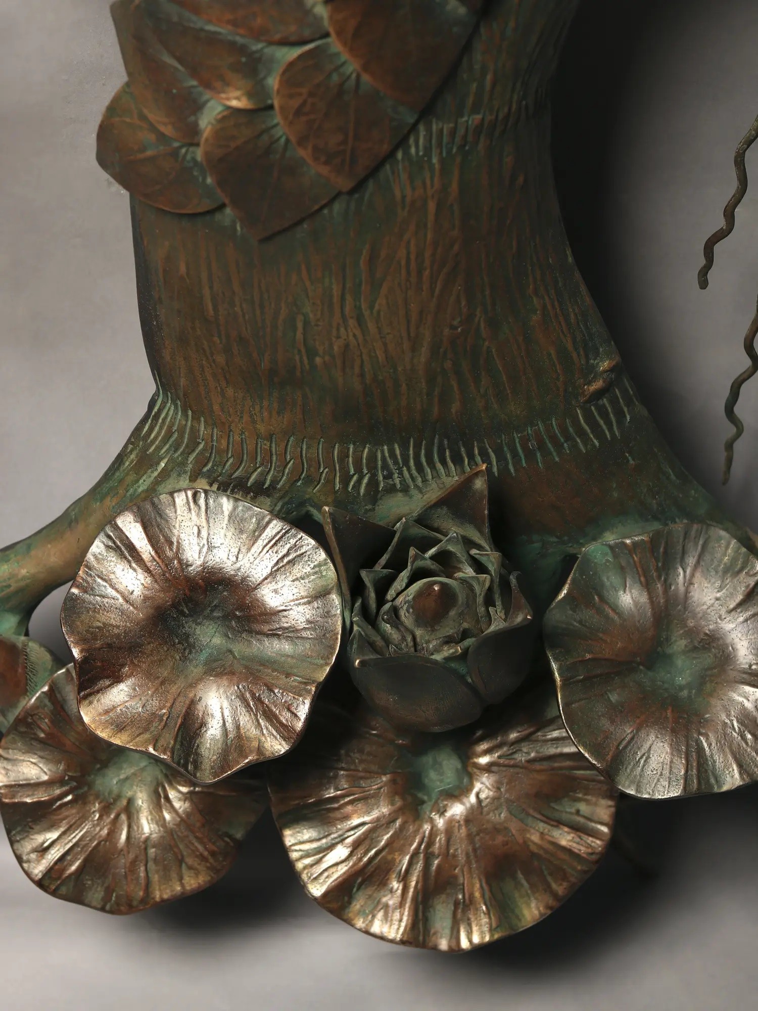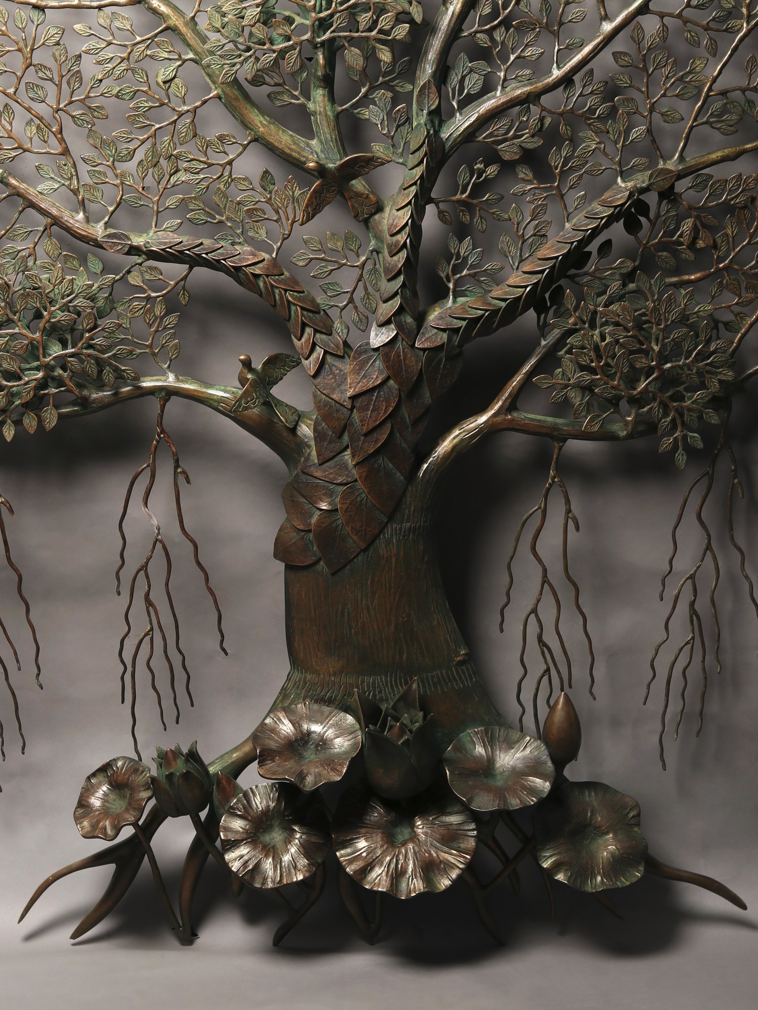 The thick trunk of the tree has fine veins on it and holds a bunch of waterlilies on its base. The most enchanting part of the brass tree is clearly its leaves, each one of which is sculpted with a charming realism, with areas differing in density to provide you with a realistic recreation of a true tree. On the branches of the tree, birds are nestling relaxedly, adding dynamism and liveliness to the brass composition.