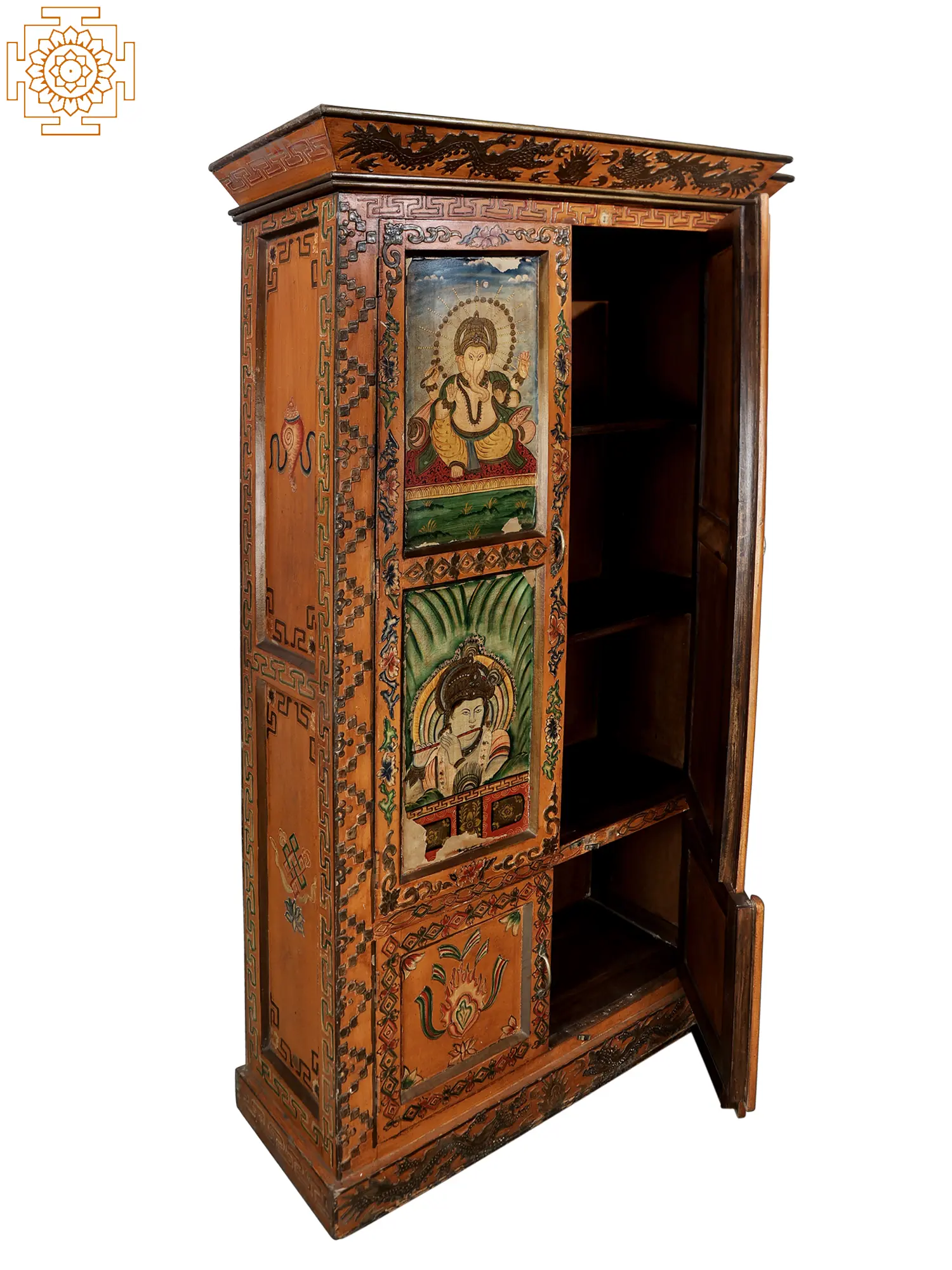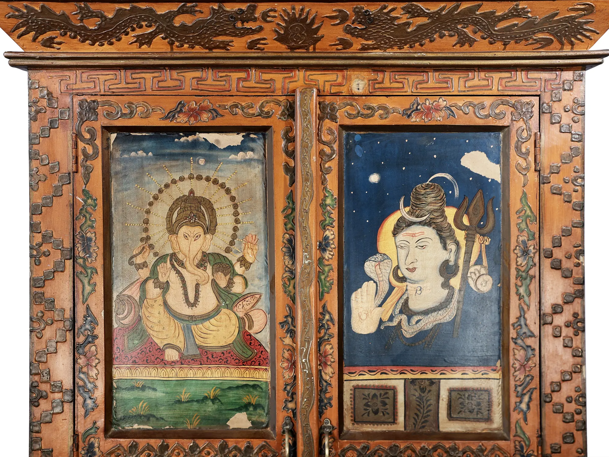 This gives the cabinet the perfect antique look. The cabinet not only serves as functional storage but also stands as a work of art, with its detailed motifs and vibrant colors adding a touch of spirituality to any space. Its vintage charm transports one to an era of traditional craftsmanship, making it a unique and cherished piece for collectors and enthusiasts alike. This cabinet is a testament to cultural reverence and skilled artistry.