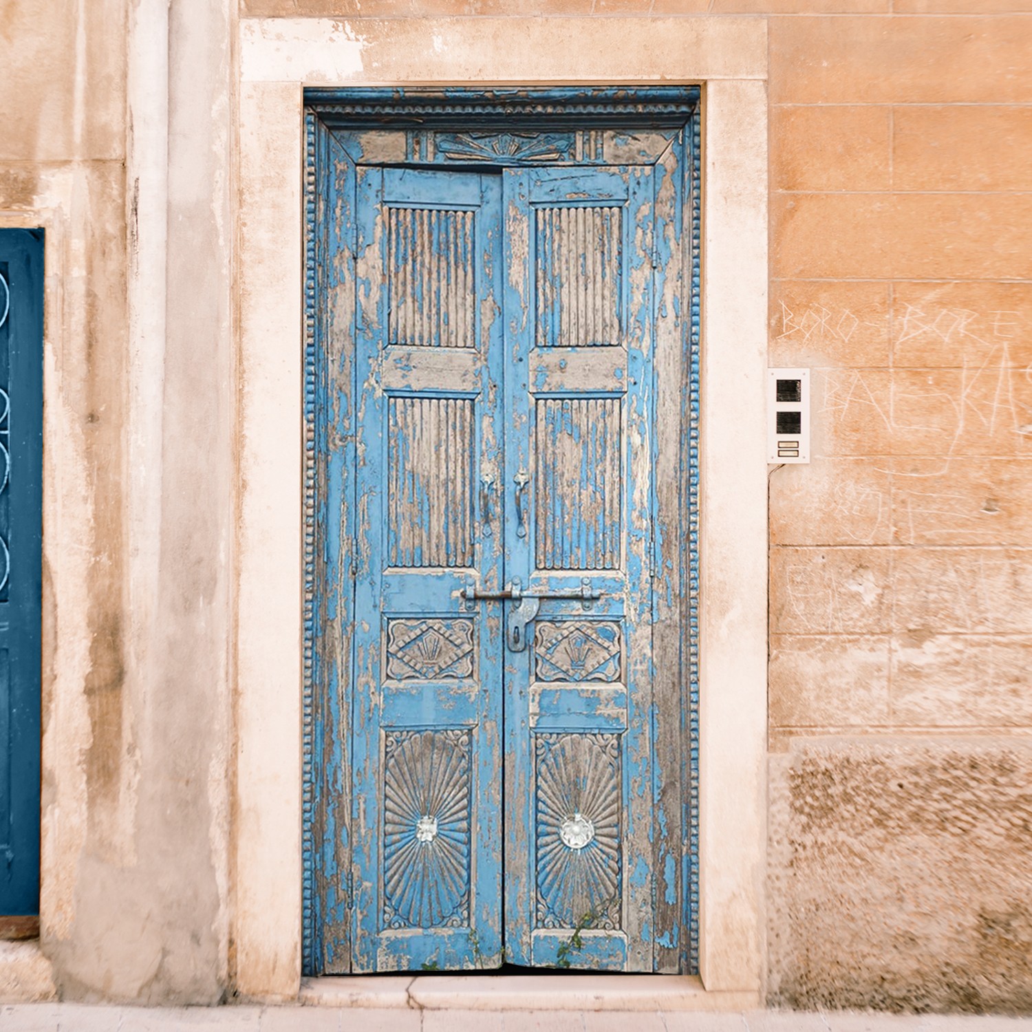 78" Floral Hand Carved And Block Design Wood Door With Vintage Style Knock