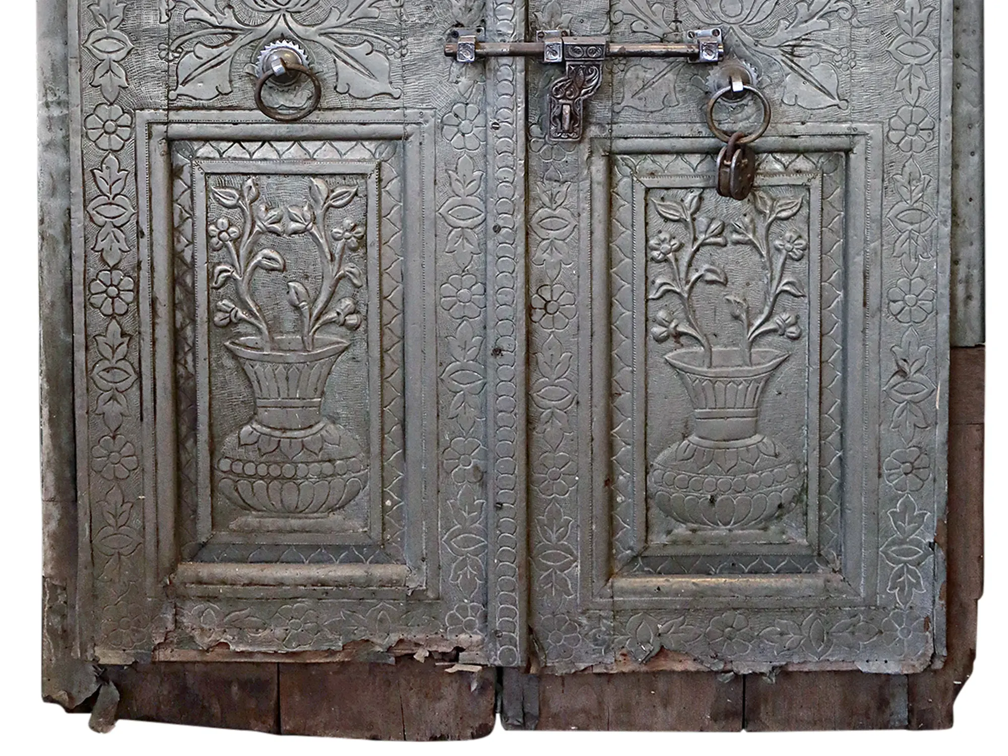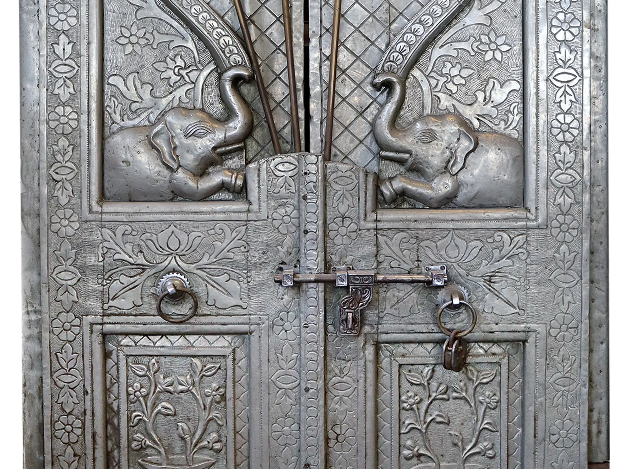 The Large Old Grey Door with Carved Elephants and Vases showcases a regal elegance that harkens back to a bygone era of royalty. These Vintage doors, originating from Rajasthan, possess a captivating allure that exudes grandeur and sophistication. The intricately carved elephants and floral patterns are reminiscent of the opulence associated with royal palaces. Beyond their aesthetic appeal, these doors offer a strong and durable barrier, ensuring the security and protection of homes. They not only provide a touch of historical charm but also serve as a symbol of strength and fortitude.