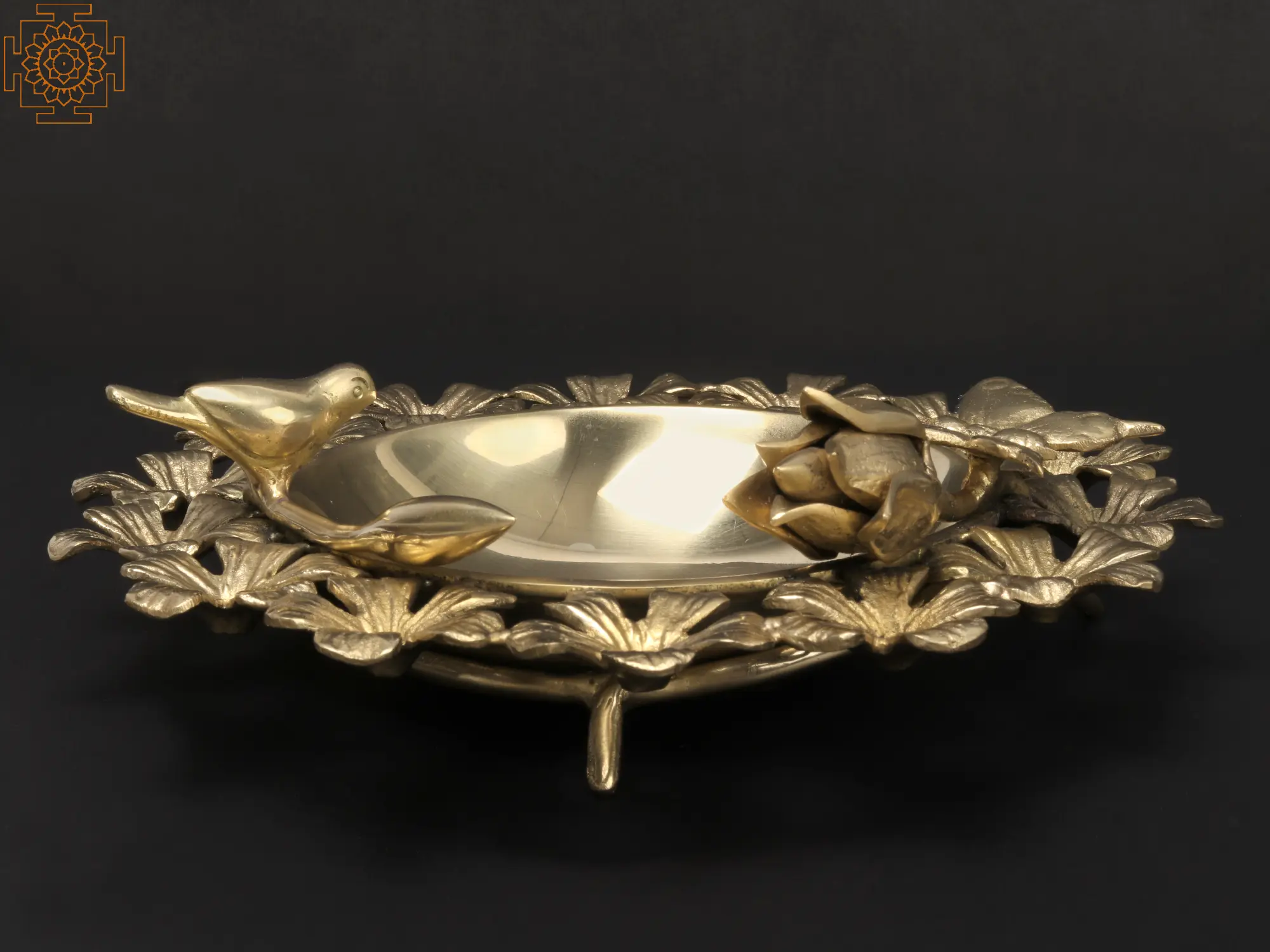 The decorative piece that you see here is for enhancing the sophistication adorning the side table or the center table of your living room. Made of natural brass, this Urli bowl displays all its perfection, radiating its bright shine around. It is decorated with beautifully shaped flowers, a bird, and a butterfly, bringing in a mystic sensation into the space. When you fill the bowl with water and float some fresh flowers or their petals, it will be no less than a small garden of fragrance.