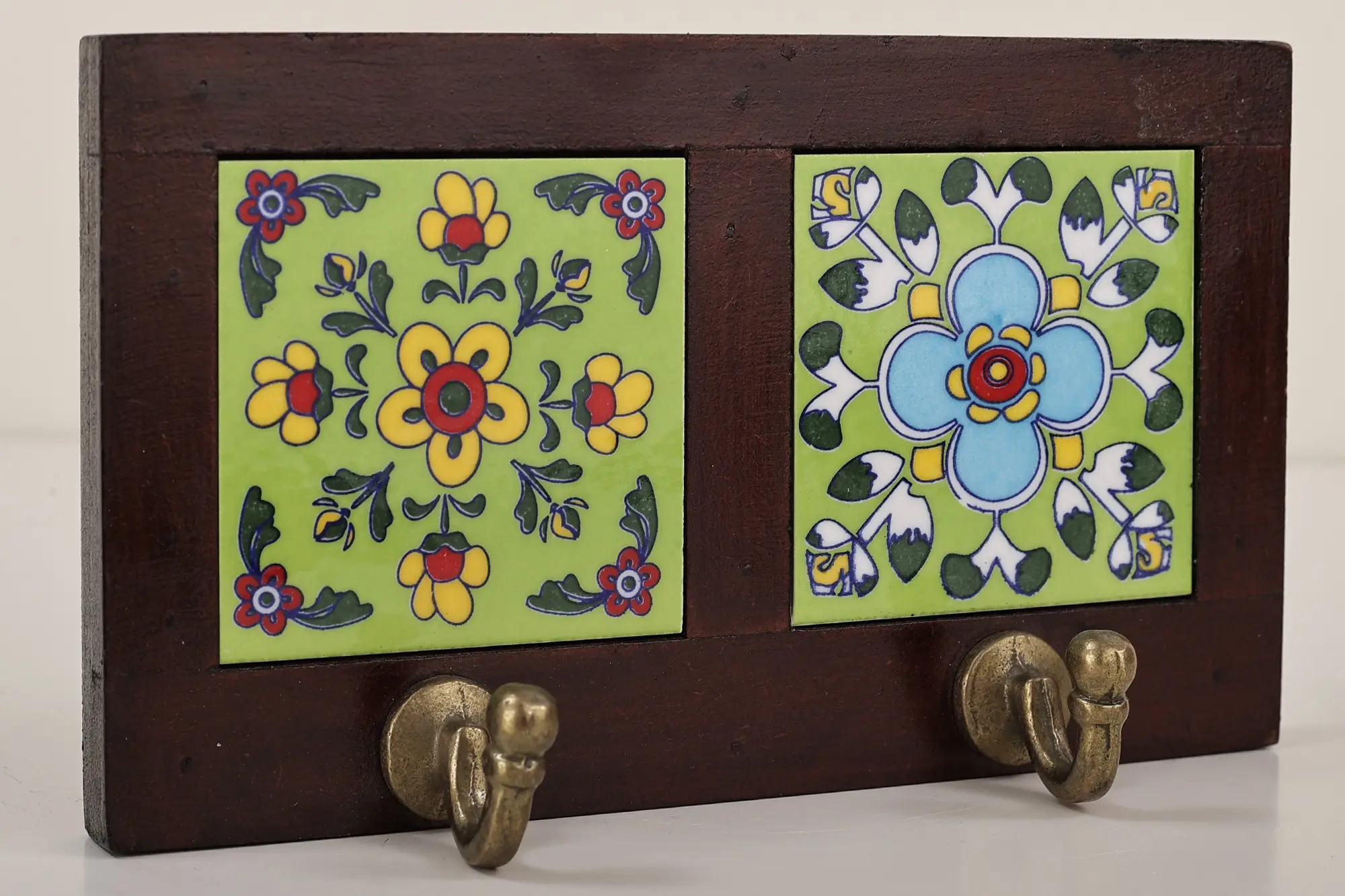 Hard work is the key to success, and this keyholder is a key to elevated home decor style. Crafted in rich brown wood, it features two sturdy hooks for easily organizing keys. Adding a delightful touch, the holder is adorned with vibrant, bright-colored ceramic tiles, enhancing functionality and aesthetics. This fusion of practicality and artistic flair makes it a perfect accent for any space. It offers a stylish solution to keep keys in check while infusing a pop of color into your daily routine.