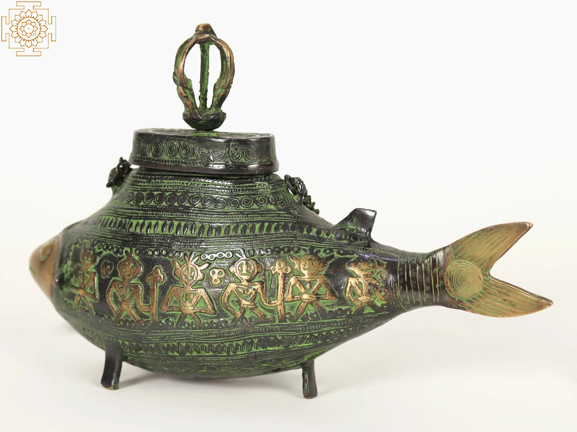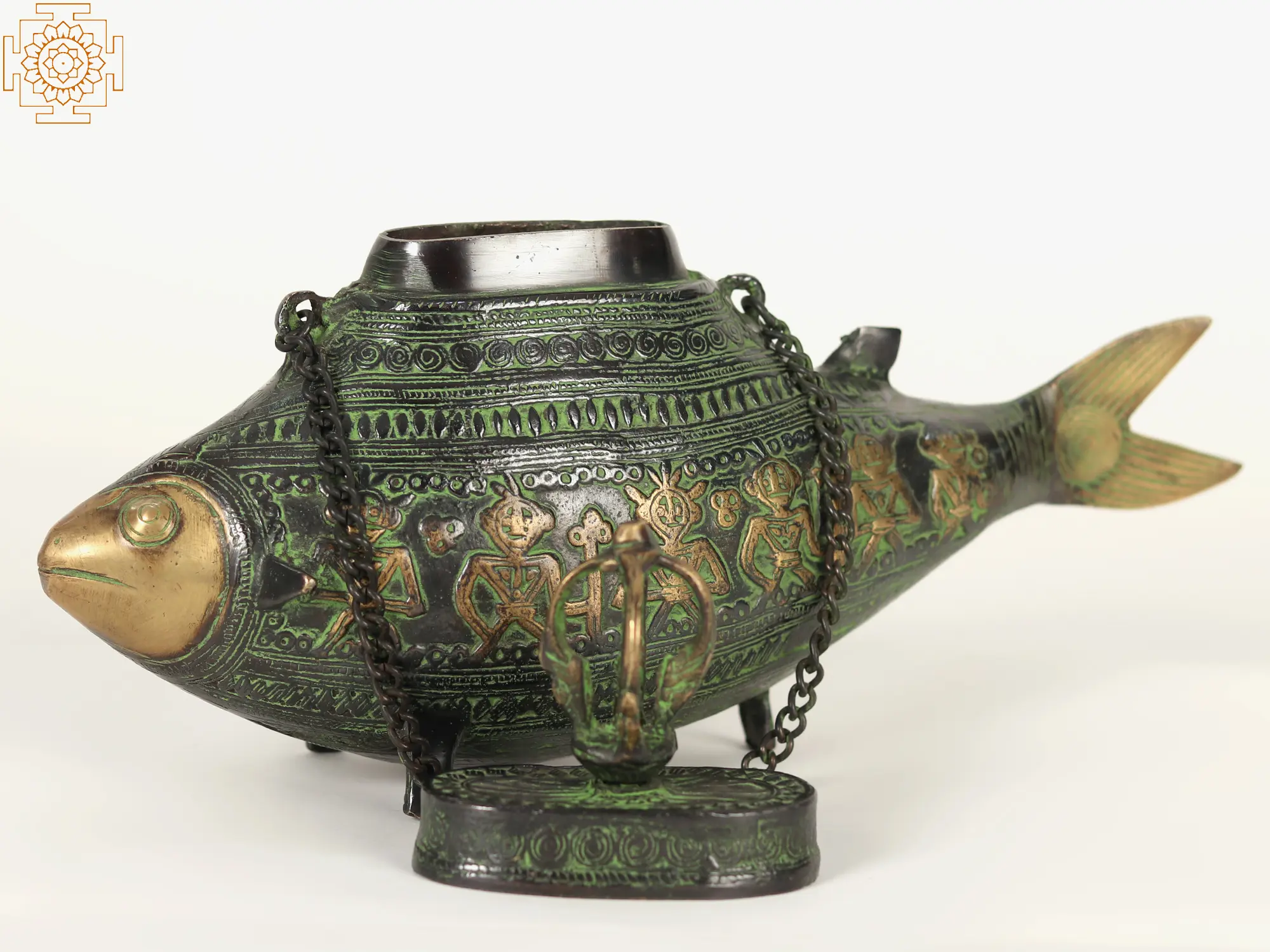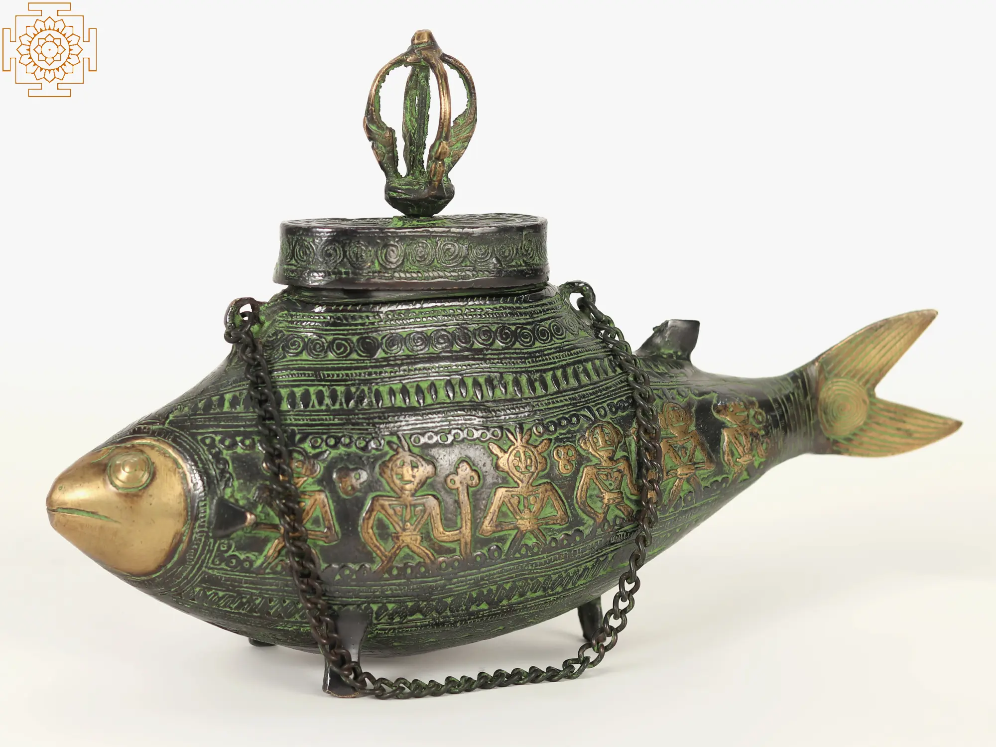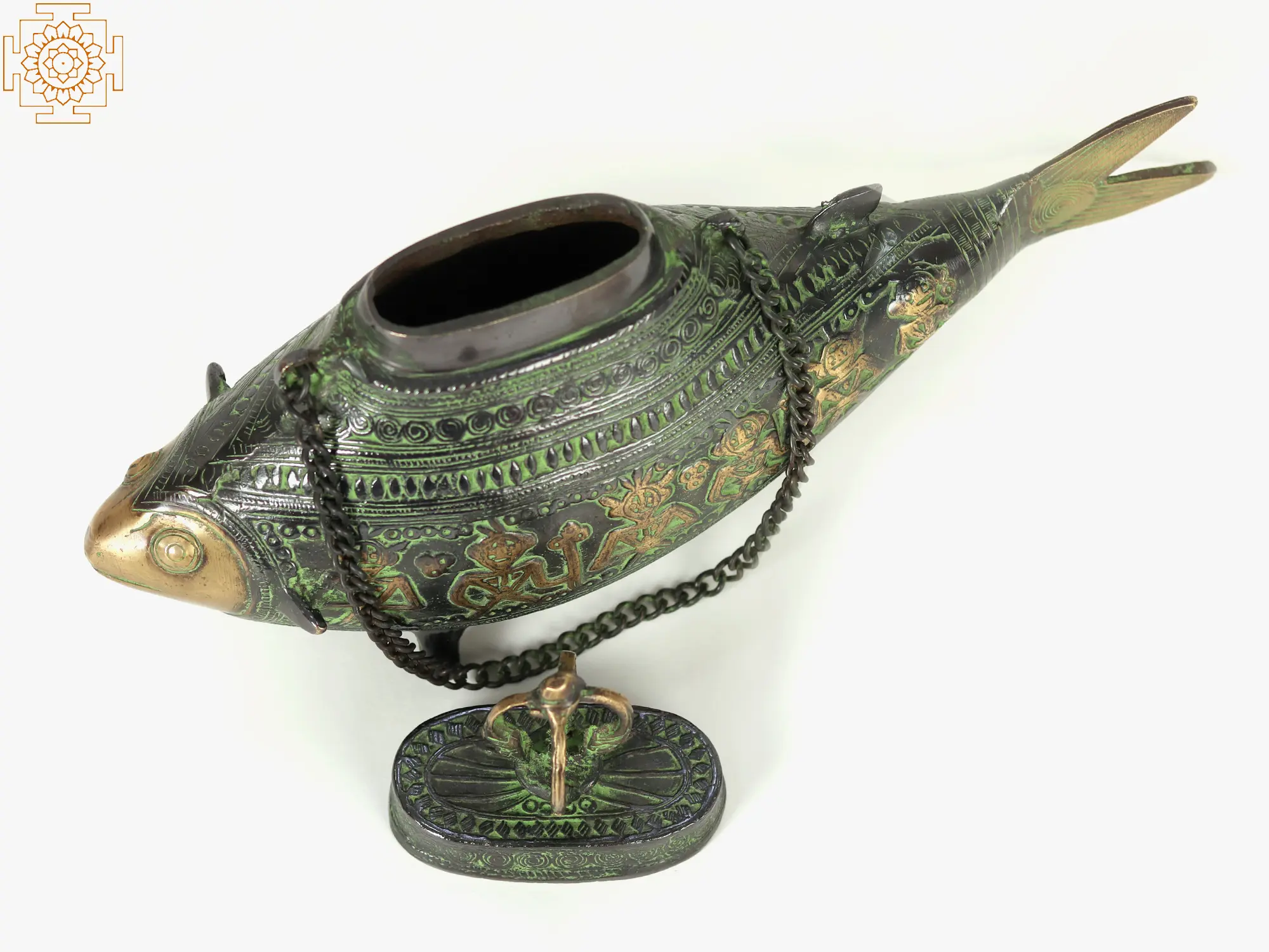 Fish are revered in Hindu and Buddhist traditions, signifying a variety of metaphorical and spiritual connotations. The fish is linked with Lord Vishnu, one of the primary deities in Hinduism, and has a specific position in the faith's religious and cultural fabric. In Buddhist teachings, it represents mindfulness and attentiveness. This brass fish-shaped decorative container validates the principle underlying the use of fish in numerous civilizations, which is to hold information and awareness within a medium. This container also has a matt antique surface, which adds to its ancient appeal and makes it a great element for home decor.