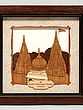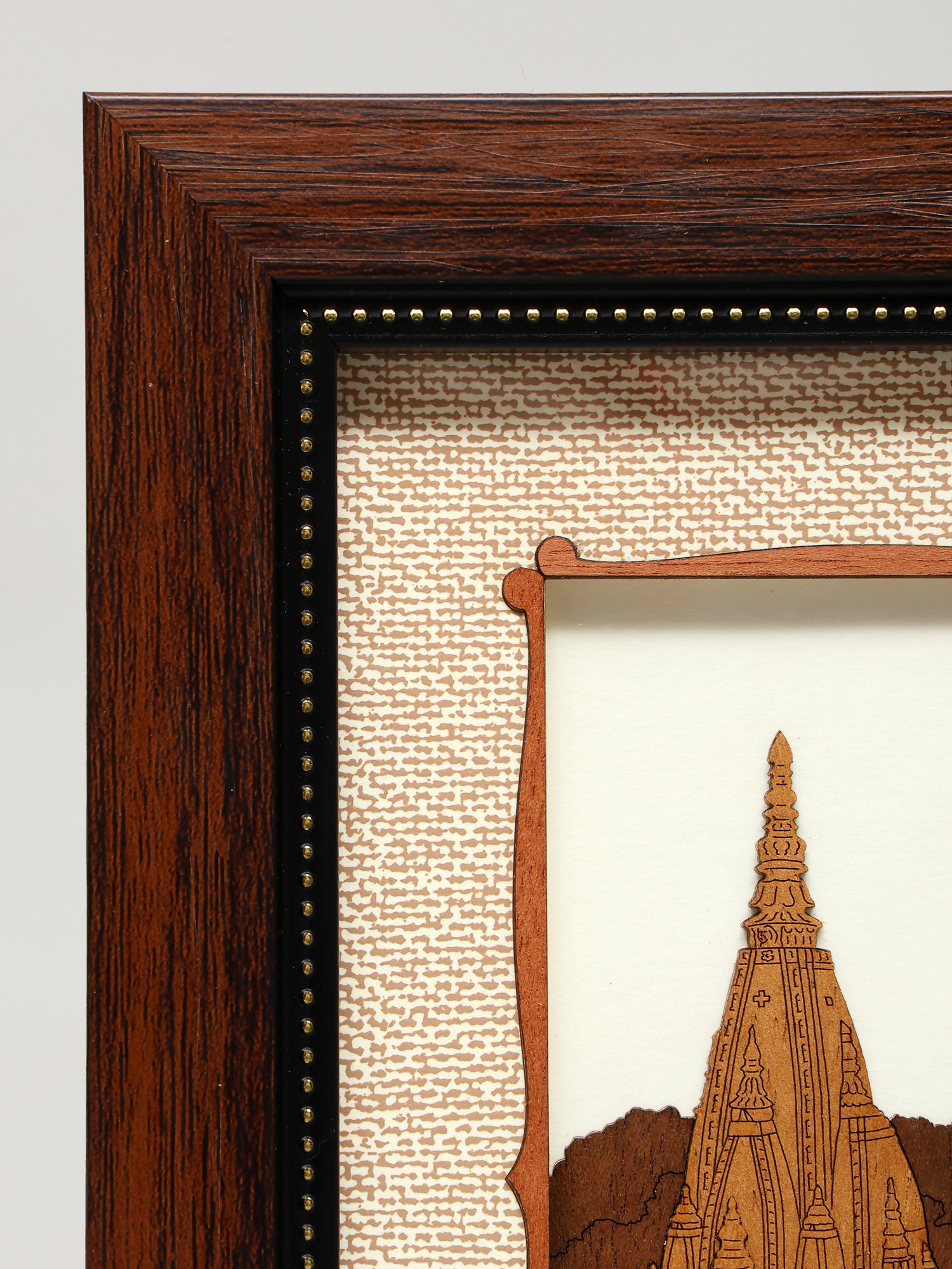 The artwork is meticulously carved from wood, creating a layered effect that adds depth and dimension to the image. The warm tones of the wood enhance the intricate details of the temple's architecture. The piece is thoughtfully framed with a rich, dark-toned frame, adorned with subtle embellishments that complement the wood carving. The textured backdrop adds visual interest and further accentuates the temple's features.