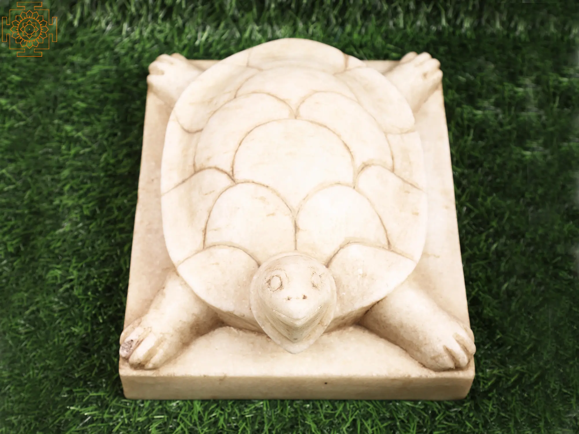 Made of world-famous Makrana white marble, and a chisel-hammer carved by skilled craftsmen, this Vastu tortoise looks very Exotic. Its round, the dome-like shell has been carved with protective scoots that protect him from injury. The cute tortoise, having club-like two forelegs and two 'elephantine 'hind legs, is seated on a rectangular thick marble tile. With a round ornament on his raised neck and smiling face he is staring at you to take him to your home for bringing peace, happiness, and wealth.
