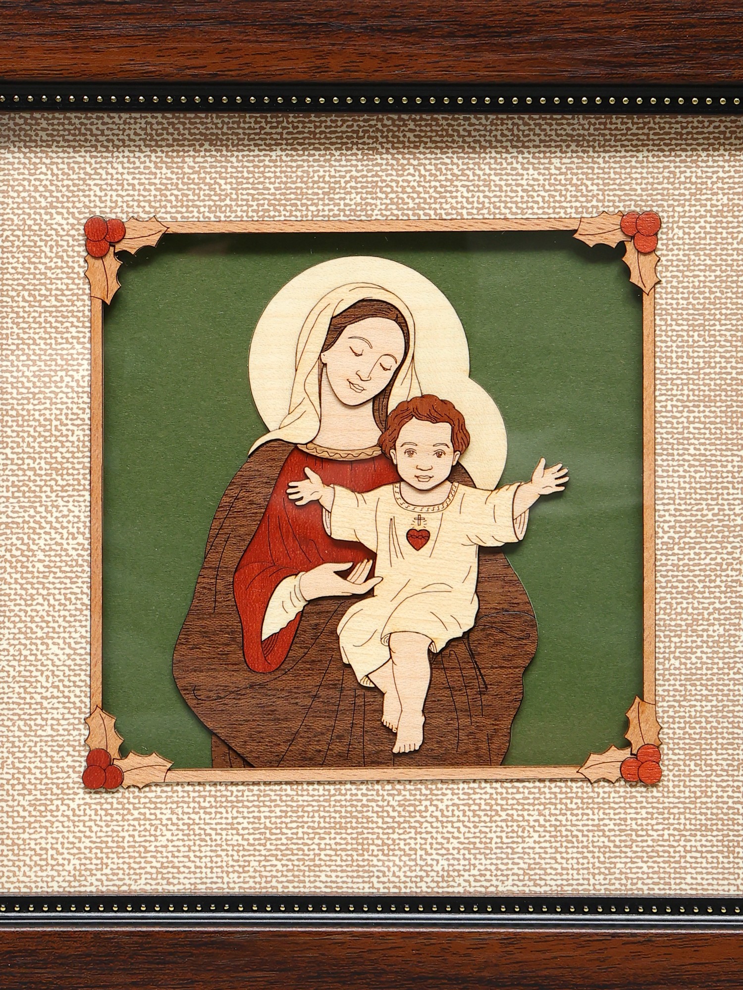 The artistry lies in the meticulous detail of the wood carving. The artist has skillfully used the natural grain of the wood to accentuate the contours of Mother Mary’s face and the delicate features of the Christ Child. The figures are set against a backdrop that is reminiscent of sacred art traditions. The contrasting colors within the design create visual depth and highlight the central figures, making them the focal point of the piece. The details of the wood carving brings an earthiness and natural simplicity to the image.