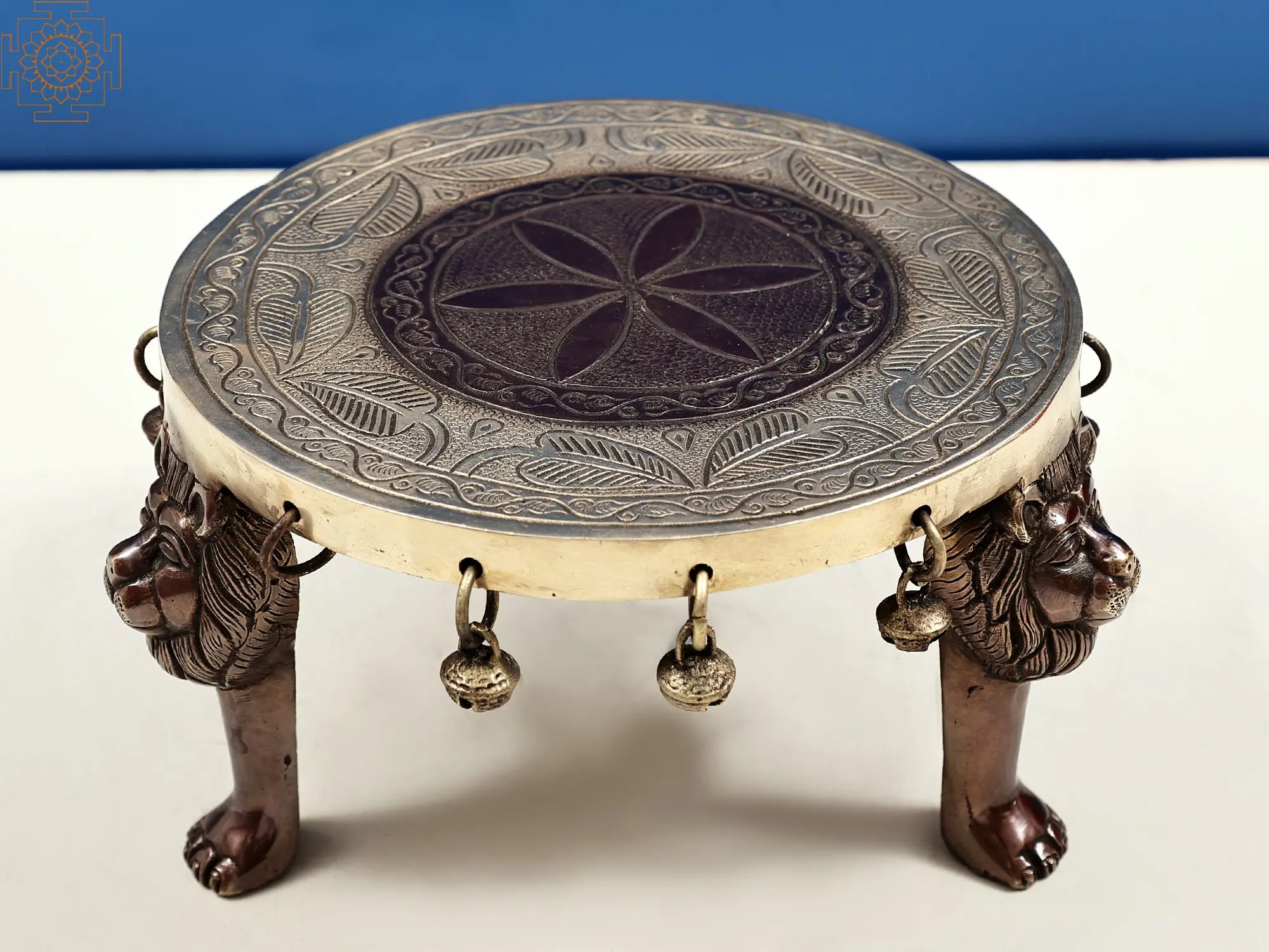 This Small Brass Lion Leg Chowki with Ghungroo is a captivating blend of elegance and tradition. Its intricate lion leg design exudes regal charm and strength. Adorned with ghungroos, the traditional Indian ankle bells, add a musical element to its aesthetic appeal. This chowki serves as a versatile platform for various purposes, from displaying sacred idols to performing rituals.