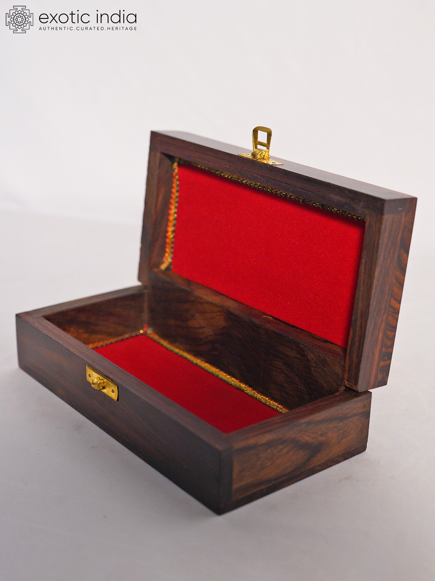 Discover the charm of handcrafted artistry with this exquisitely designed jewelry box. More than just a storage solution, this box is a statement piece, bringing a touch of refined elegance to any space. Made from rich rosewood, the box boasts a depth of color and a natural grain that is both luxurious and warm. Its smooth, polished surface invites touch, making it a pleasure to handle.