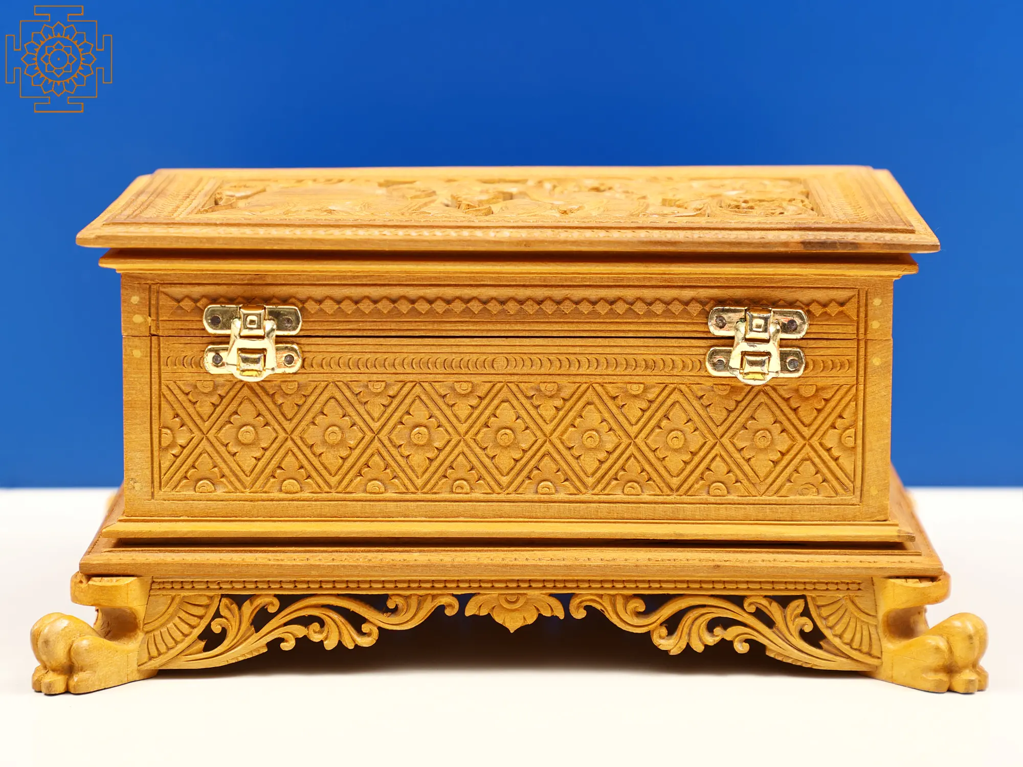 Elevate your home decor and safeguard your cherished treasures with this exquisite wooden decorative box. Meticulously crafted from natural wood, this piece is a testament to skilled artistry and timeless design. The lid is adorned with a captivating hand-carved relief featuring two majestic elephants walking amidst intricate floral and swirling motifs. This detailed carving not only adds a touch of exotic charm but also speaks to a rich tradition of craftsmanship, making each box a unique work of art.