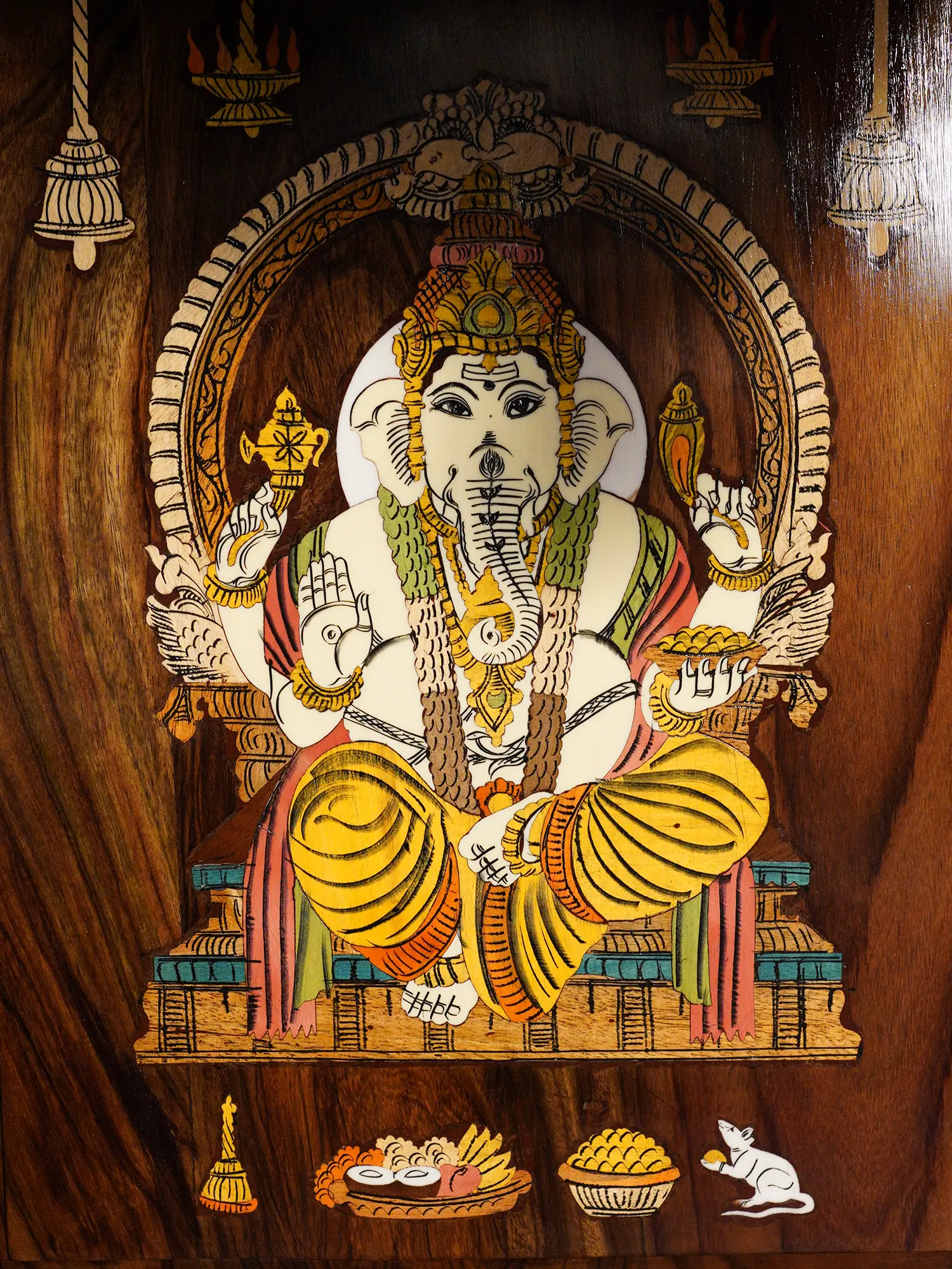 53" Large Designer Wooden Temple with Lord Ganesha Inlay