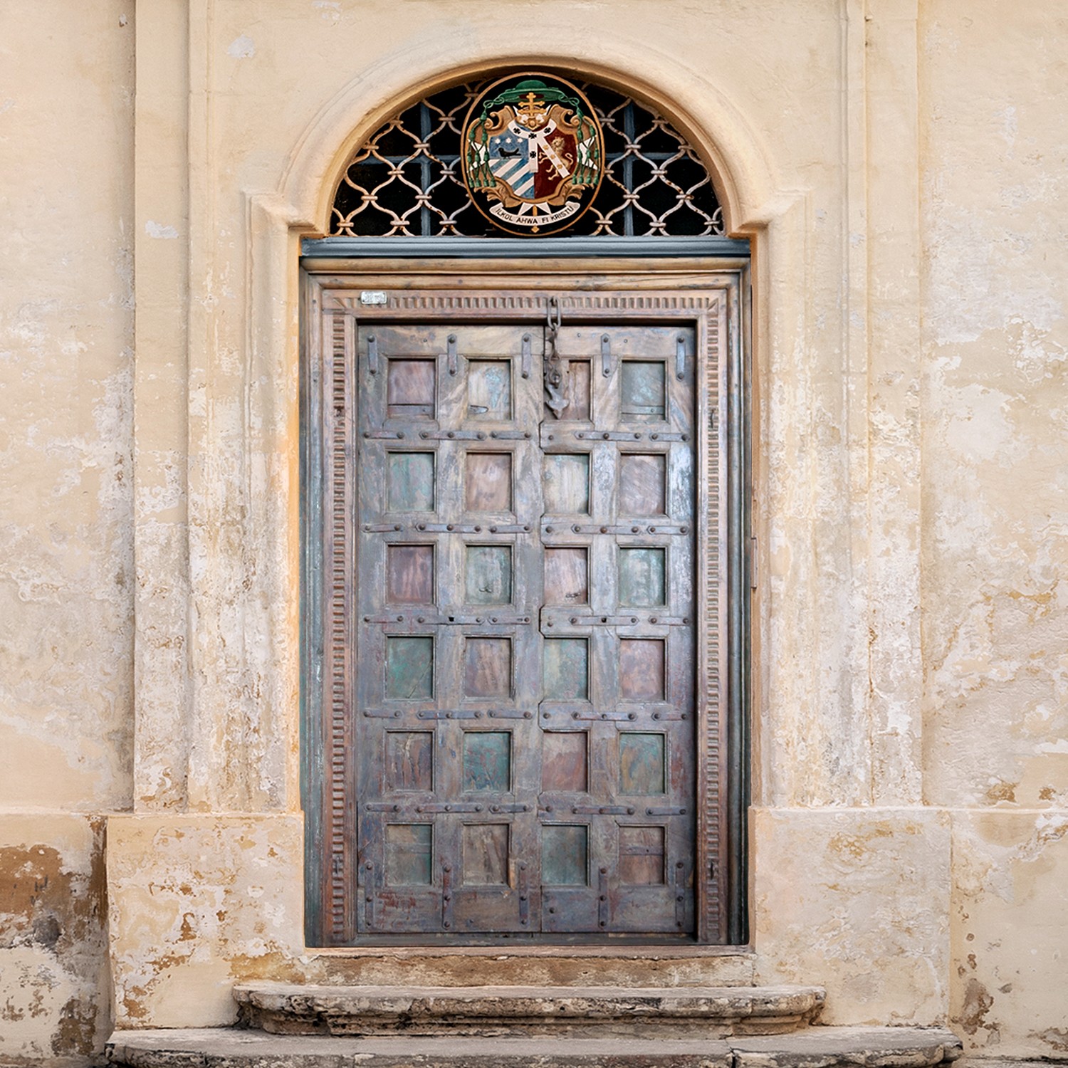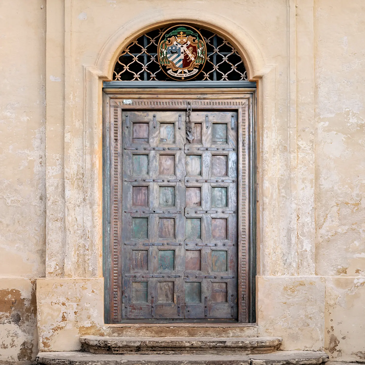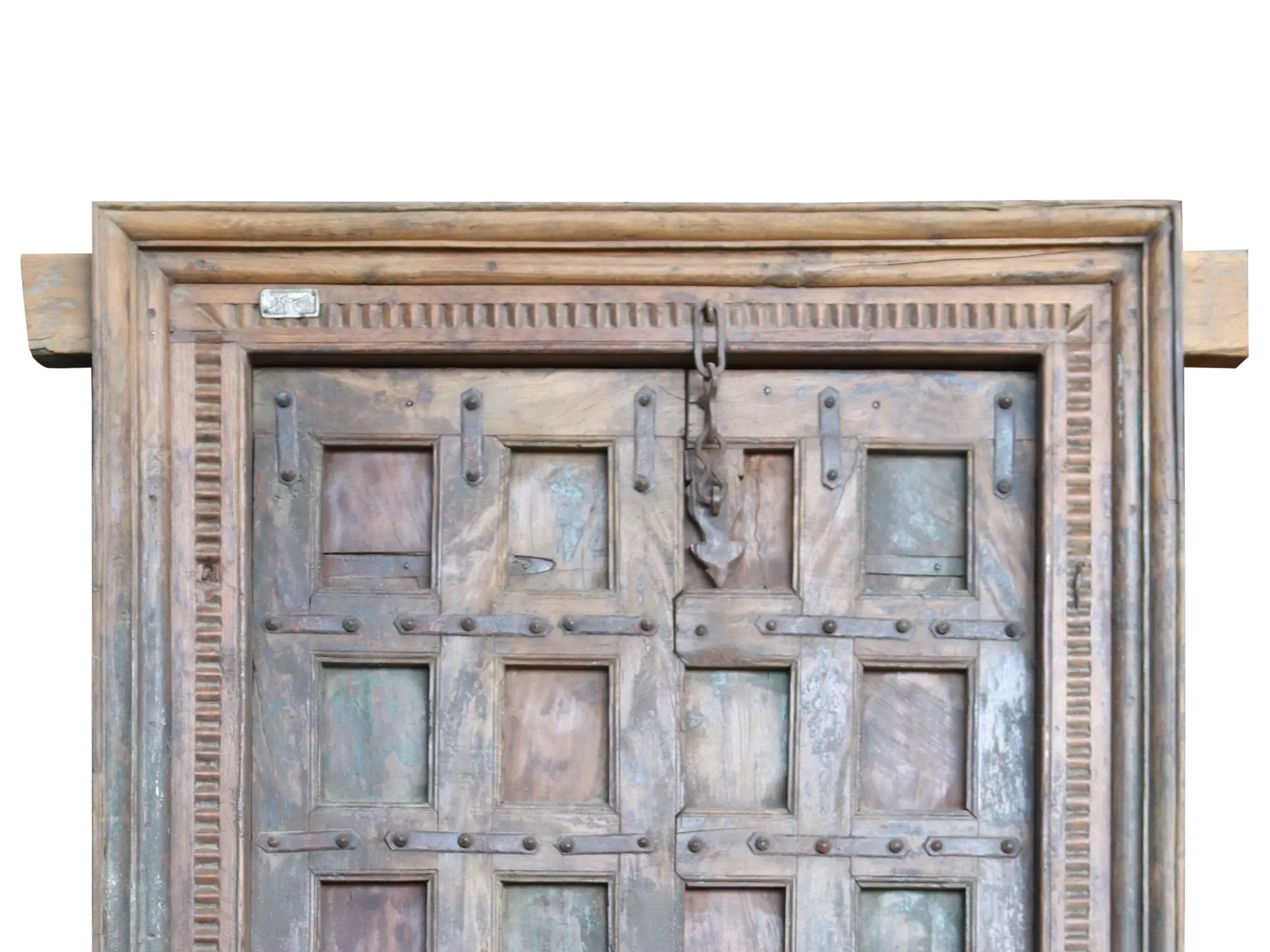 This large wooden door strikes the right balance of style and time, camouflaging into any setting your home is made along - modern, traditional, and fusion. With its precise wide border of basic verticals and horizontals, the front is occupied by 24 blocks with measured nails pinned, giving its style a major geometrical appeal, which is further highlighted by the elegant ombre of colors that make an effortless blend with the pastels of your abode.