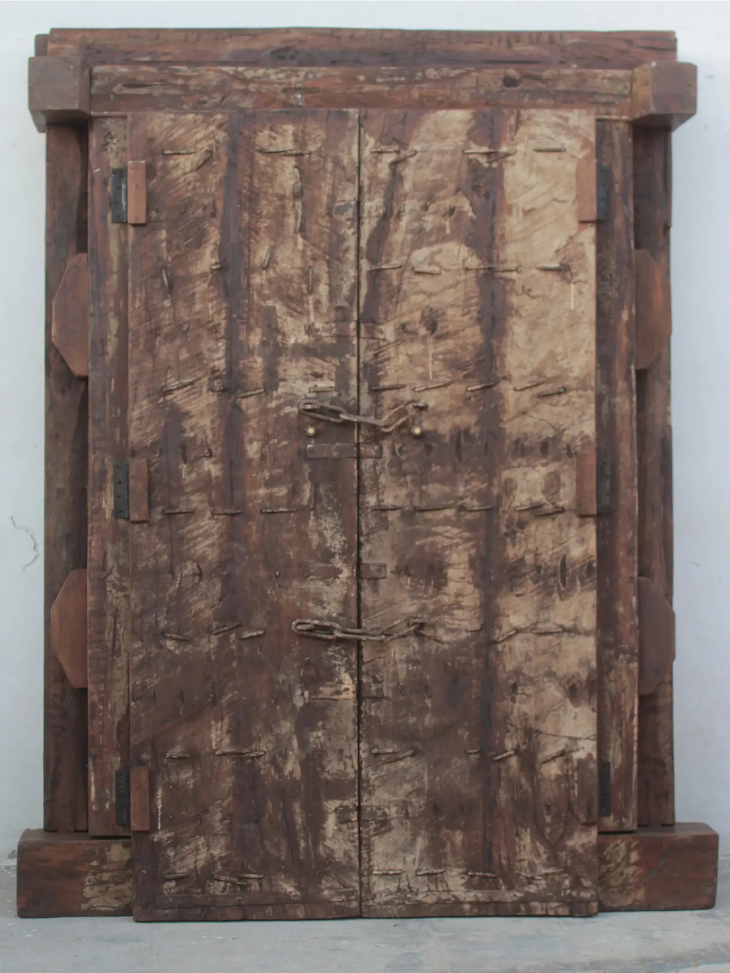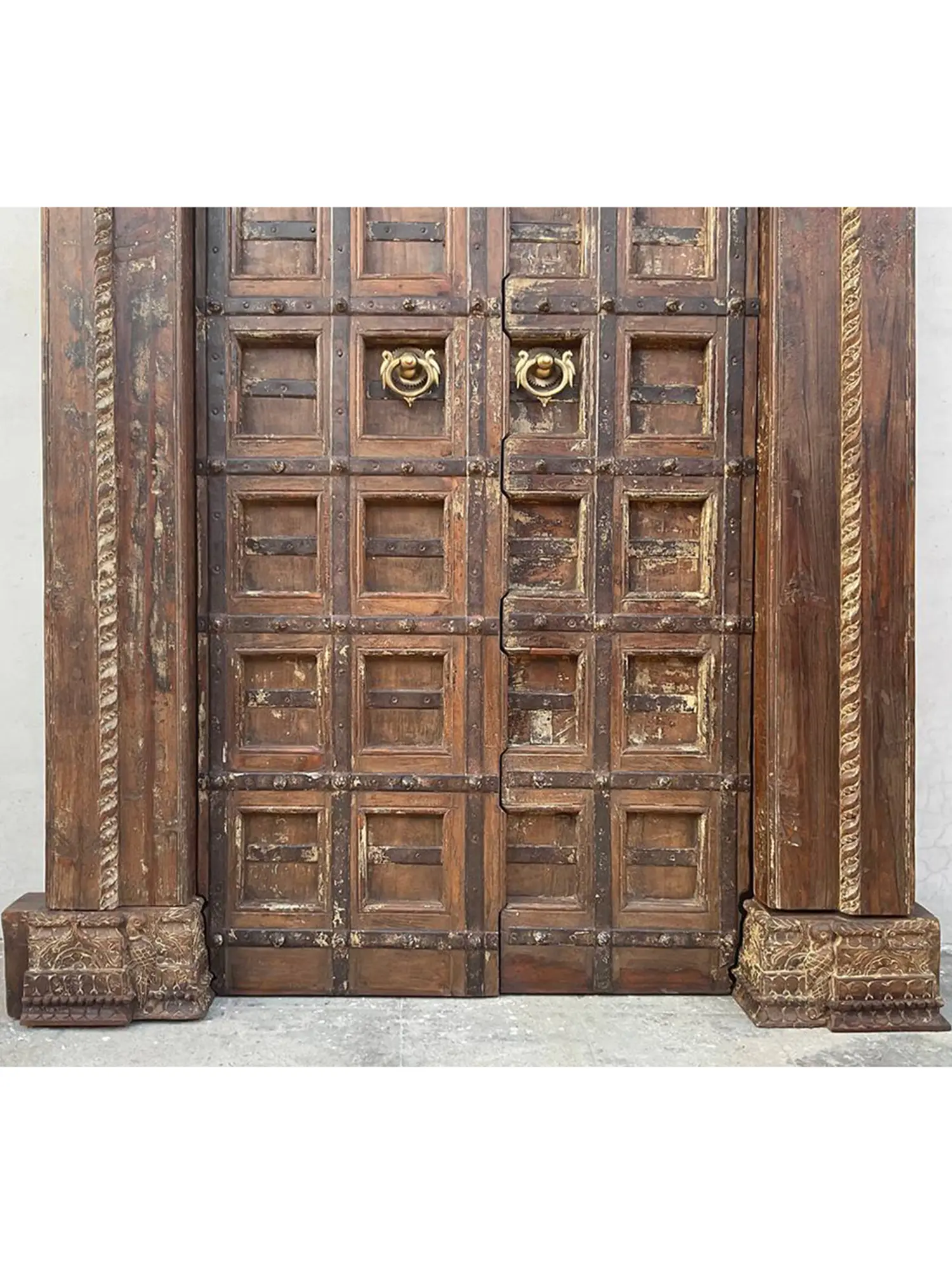 Antique Solid Sal Wood Double Door with Elaborate Hand-Carvings and Frame