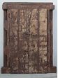 The true beauty of this piece lies in the intricate details that adorn its surface. The top rail is a testament to the skill of master artisans, featuring meticulously carved designs that capture the essence of traditional artistry. Delicate patterns intertwine, creating a visual feast that invites closer inspection. Each panel within the door itself is thoughtfully designed, showcasing a grid pattern that adds depth and dimension. Embellishments punctuate the wood, adding visual complexity. The worn and aged finish enhances the overall texture and contributes to the door's authentic antique appeal. This door is complete with metal rings, adding an authentic touch and a hint of rustic charm. These striking details set this piece apart, making it a true work of art.