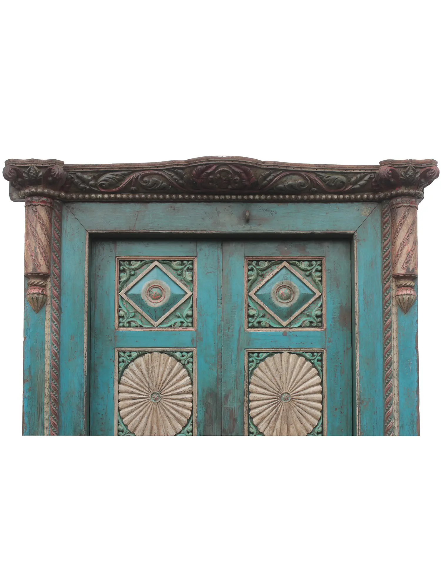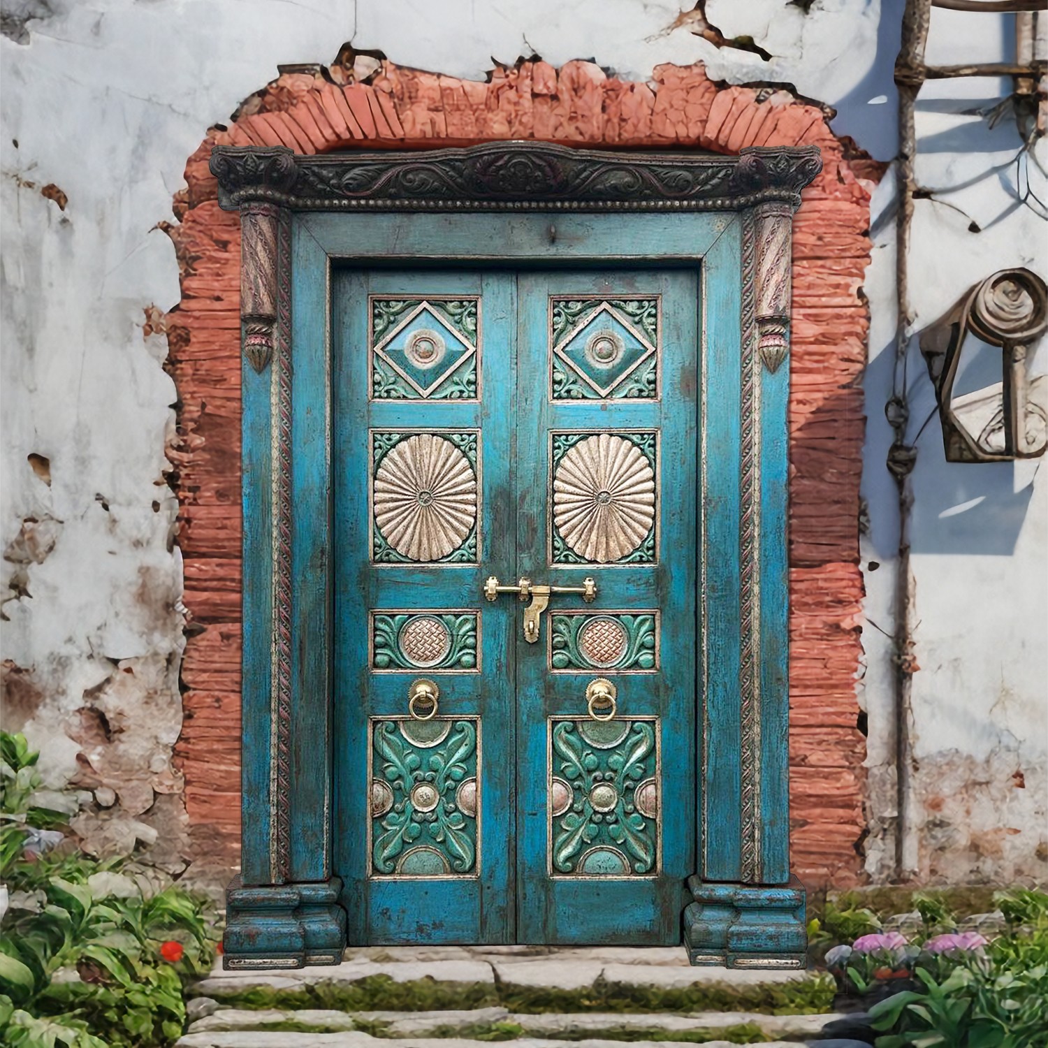 The captivating teal hue, gracefully aged and weathered, evokes the timeless beauty of handcrafted pieces. The intricate carvings, rendered in soft, contrasting shades, highlight the door's ornate detail, while its rustic finish creates a sense of warmth and authenticity. Imagine this door as a bold statement piece in a modern loft, or as a harmonious addition to a bohemian-inspired space. The aged details bring a sense of history, while the color allows it to blend seamlessly with contemporary décor. The solid construction and thoughtful design make it not just a visually stunning piece, but a lasting investment in your home's aesthetic.