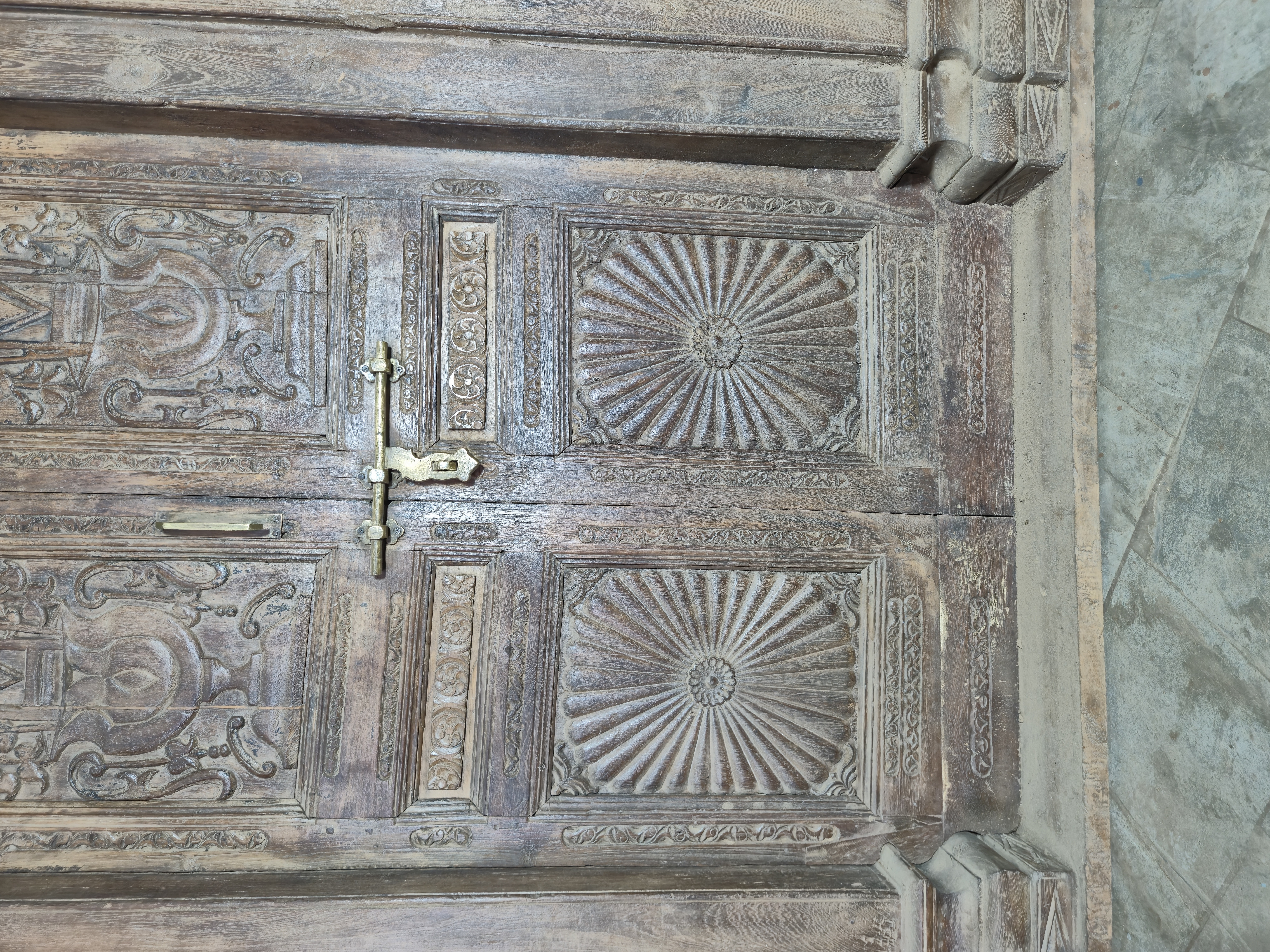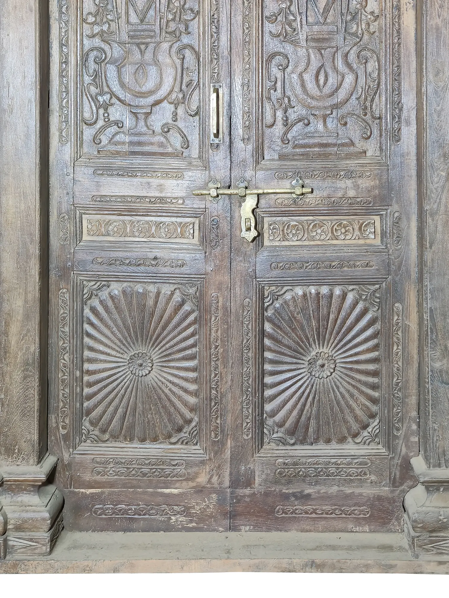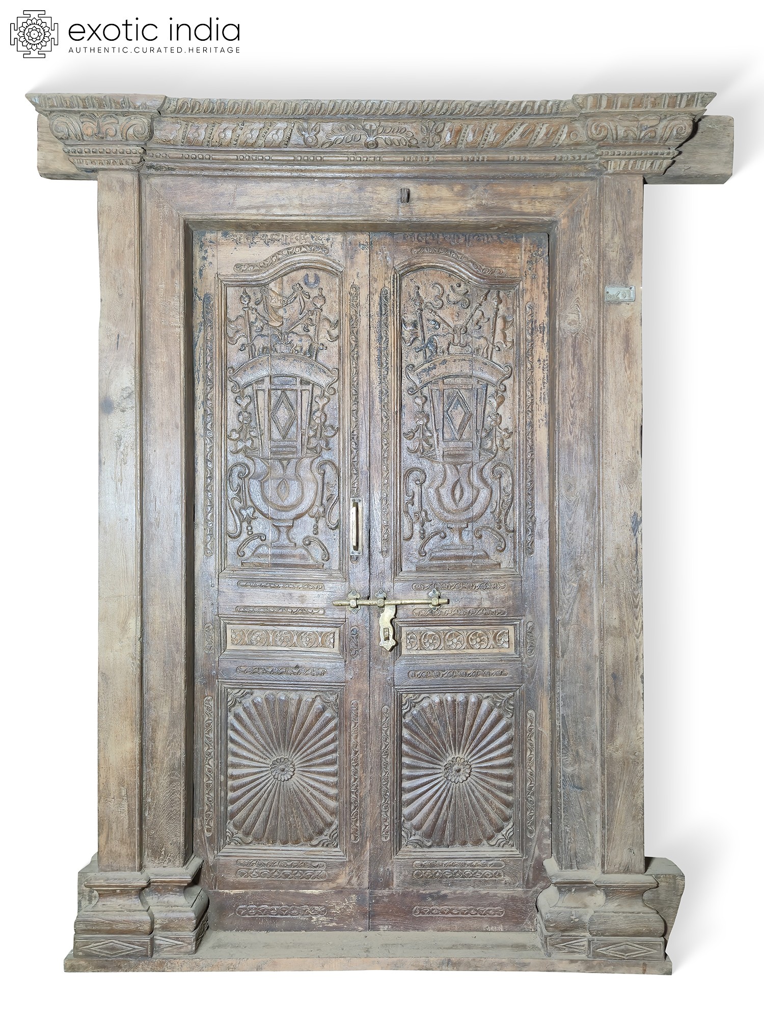 The true magic of this door lies in its elaborate carvings. The twin panels are adorned with a symphony of motifs. Delicate floral patterns interlace with geometric designs, creating a visual feast for the eyes. At the heart of each door panel, a stylized lantern-like motif is intricately rendered, surrounded by flowing ornamental elements. Below this, sunburst patterns radiate outwards, further enhancing the door's visual depth and artistic appeal. The meticulous hand-carving ensures that no two pieces are exactly alike, offering you a truly unique treasure. The aged wood itself, with its natural grains and subtle imperfections, adds to its rustic allure, hinting at the many years and lives it has witnessed.