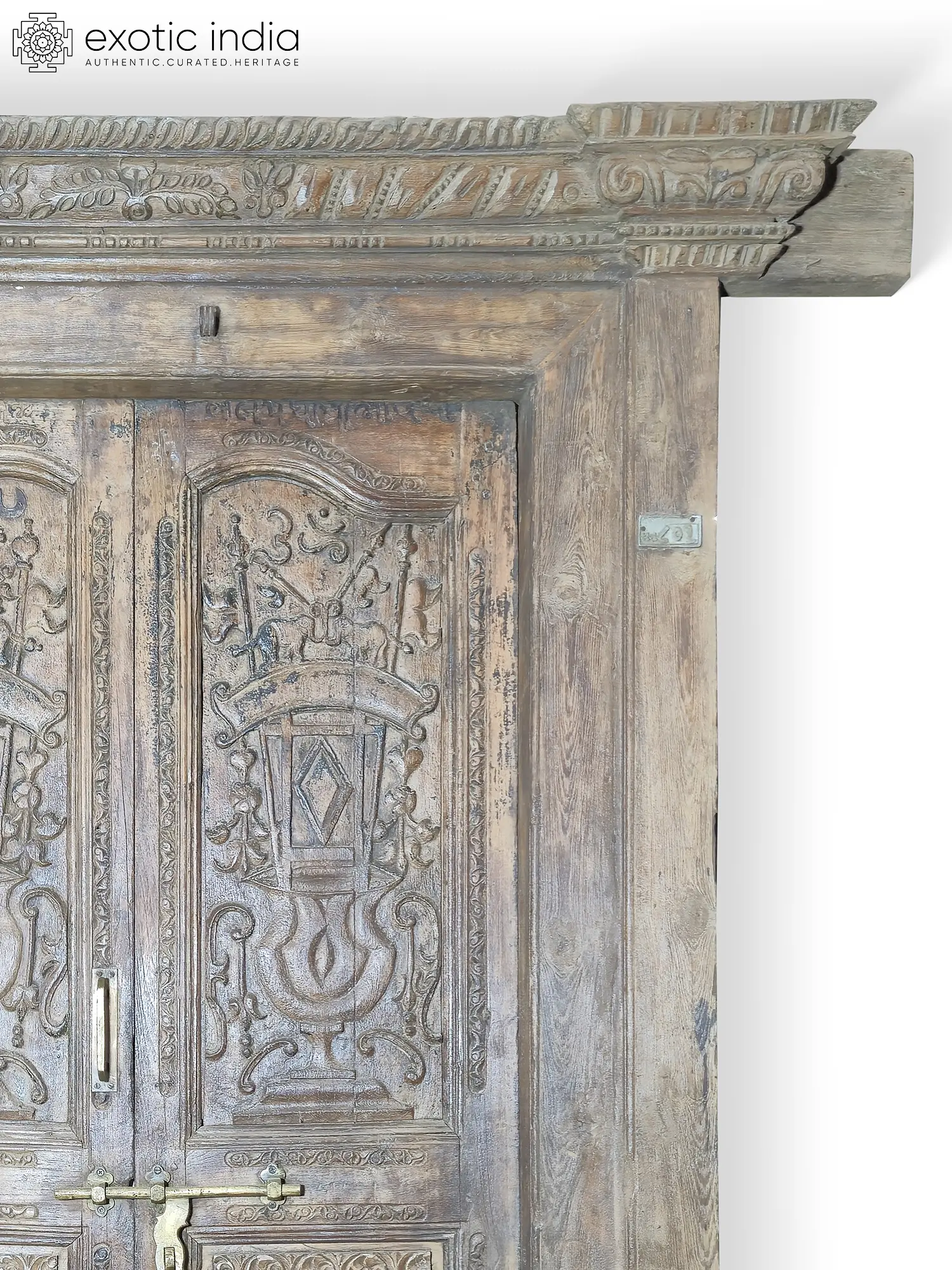 Step into a world of heritage and artistry with this magnificent hand-carved wooden door. More than just an entrance, it is a statement piece, a testament to the rich traditions of Indian craftsmanship. Each intricate detail whispers stories of skilled artisans and generations of dedication, transforming this piece from mere wood into a captivating work of art. Its vintage aesthetic evokes a sense of history and authenticity, promising to add unparalleled character and charm to any space.