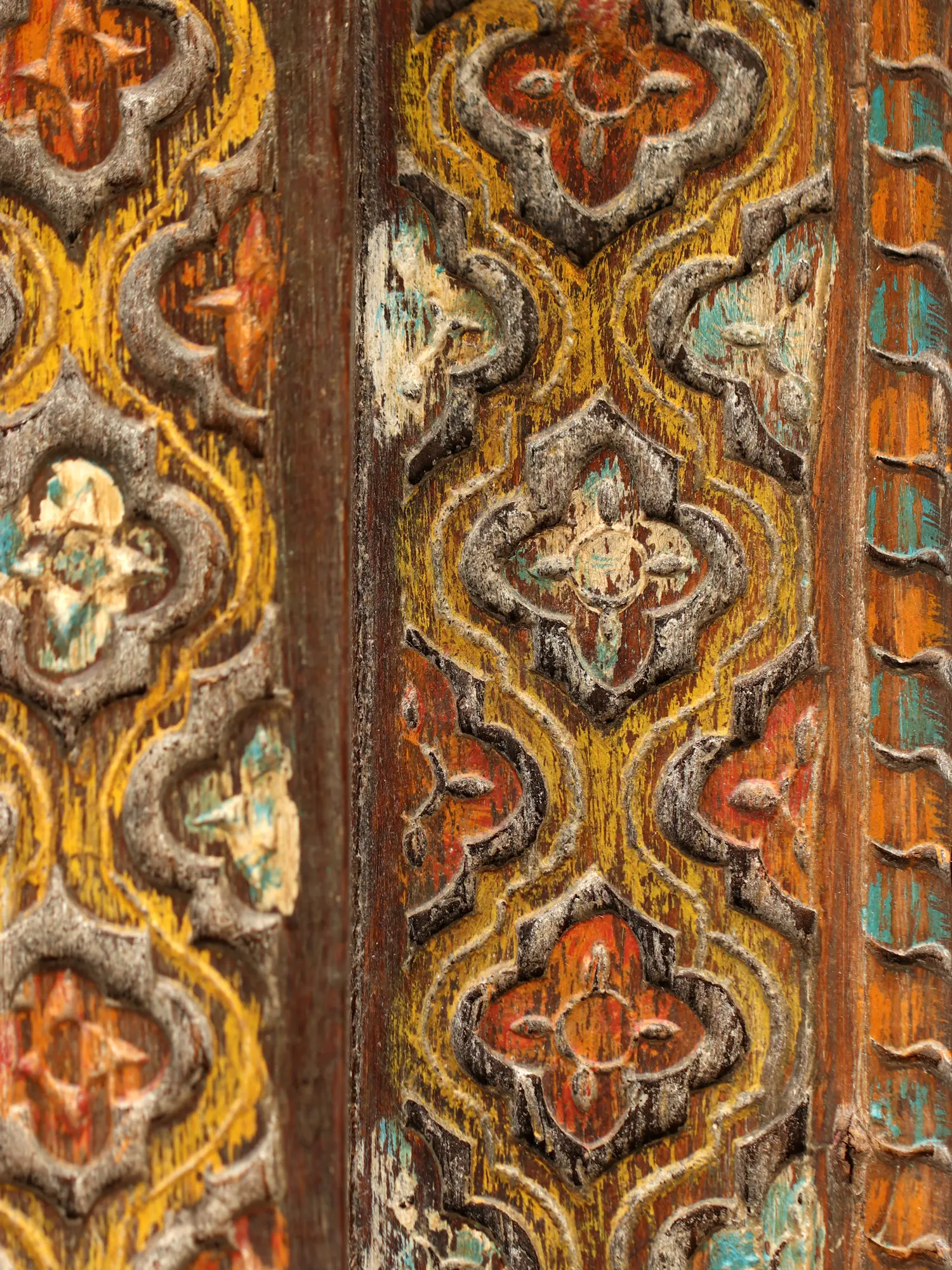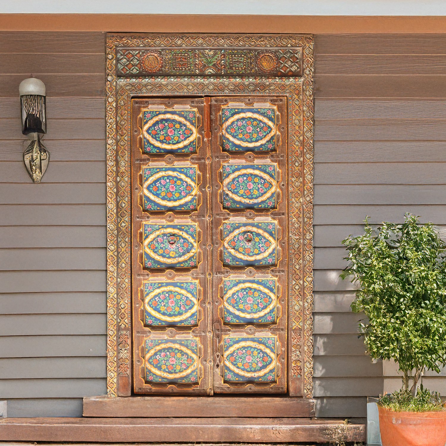 This vintage entrance door is a magnificent masterpiece that will make your home a landmark in the neighborhood and will attract the eyes of visitors. It is made of sturdy wood that will last many years. Exquisitely decorated with traditional motifs and patterns, this large door comes with a broad wooden frame having intricate carvings. The main door has squared panels that add another element of traditional look to it. Inside the panels, gorgeous floral designs have been hand-painted with vibrant colors that look extremely attractive. The carvings on the wooden frame have also been painted making the entrance of your home look elegant.