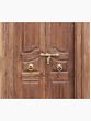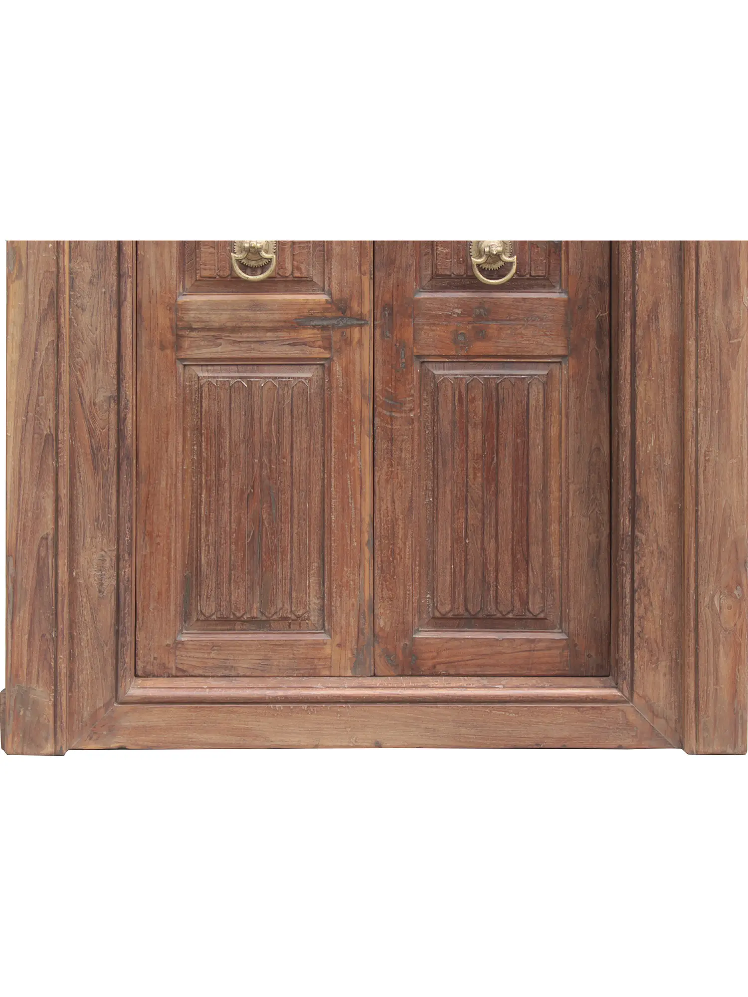 This impressive piece is more than just aesthetically pleasing; it's a tangible connection to the past. While its sturdy construction suggests its suitability as an exterior door, it could also be repurposed as a stunning interior feature. Imagine this as an impactful statement separating a grand living room from a formal dining area, or as an inspired entry to a library or study. The door retains its original hardware, including lion-head handles, adding to its authenticity and unique character. The aged patina of the metalwork provides a delightful contrast to the warm wood tones, creating a visually captivating and historically relevant piece. Imperfections, slight variations in color, and traces of wear are not flaws but rather hallmarks of its history, adding depth and soul to its aesthetic. This door embodies the essence of reclaimed beauty, where the passage of time has only enhanced its intrinsic allure. Bring a touch of historical grandeur and artistic flair to your home with this magnificent piece. It is certain to become a cherished focal point, sparking conversation and inspiring admiration for generations to come.
