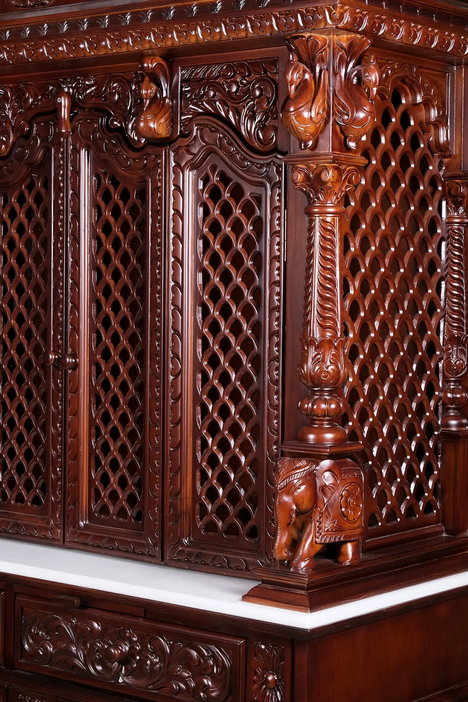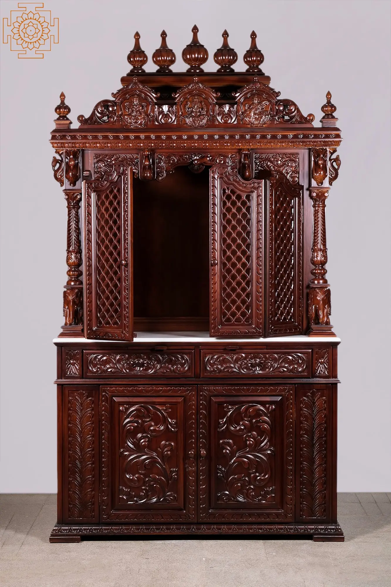 This temple is defined by its intricate detailing and thoughtfully designed functionality. The hand-carved floral motifs that adorn the doors and panels showcase a level of craftsmanship rarely found. The doors themselves, featuring delicate latticework, allow for glimpses of the sacred space within, while also providing the option for privacy and contemplation. Below the sanctum, spacious drawers offer practical storage for prayer books, incense, and other essential items, keeping your worship area organized and clutter-free. The elevated platform provides a graceful stage for deities and sacred objects. The crowning glory of the temple is its ornate top, featuring a series of decorative spires and intricately carved figures that draw the eye upward, towards the heavens.