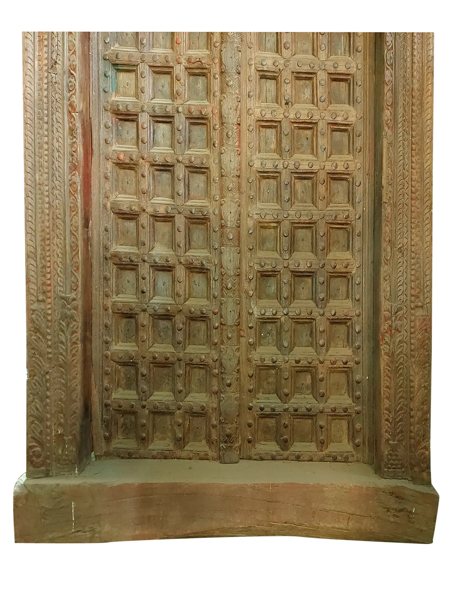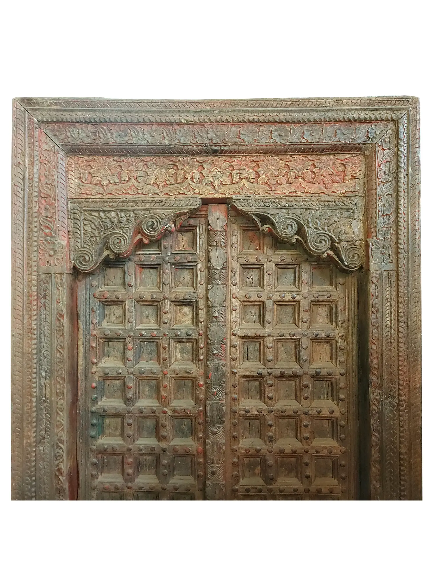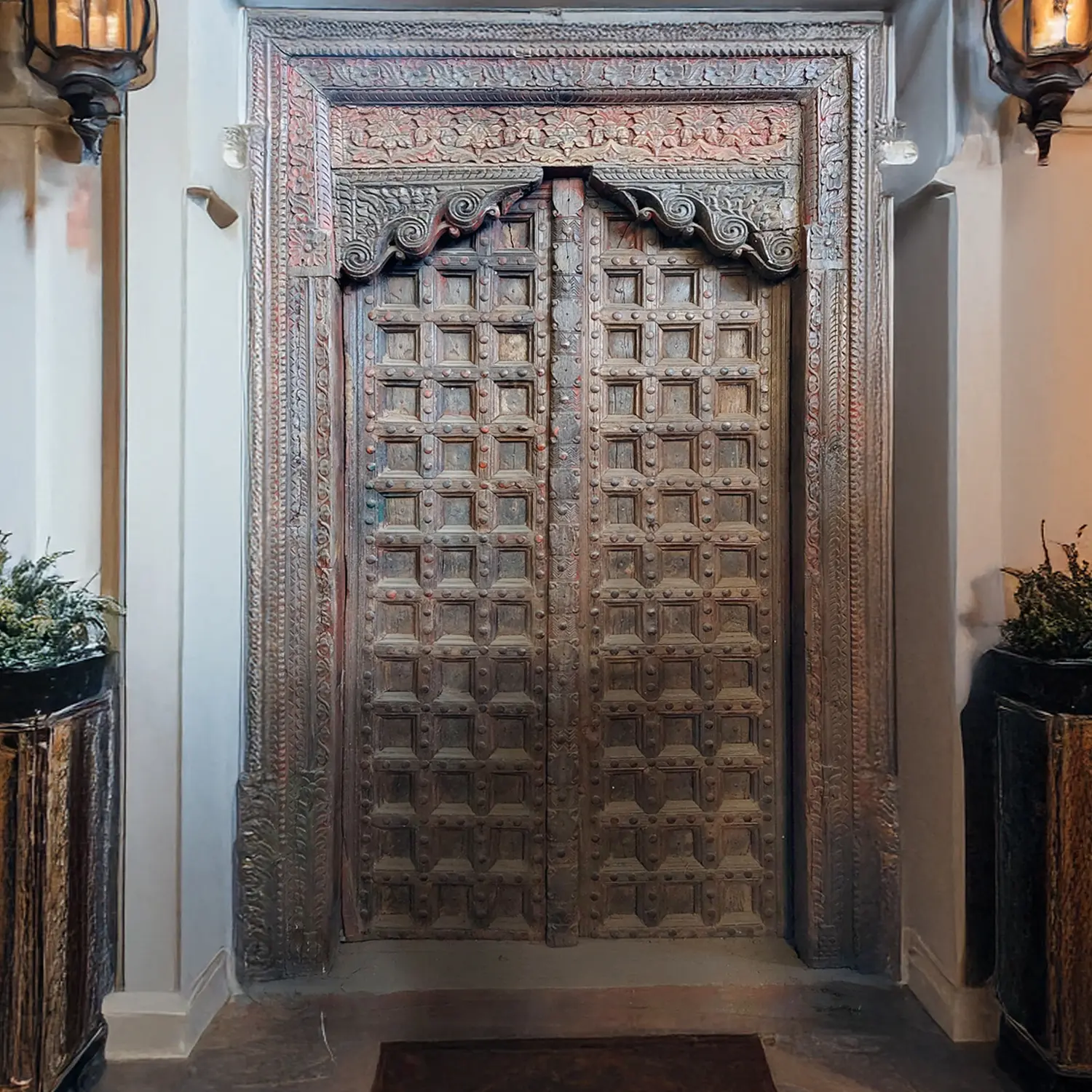78" Floral Hand Carved And Block Design Wood Door With Vintage Style Knock
