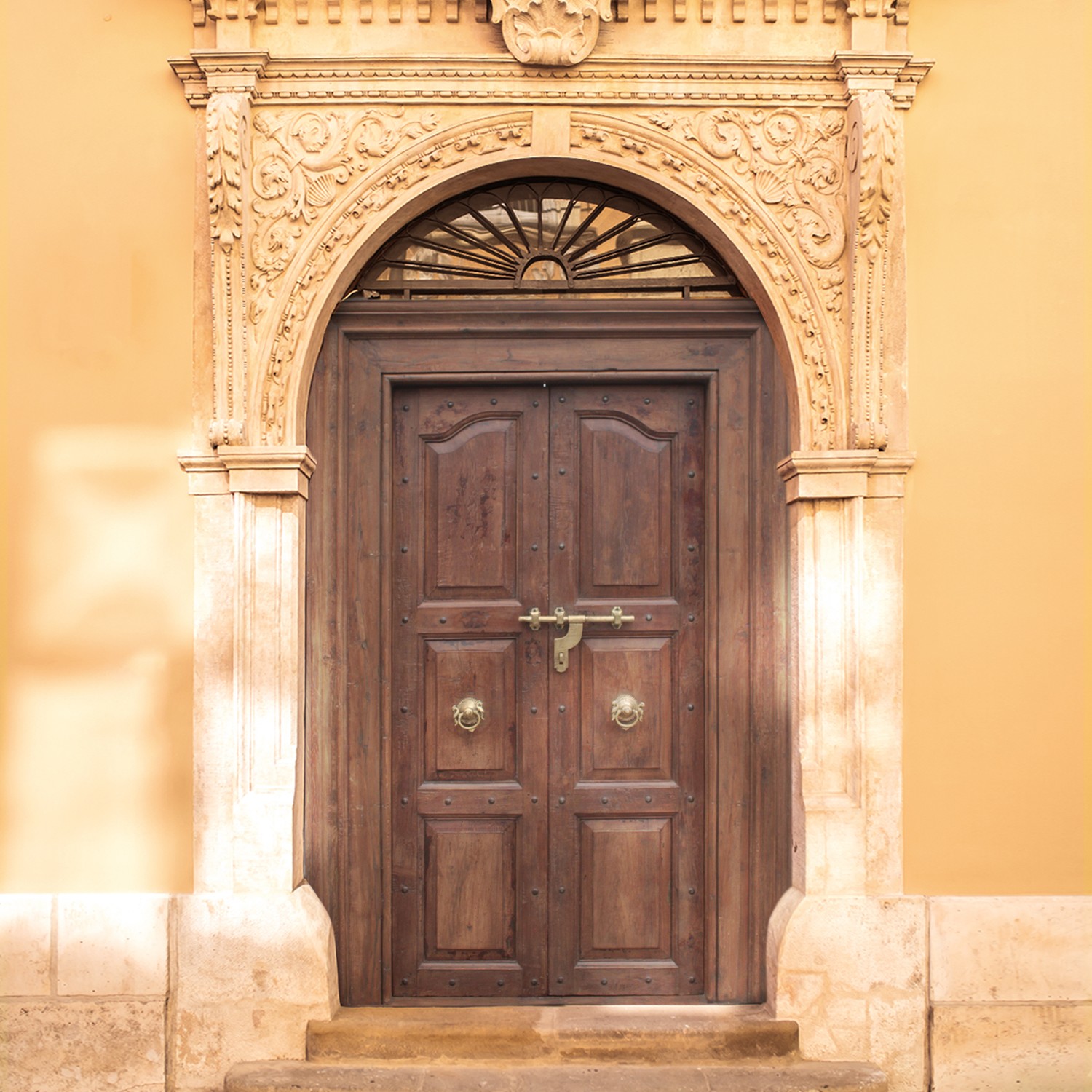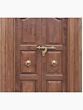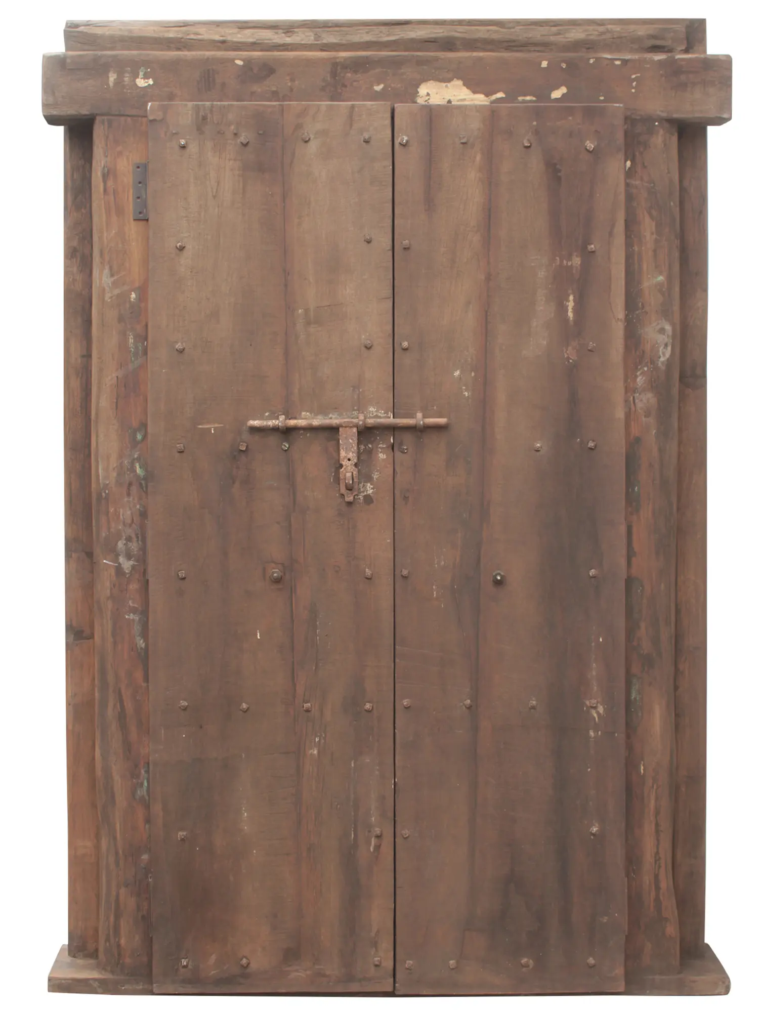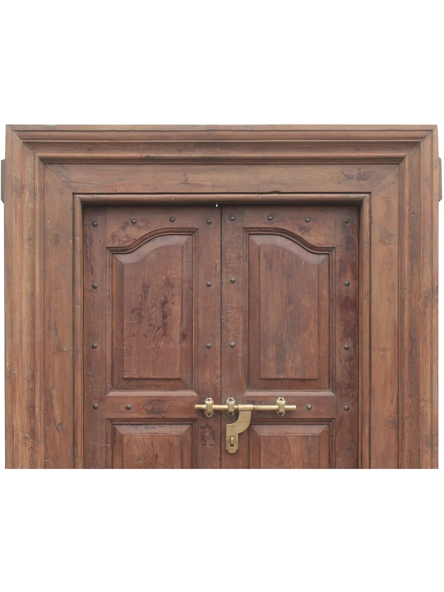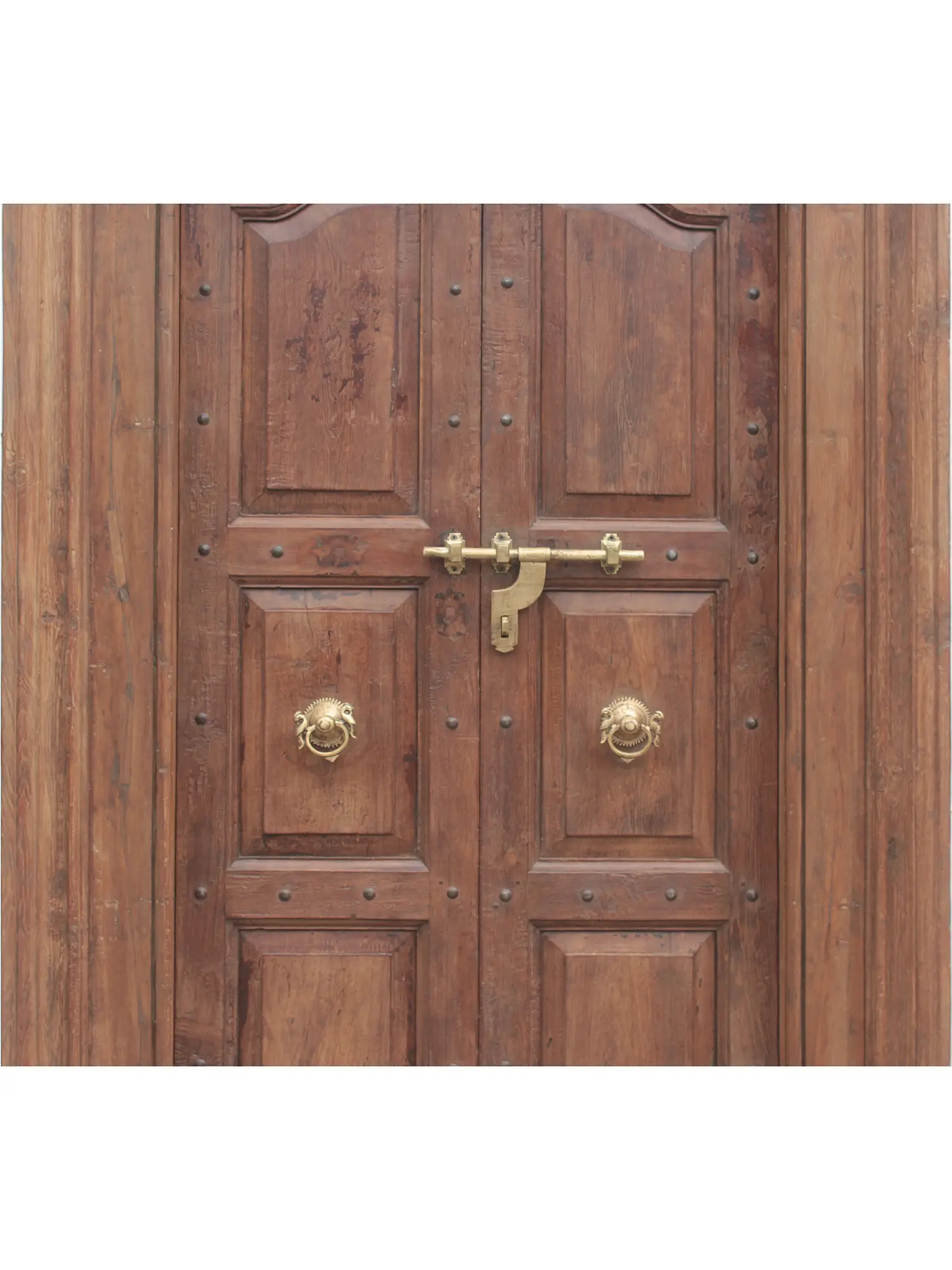 Notice the subtle details that set this door apart. Rows of decorative studs add a touch of rustic charm while emphasizing the solid construction. The twin door design creates a sense of symmetry and grandeur. A durable slide bolt, complete with mounting hardware, ensures security and ease of use. The intricate and elaborately cast door-knocker pulls, each adorned with a distinctive lion design, serve as functional art, inviting you to reach out and announce your arrival. The raised panel design creates texture and a rich interplay of light and shadow. Each panel is precisely crafted, adding depth and dimension to the overall design. The substantial frame provides the perfect complement to the door itself, creating a seamless and harmonious aesthetic. This door is a testament to the enduring beauty of traditional design.