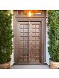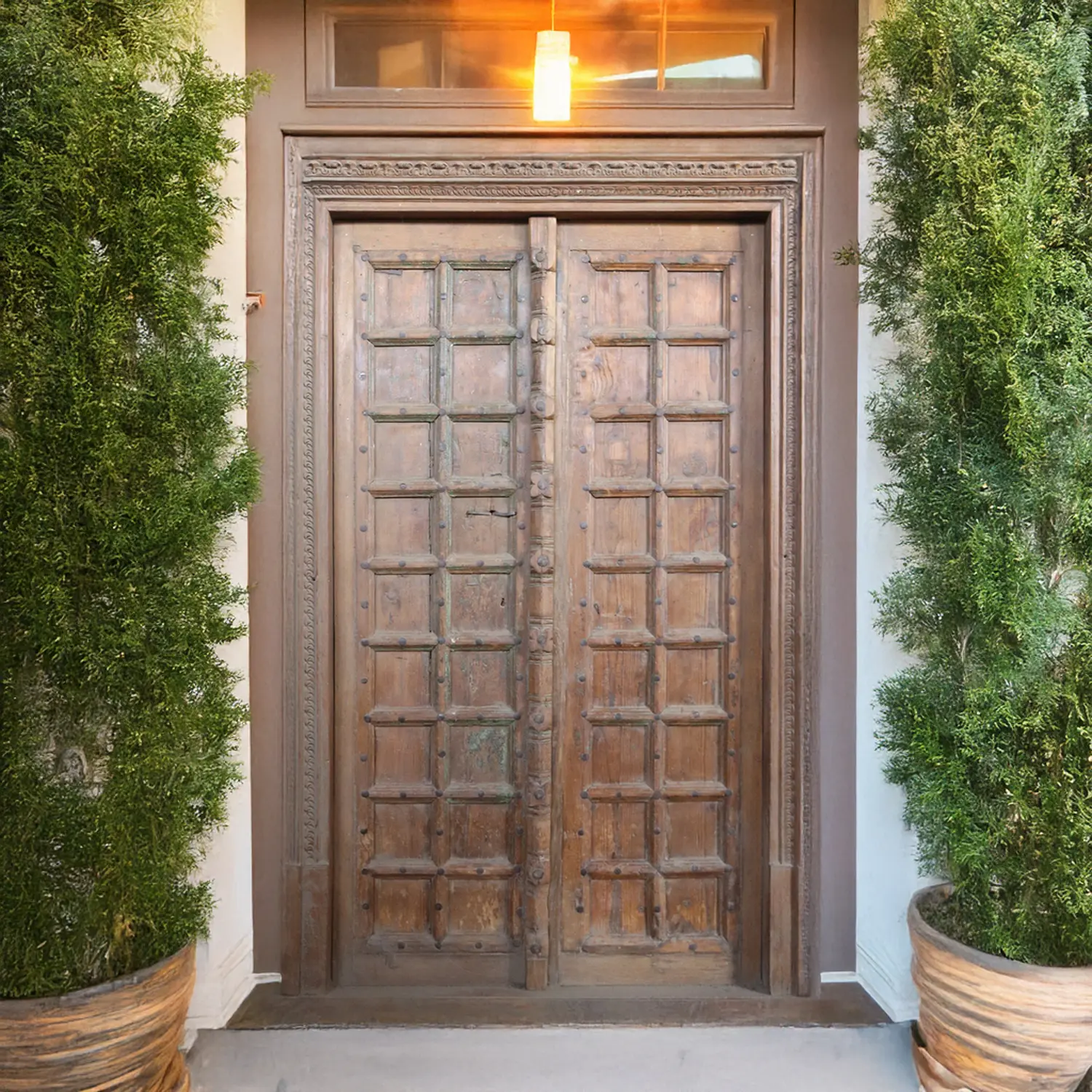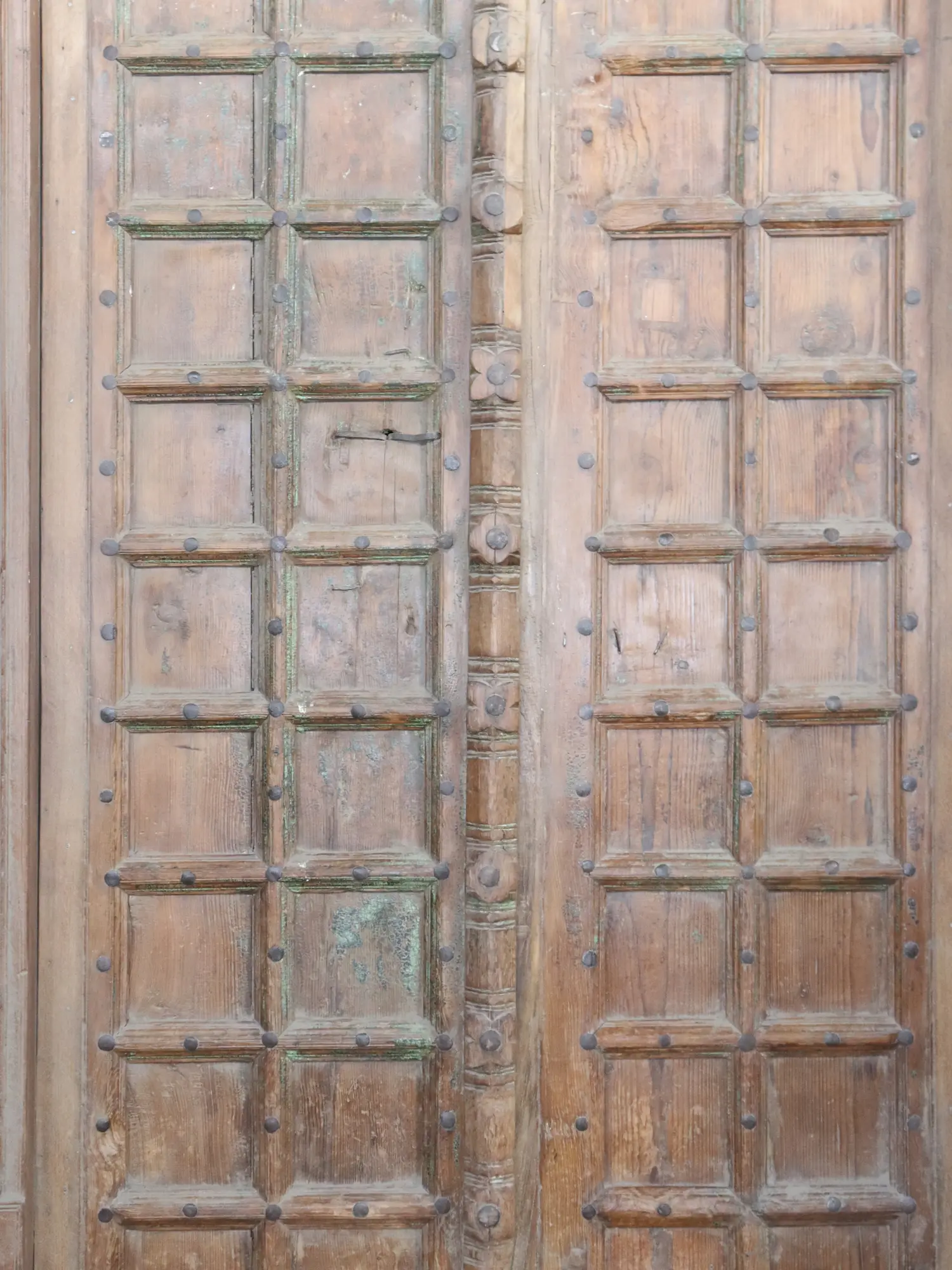 Strong wooden doors have been a necessity for humans since time immemorial because they provide protection and comfort to the inhabitants. This modest wooden vintage door is made up of several components. The outer panel, which is separated into three sections, displays fine craftsmanship. The end section has superb flower petal designs, while the middle section has mesmerising Nagavallli floral patterns. The final panel is also adorned with beautiful flower designs. Square panels embellished with tiny metal dots provide a touch of refinement to the middle section. The beautifully carved flowers with worn accents on the cylindrical central rim are a monument to the creativity, offering the door a characteristic vintage appearance.