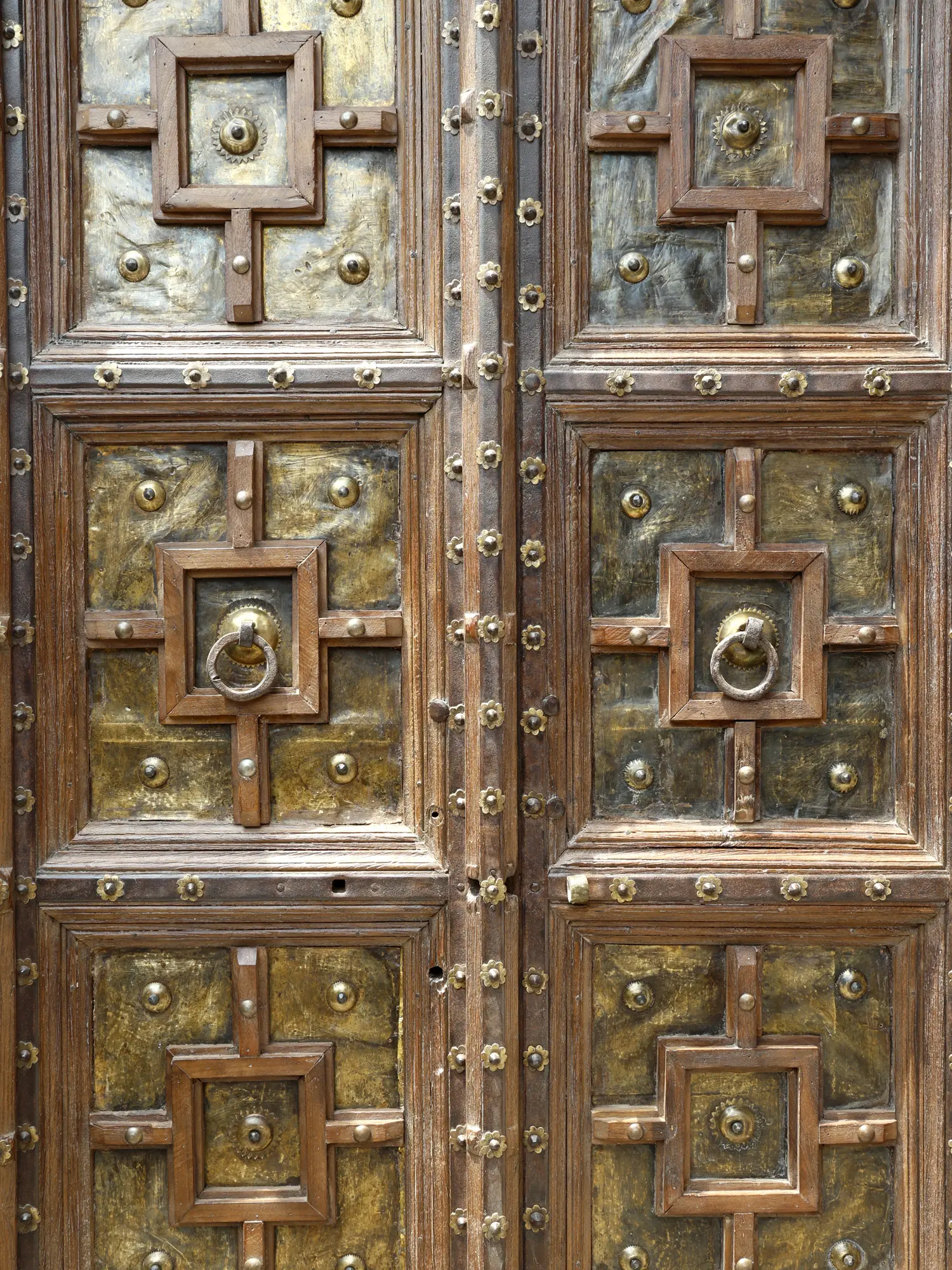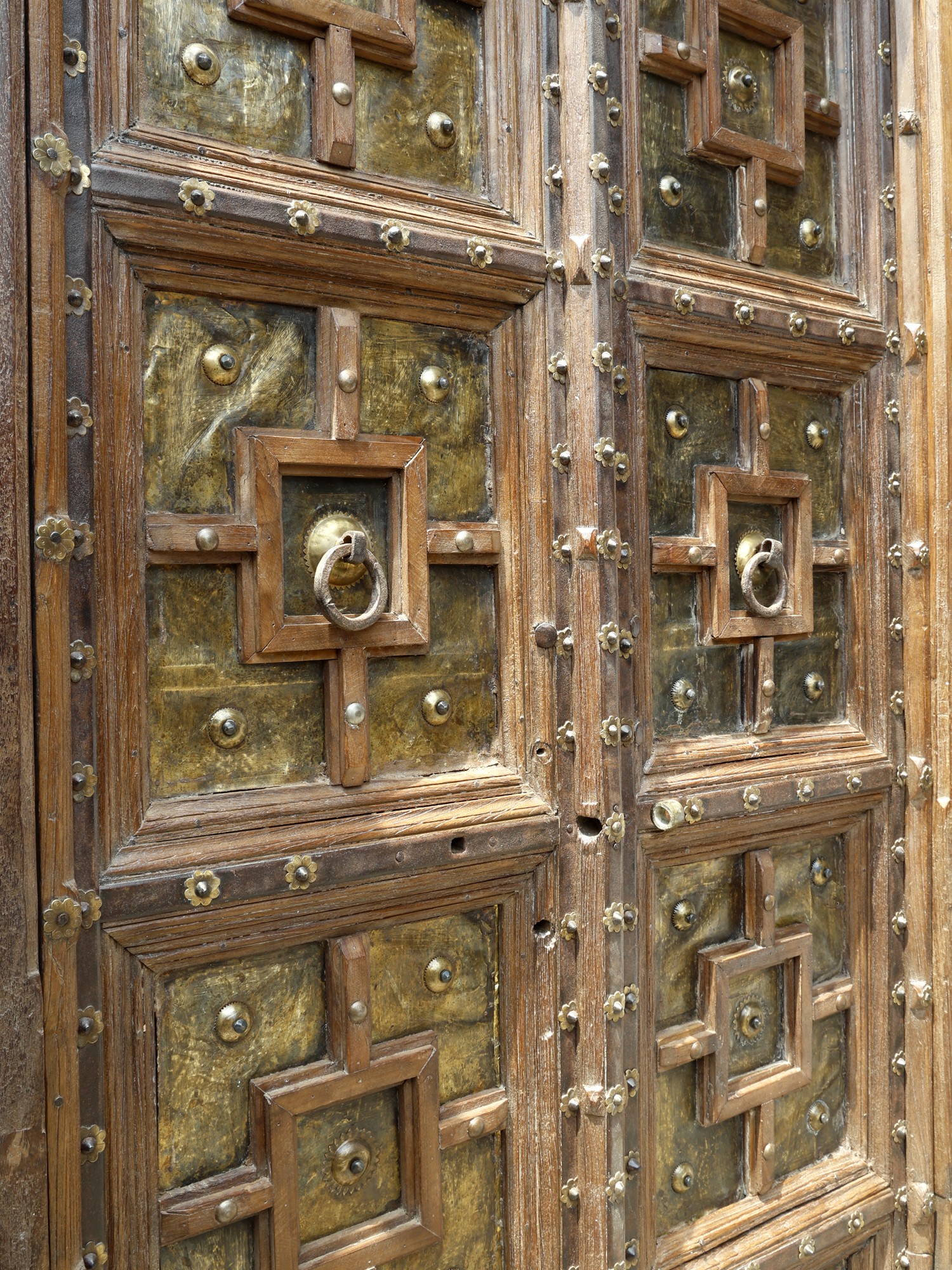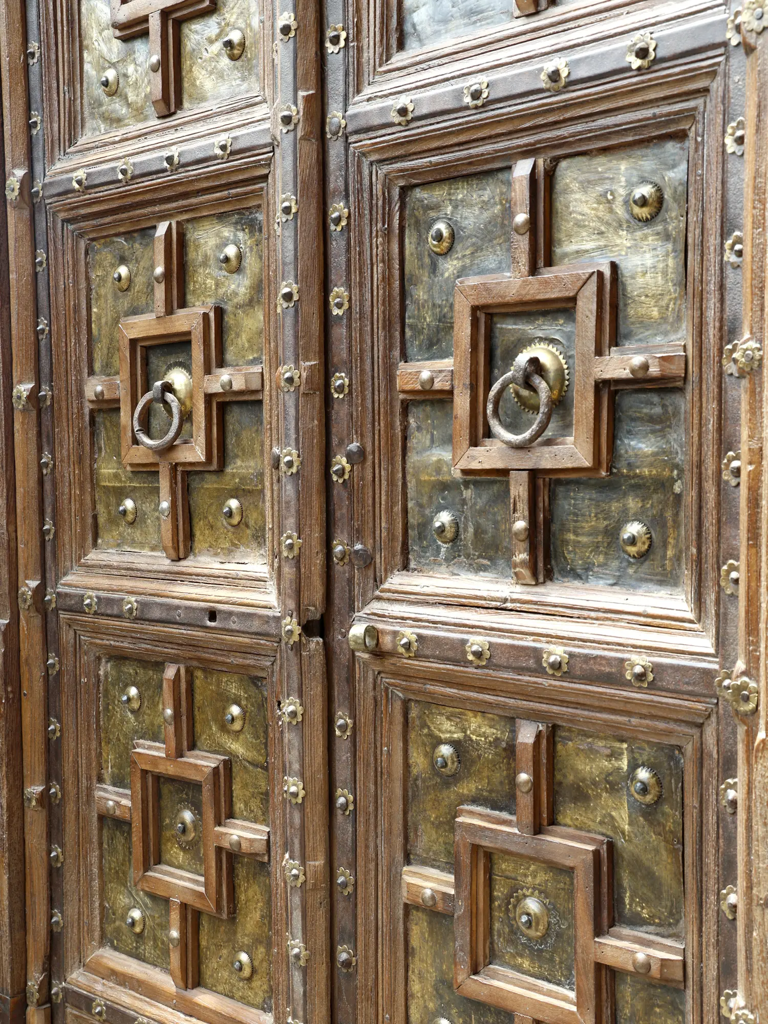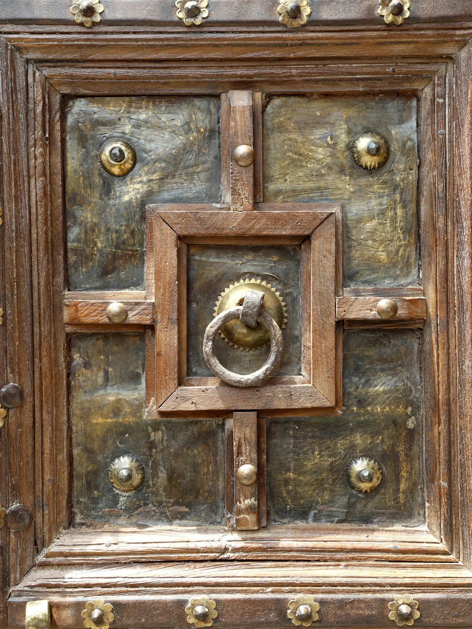 The brass and ironwork add to the aesthetic appeal and also enhance the door's durability. Brass, being corrosion-resistant, acts as the first line of defense against weathering, making the wooden door more resilient and long-lasting.
