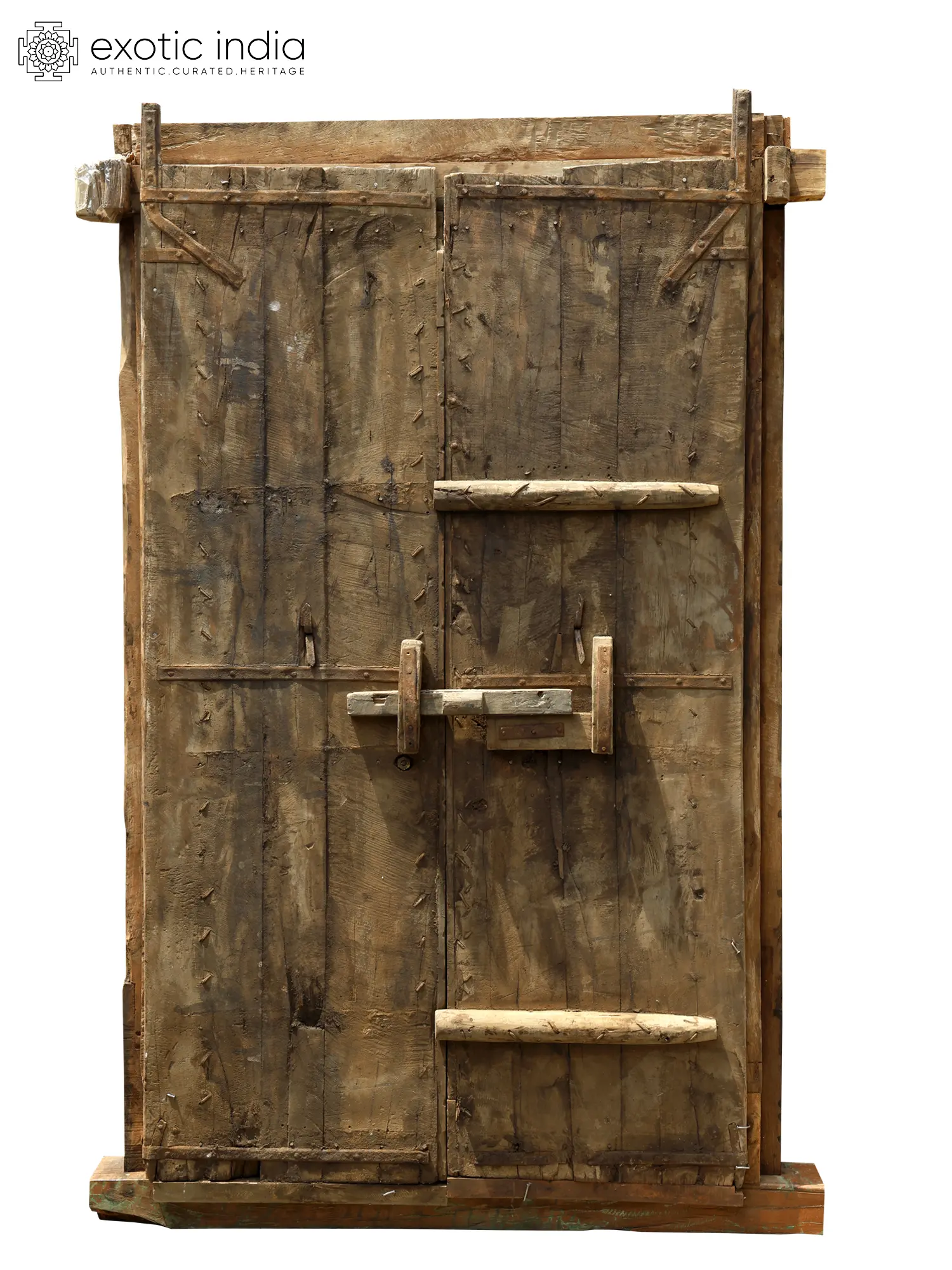 This Large Vintage Indian Door with Brass and ironwork is a stunning example of traditional craftsmanship fused with durability and elegance. Metal sheets, particularly brass and iron, have been intricately used to adorn this wooden door, creating a visually striking and resilient piece of art.