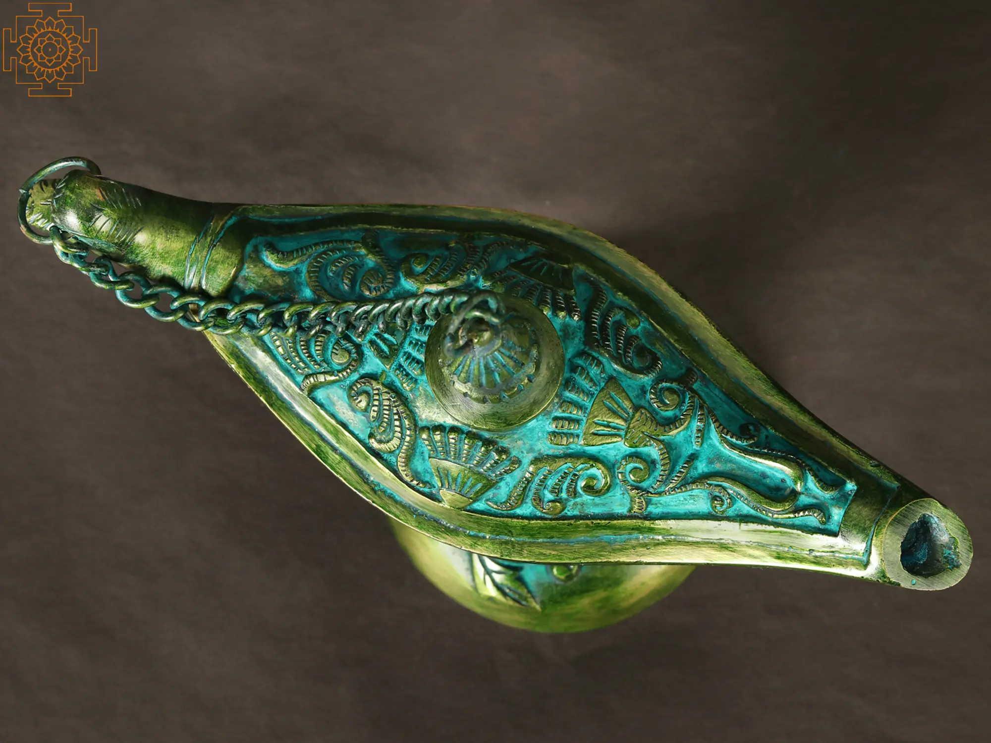 This Aladin Magic Chiraag in Brass is Home Decor and is a spellbinding masterpiece that seems to have emerged from the enchanting tales of Arabian Nights. The lamp's light blue patina tint lends it an otherworldly allure, evoking the magical ambiance of Aladdin's adventures. Intricately crafted in the iconic Aladdin lamp design, it feels as if a genie might emerge from the exquisite carvings that adorn its surface.