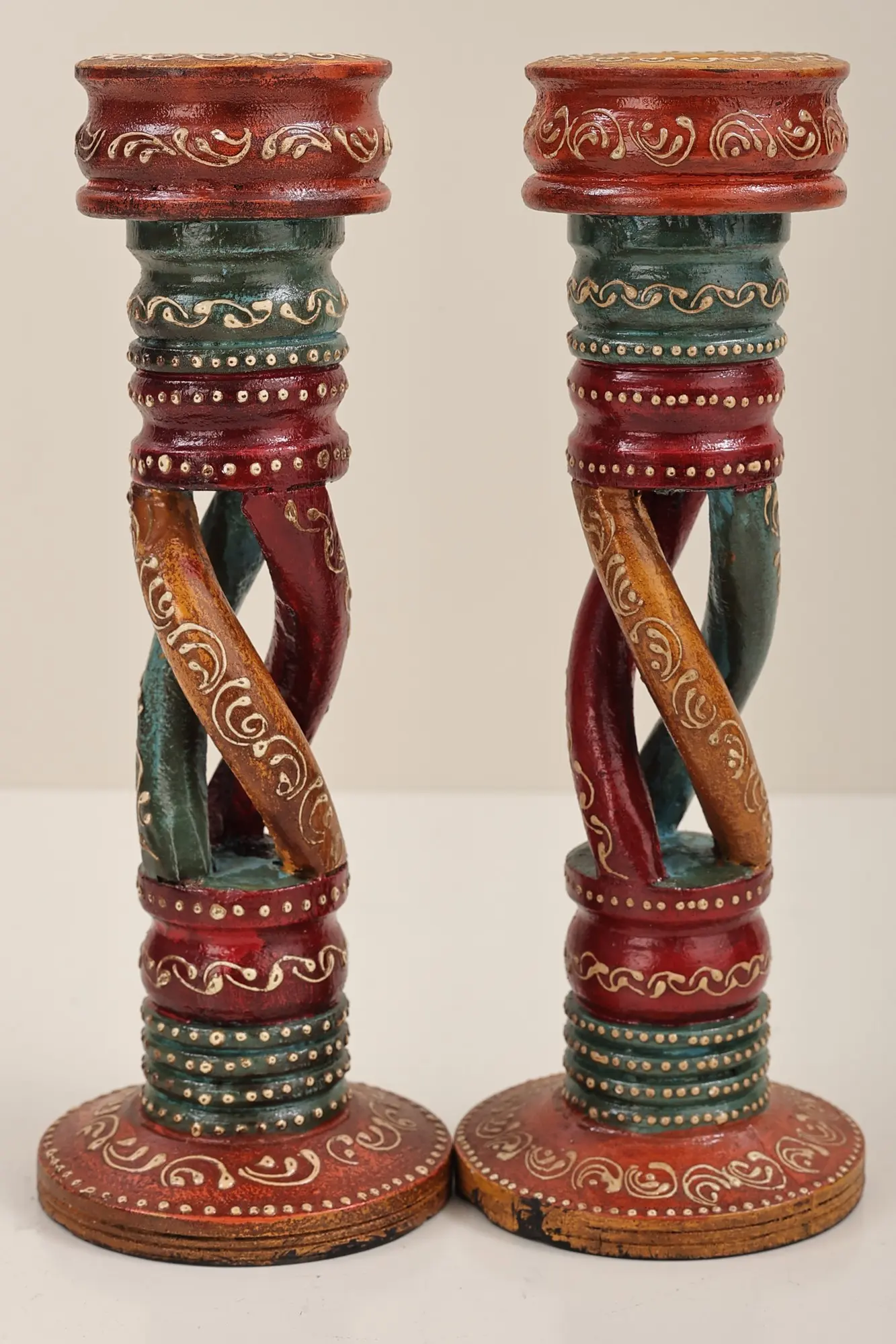 Crafted from mango wood, known for its durability and beautiful grain, each candle stand is unique. The careful attention to detail is evident in the hand-painted motifs that adorn every surface. From the swirling designs around the base to the intricate patterns near the candle holder itself, each element tells a story of tradition and skill. The contrasting colors create a visually appealing contrast, adding depth and character to the overall design. The twisted design that makes the stem of each candle stand is particularly interesting and highlights the handmade quality of each piece. These stands are not simply mass-produced; they are carefully crafted objects made with care and precision.