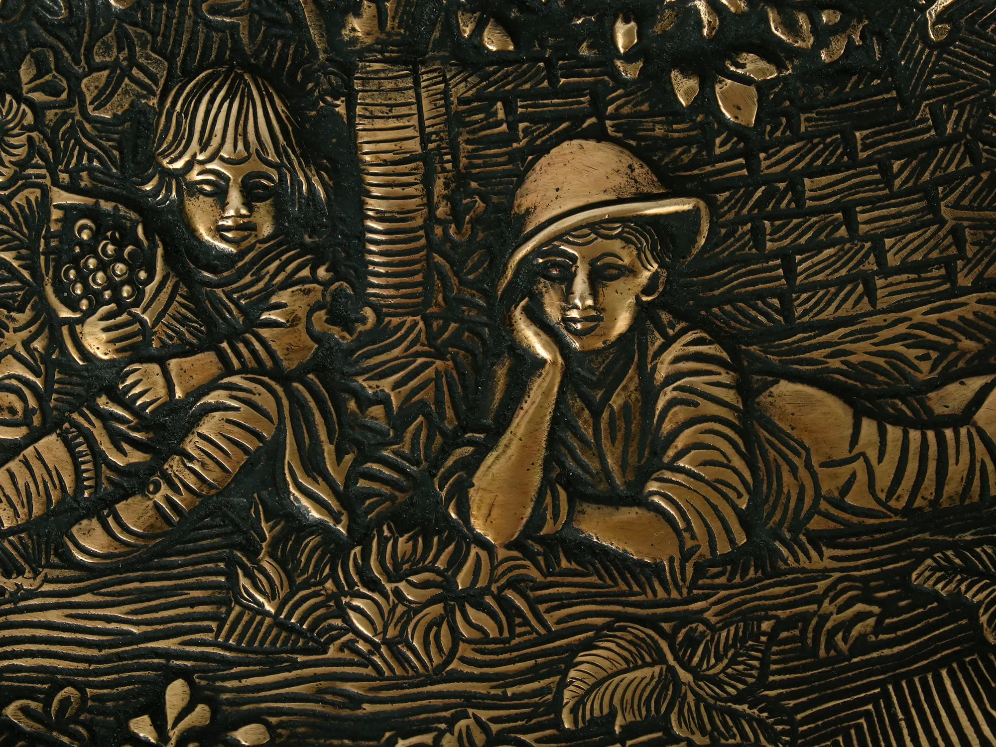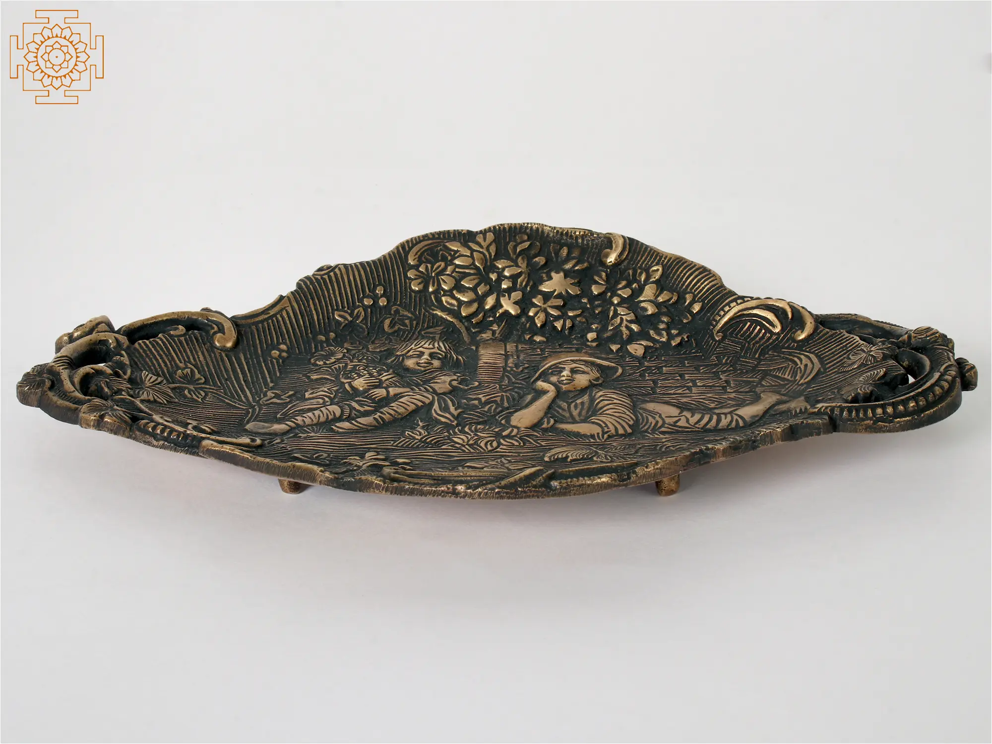 This particular tray features captivating images of a girl and a boy sitting under a tree, evoking a sense of tranquility and leisure. The boy's relaxed posture adds a charming element to the design. The handles adorned with beautiful floral carvings enhance its elegance, making it not just a serving tray but a piece of art.