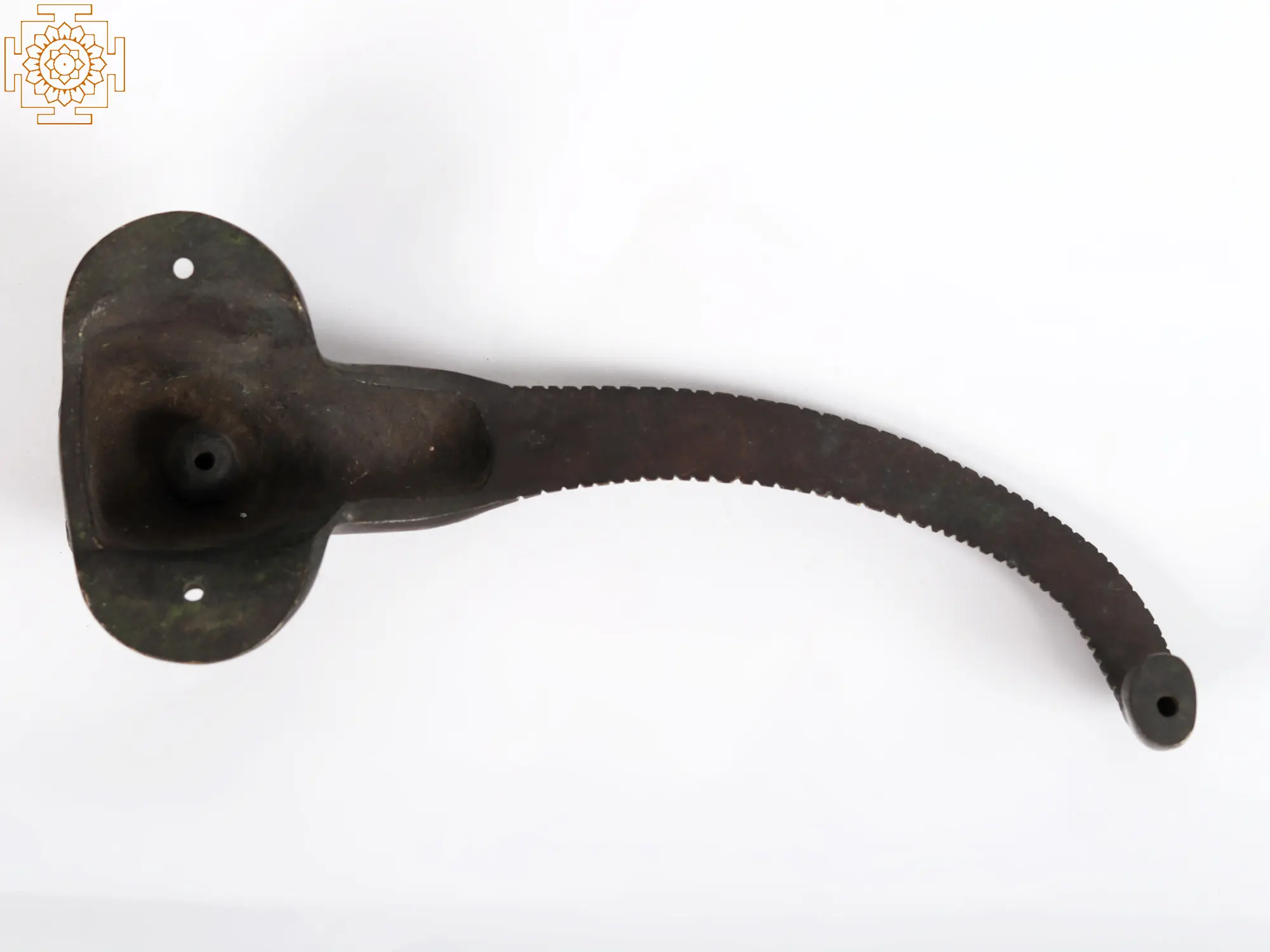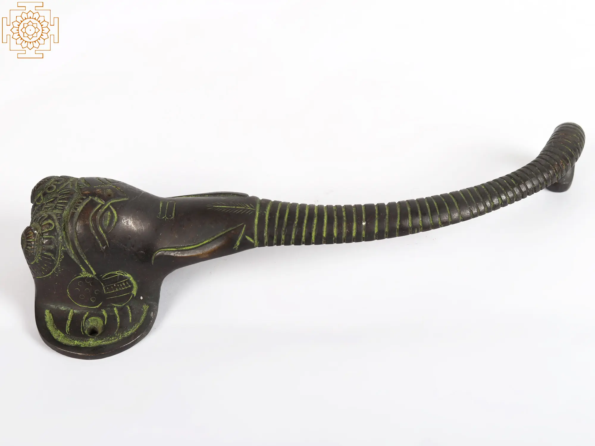 This Elephant Head Door Handle, with its gracefully elongated trunk, exudes charm and sophistication. The exquisite black patina tint enhances its antique allure, imparting a sense of timeless elegance. The green sedimentation within the curves of the trunk adds a touch of character, giving the handle a weathered and distinguished appearance.