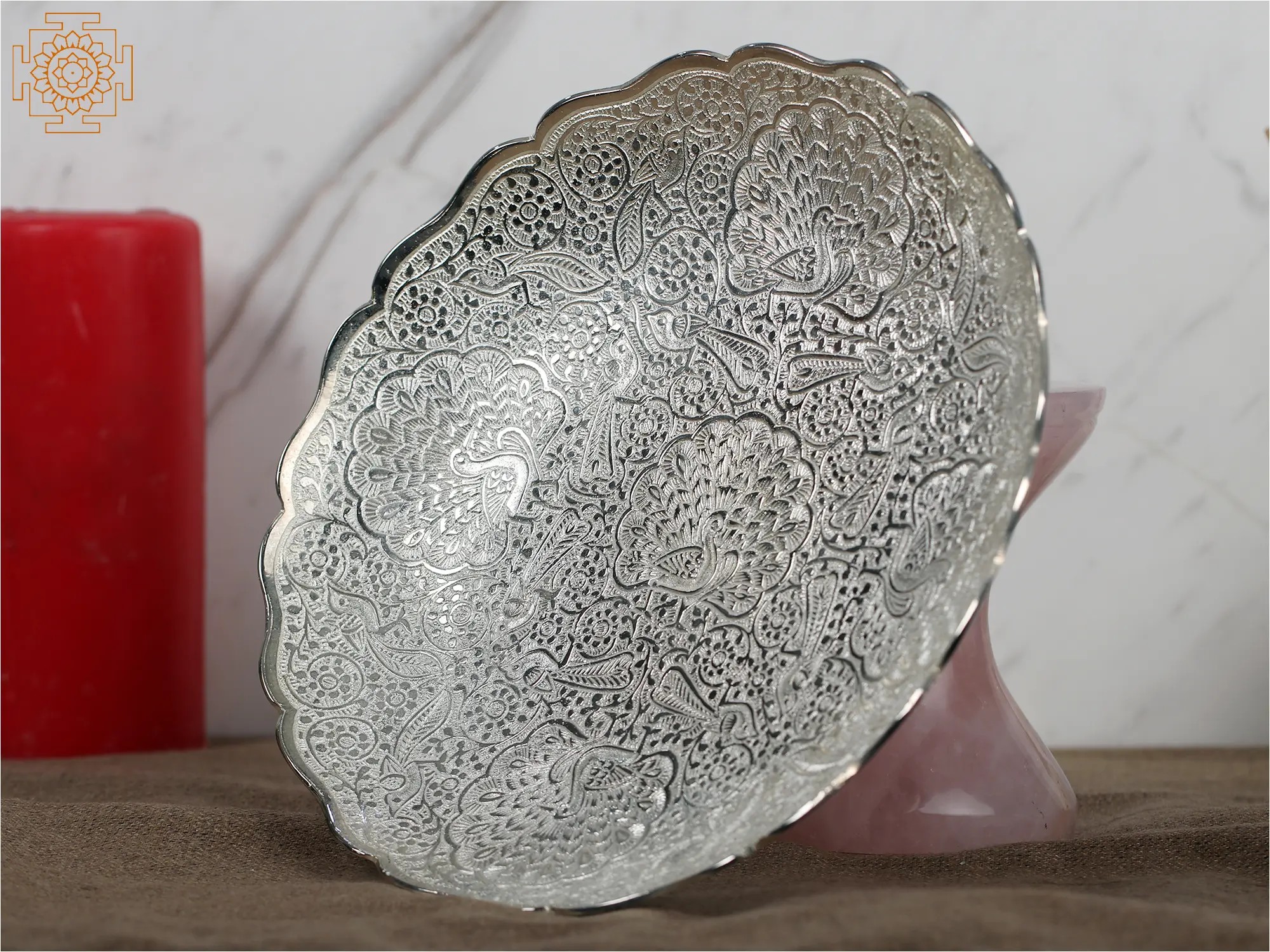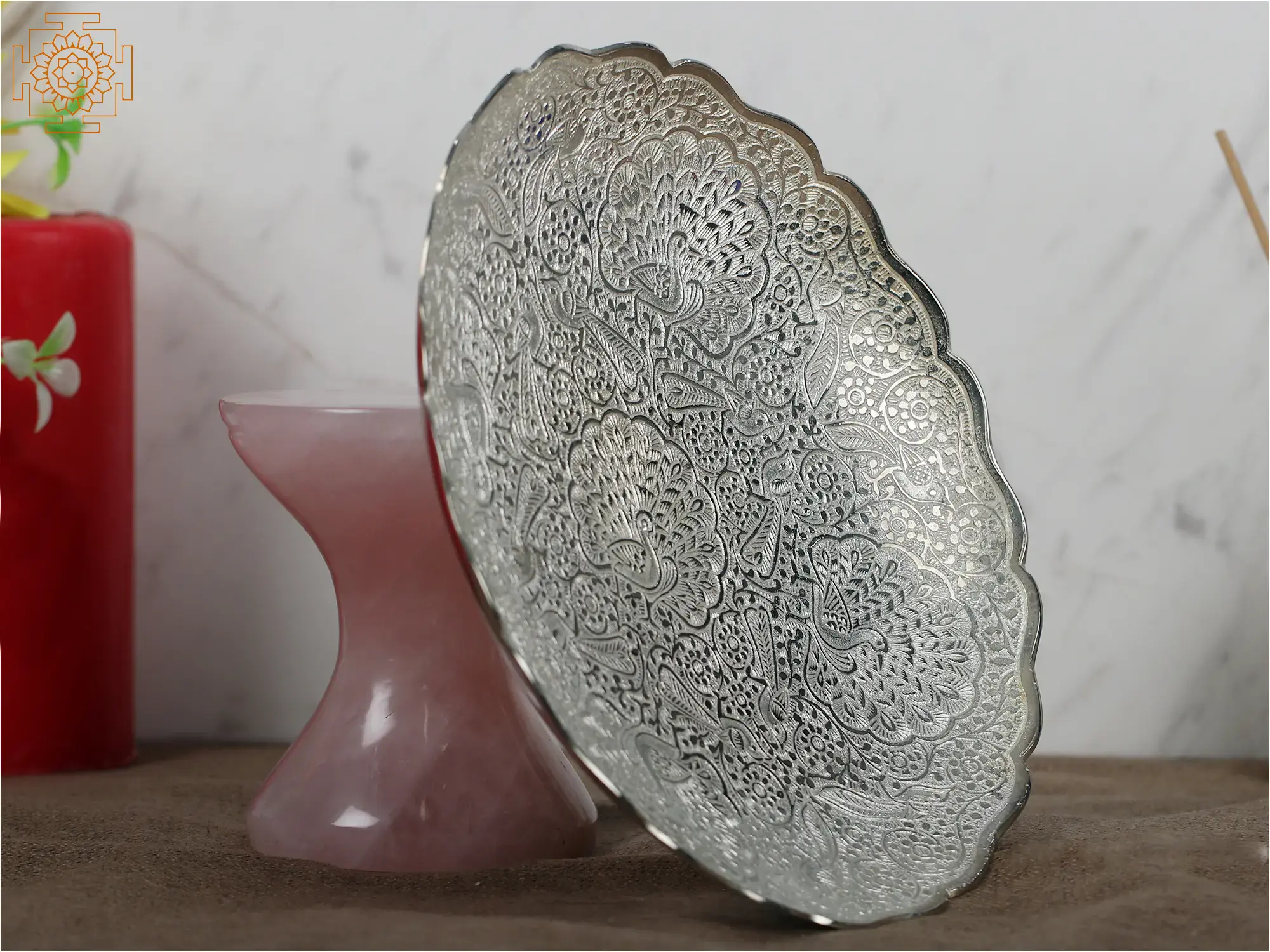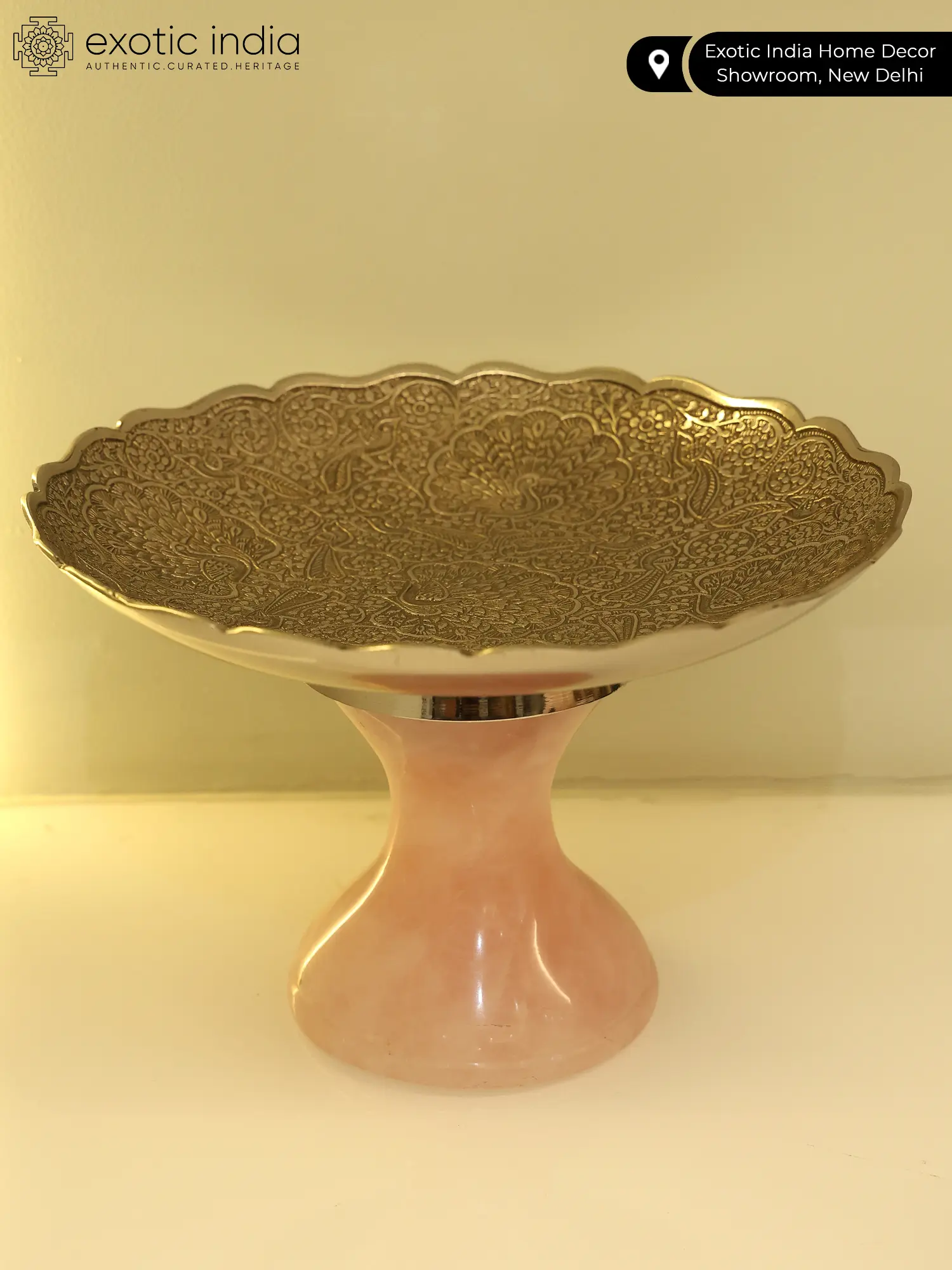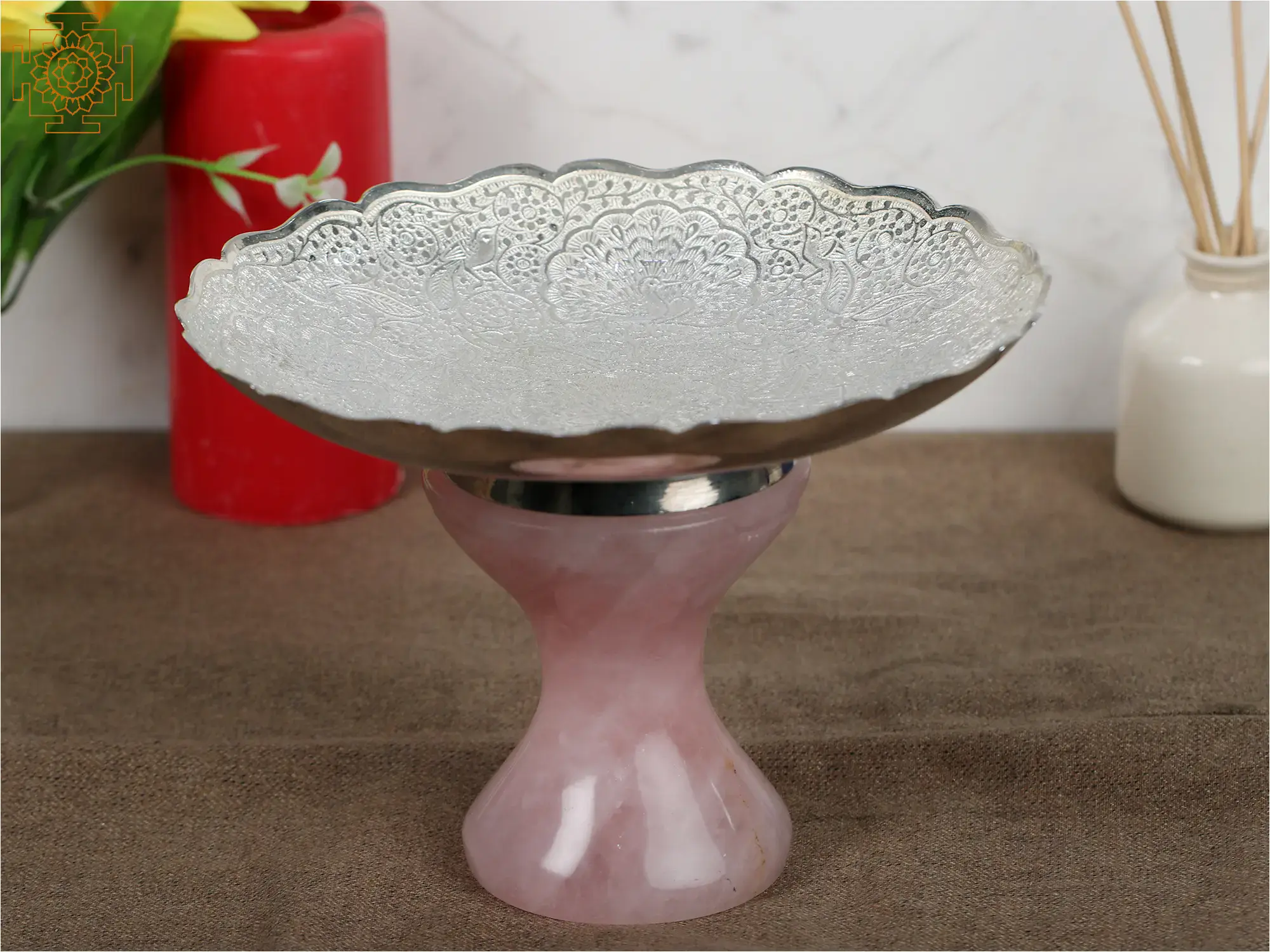 Indulge in opulence with our German Silver Designer Bowl, adorned with a base of Rose Quartz gemstone. This exquisite piece combines the timeless allure of German silver with the gentle energy of Rose Quartz, known for promoting love and harmony. The intricate detailing on the bowl reflects a commitment to craftsmanship, making it a statement piece for any setting. Whether used for serving or as a decorative accent, this bowl embodies the union of aesthetics and positive vibes, making it a must-have for those who appreciate the finer things in life.
