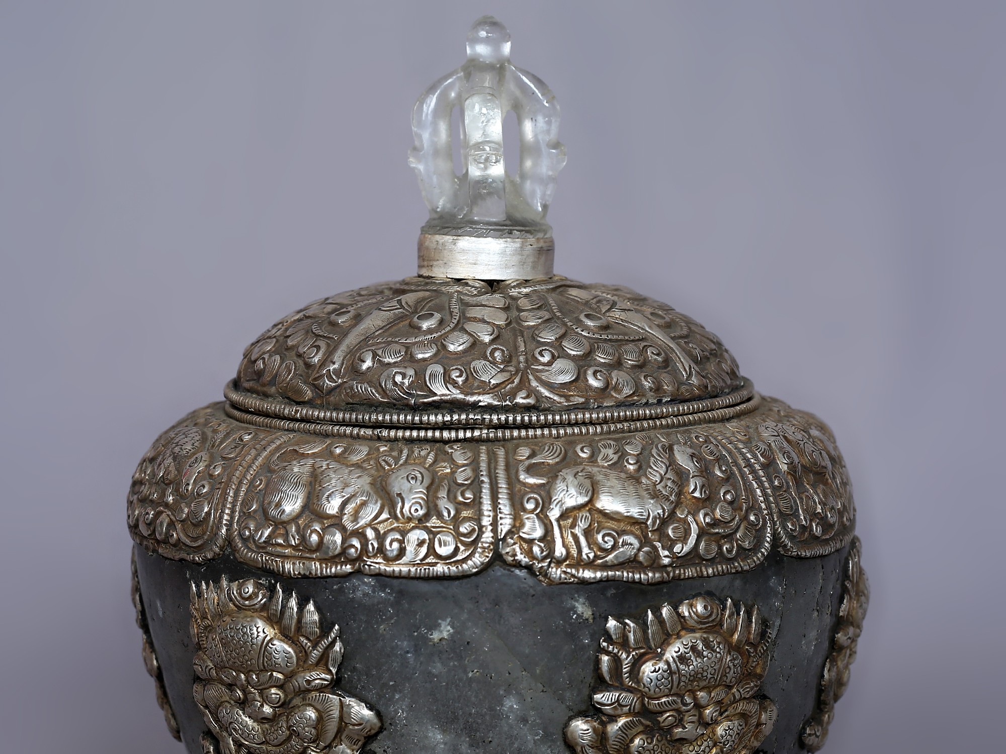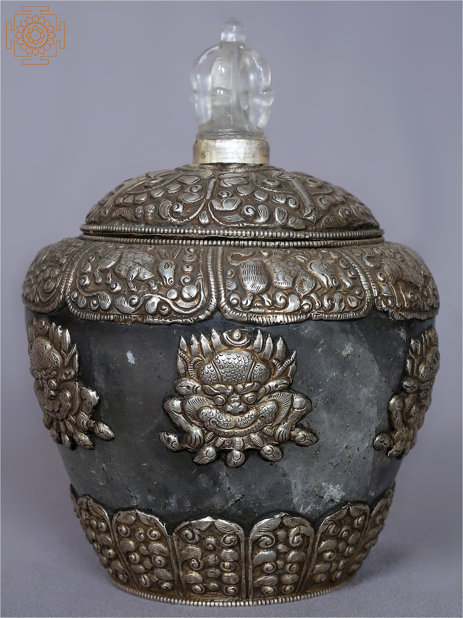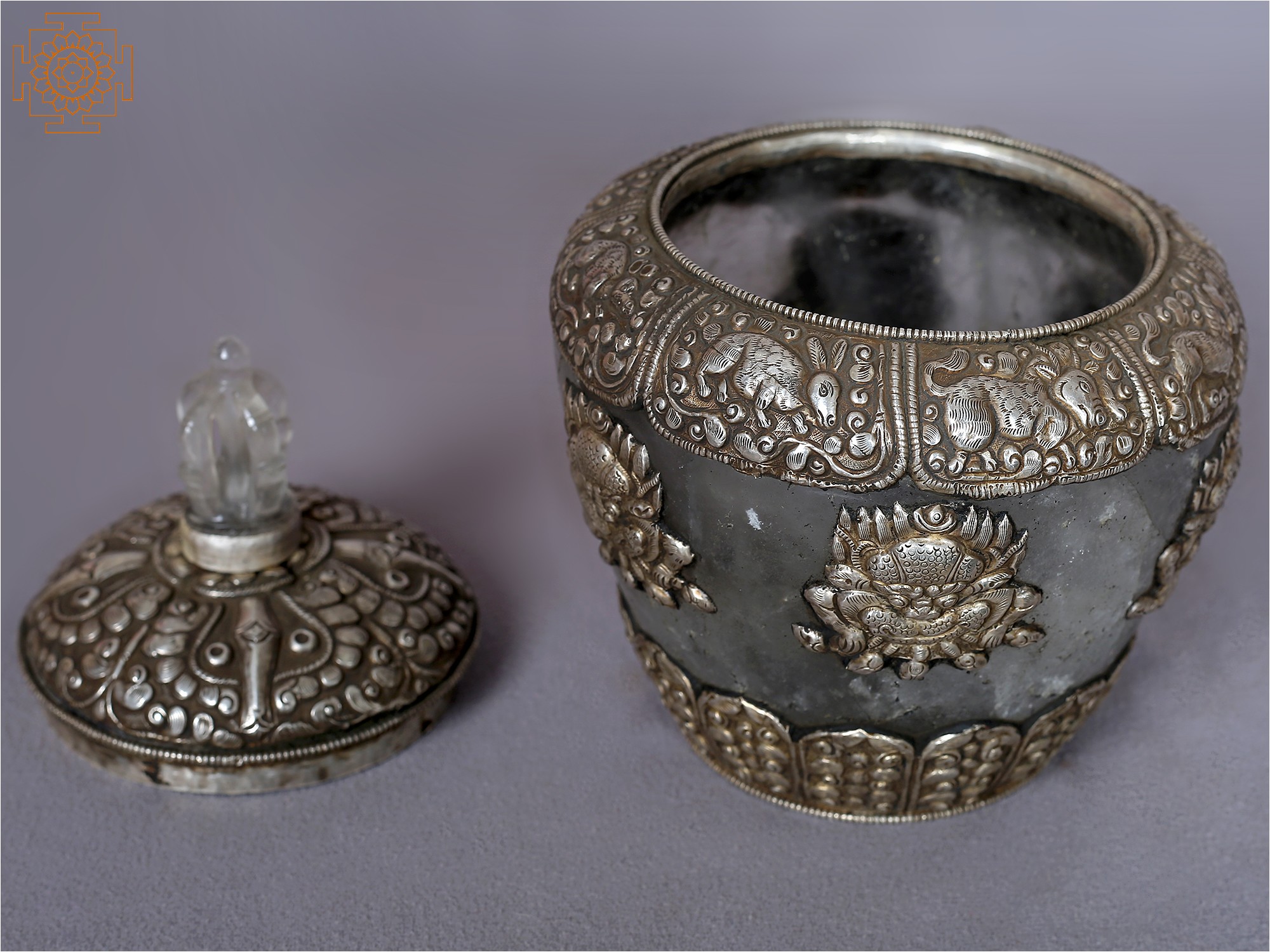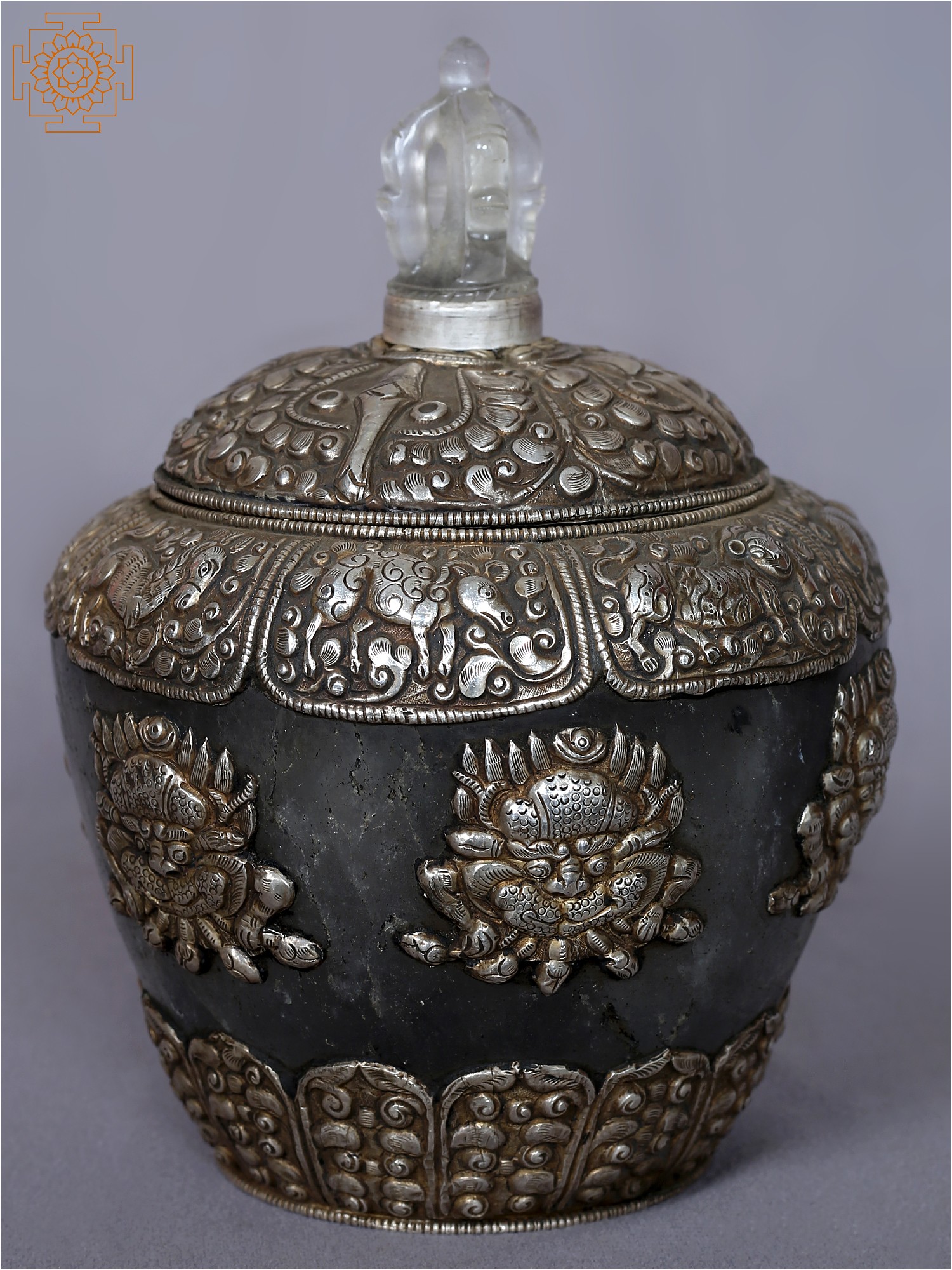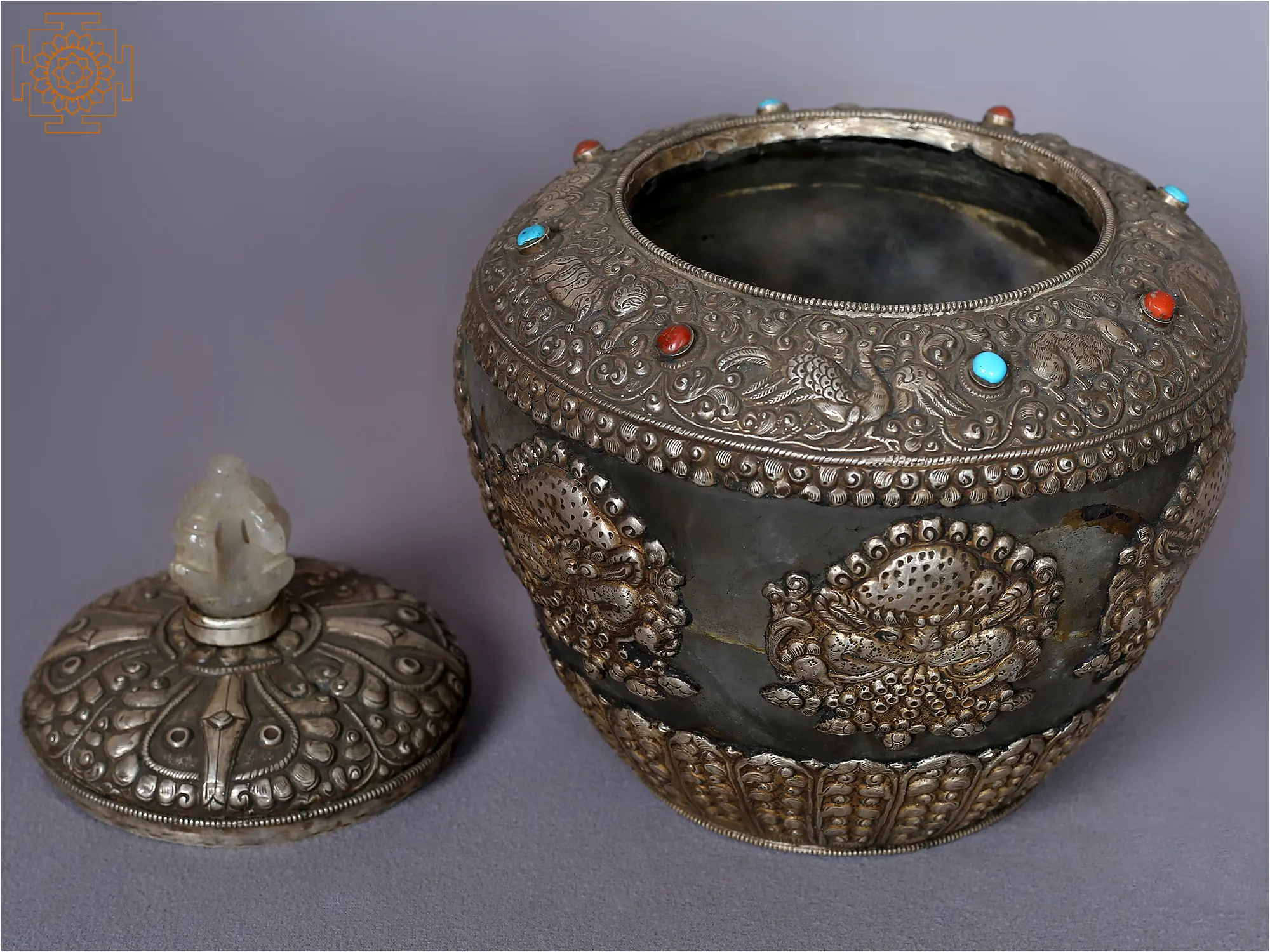 Immerse yourself in the rich cultural heritage of Nepal with this exquisite storage vessel, a testament to centuries of artisanal mastery. Crafted from durable copper and adorned with intricate silver detailing, this piece is more than just a container; it's a work of art that brings a touch of sacred beauty and historical depth to any space.