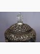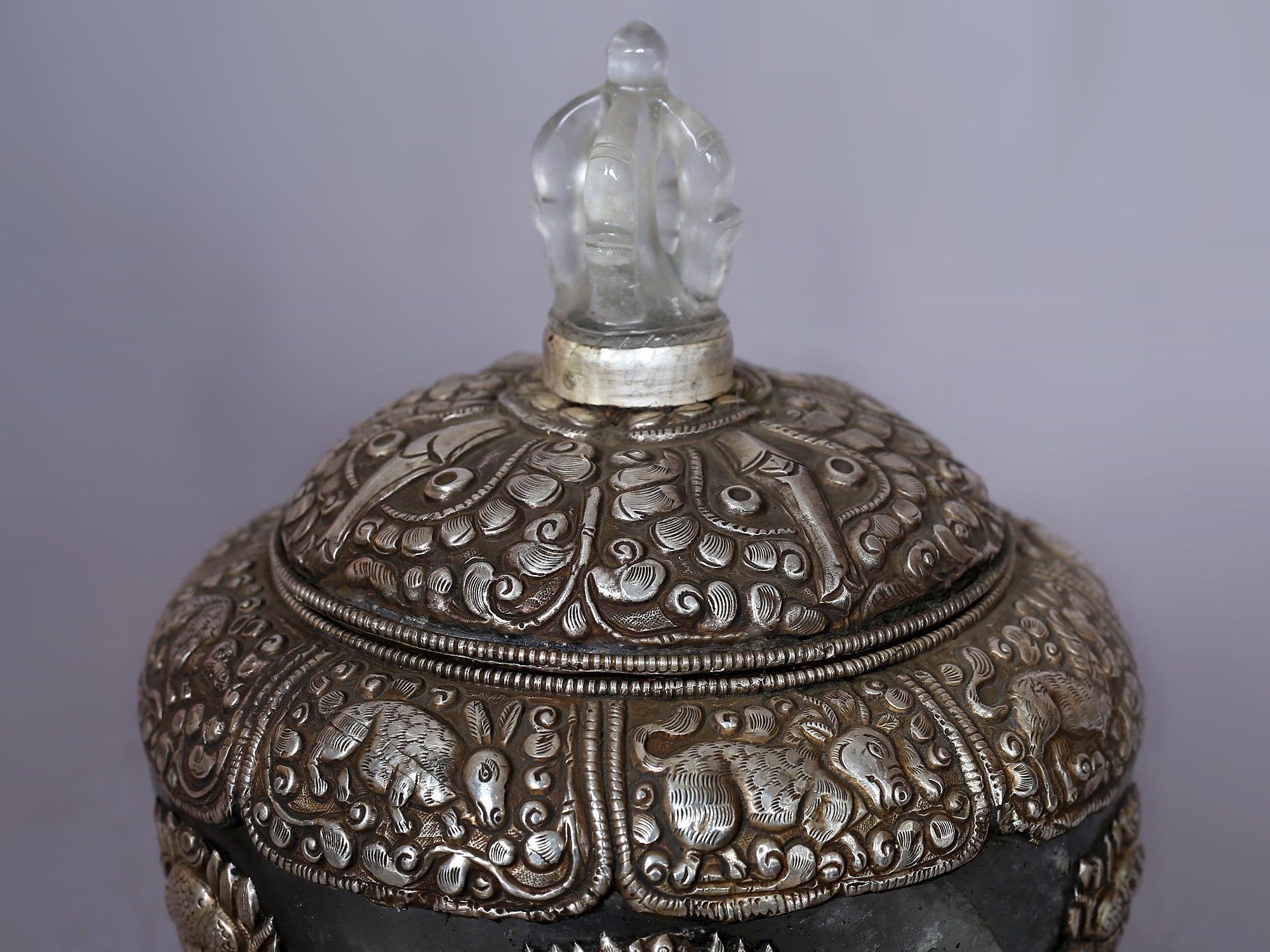 The exterior of this magnificent piece is a canvas of meticulous artistry. Silver filigree work, a hallmark of Nepalese craftsmanship, flows across the surface, creating a mesmerizing interplay of light and shadow. Each element is rendered with exceptional skill, from the fearsome yet protective guardian lions that adorn the body to the delicate floral motifs and swirling cloud patterns that grace the lid and base. These symbols are deeply rooted in Buddhist and Hindu traditions, often representing power, protection, and auspiciousness. The vibrant accents of turquoise and coral, strategically placed, add pops of color and enhance the overall visual appeal, further imbuing the vessel with spiritual significance.