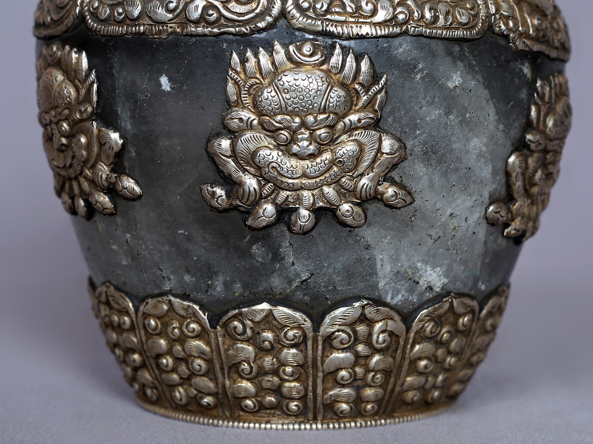 This Nepalese copper and silver vessel is destined to be a captivating centerpiece in your home. Its commanding presence and unique design make it an ideal addition to various decor styles, from Bohemian and eclectic to more traditional settings seeking an authentic global accent. Place it on a mantelpiece, a console table, or as a distinguished element in your meditation or prayer space. It is a conversation starter, a piece that tells a story of devotion, artistry, and a deep connection to the spiritual heart of Nepal. Owning this piece is not just about acquiring an object; it's about embracing a piece of living history and supporting the continuation of remarkable traditional crafts.