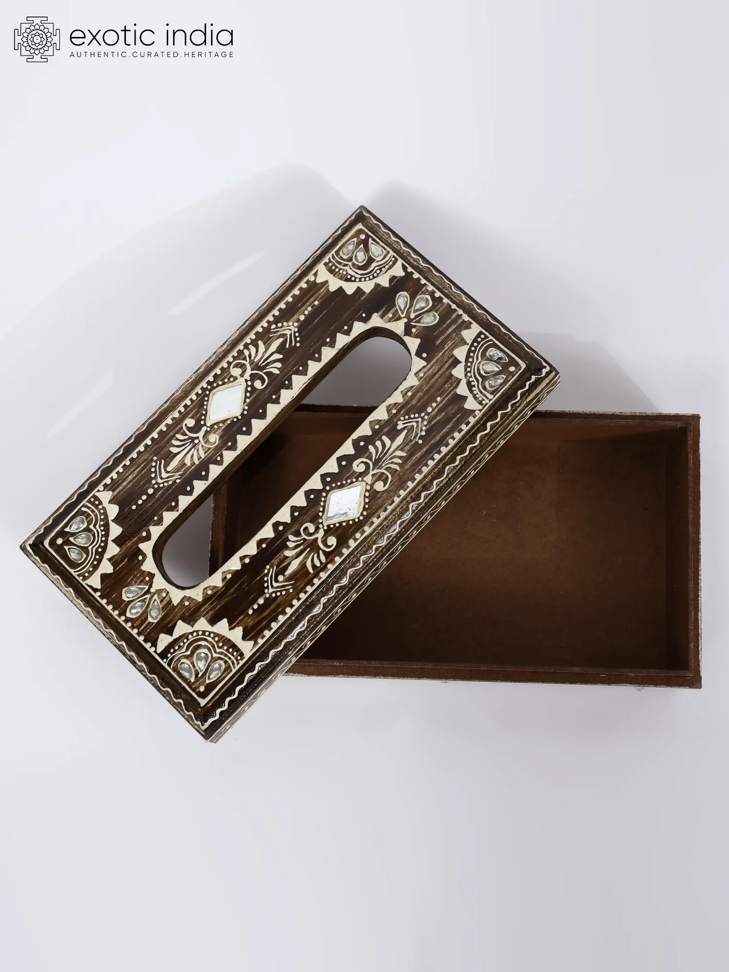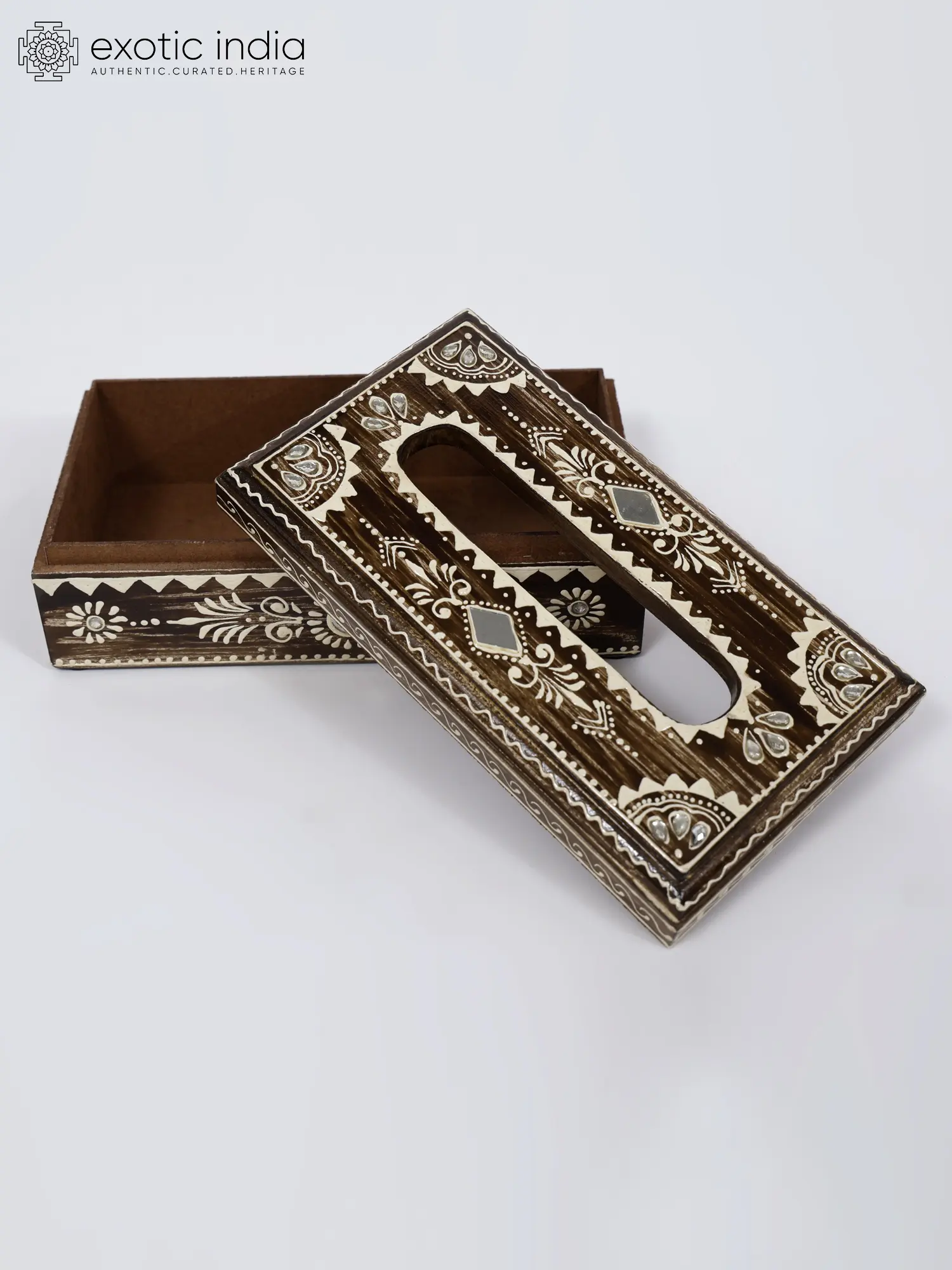 Lipan art, a beautiful traditional craft, reflects the rich cultural heritage of indigenous communities. This Hand-Painted Decorated Tissue Holder in Wood brilliantly incorporates Lipan art, showcasing its intricate patterns and vibrant colors. Against a brown rustic background, the stonework and white-lined decoration stand out, enhancing the holder's elegance.