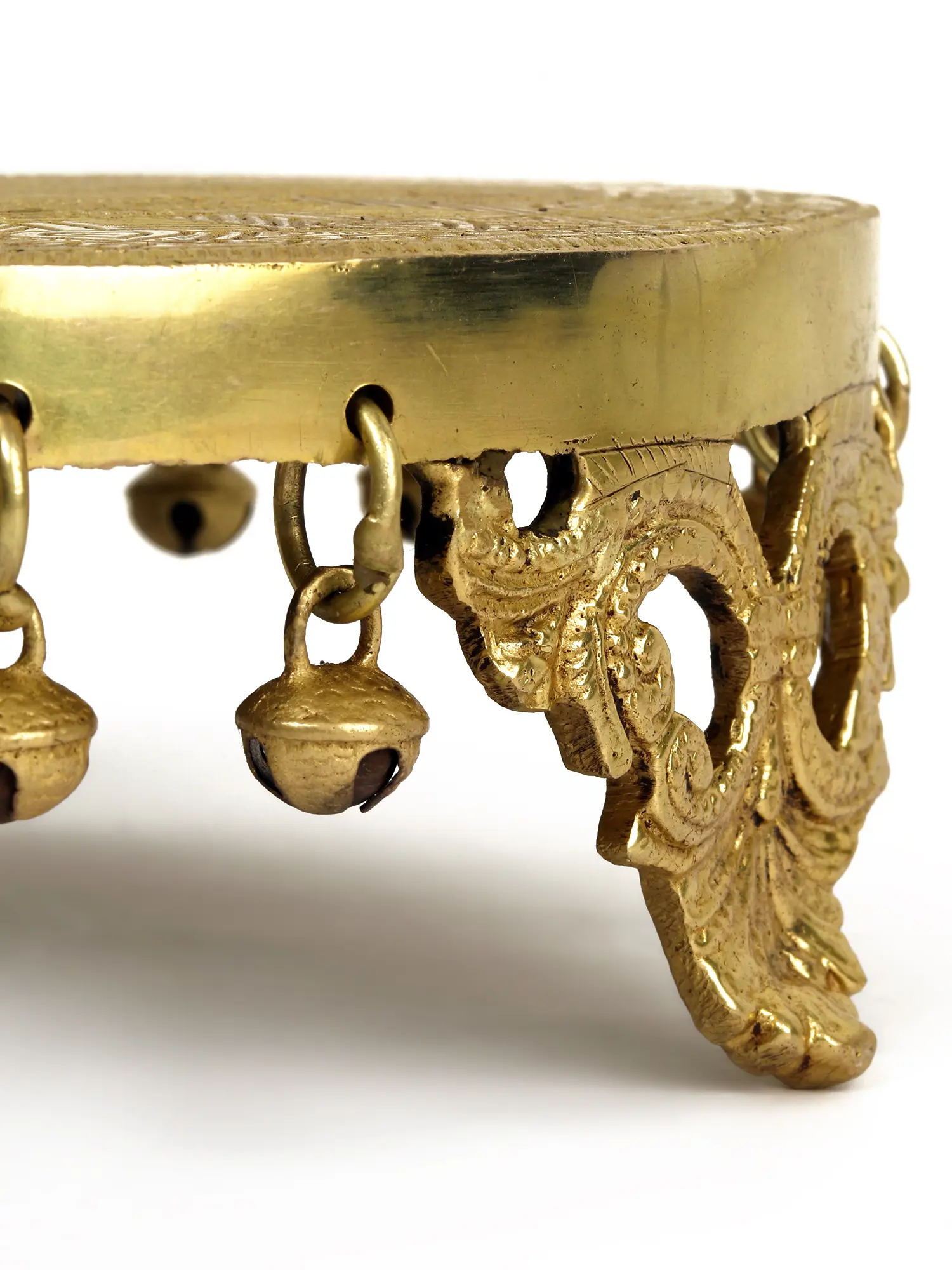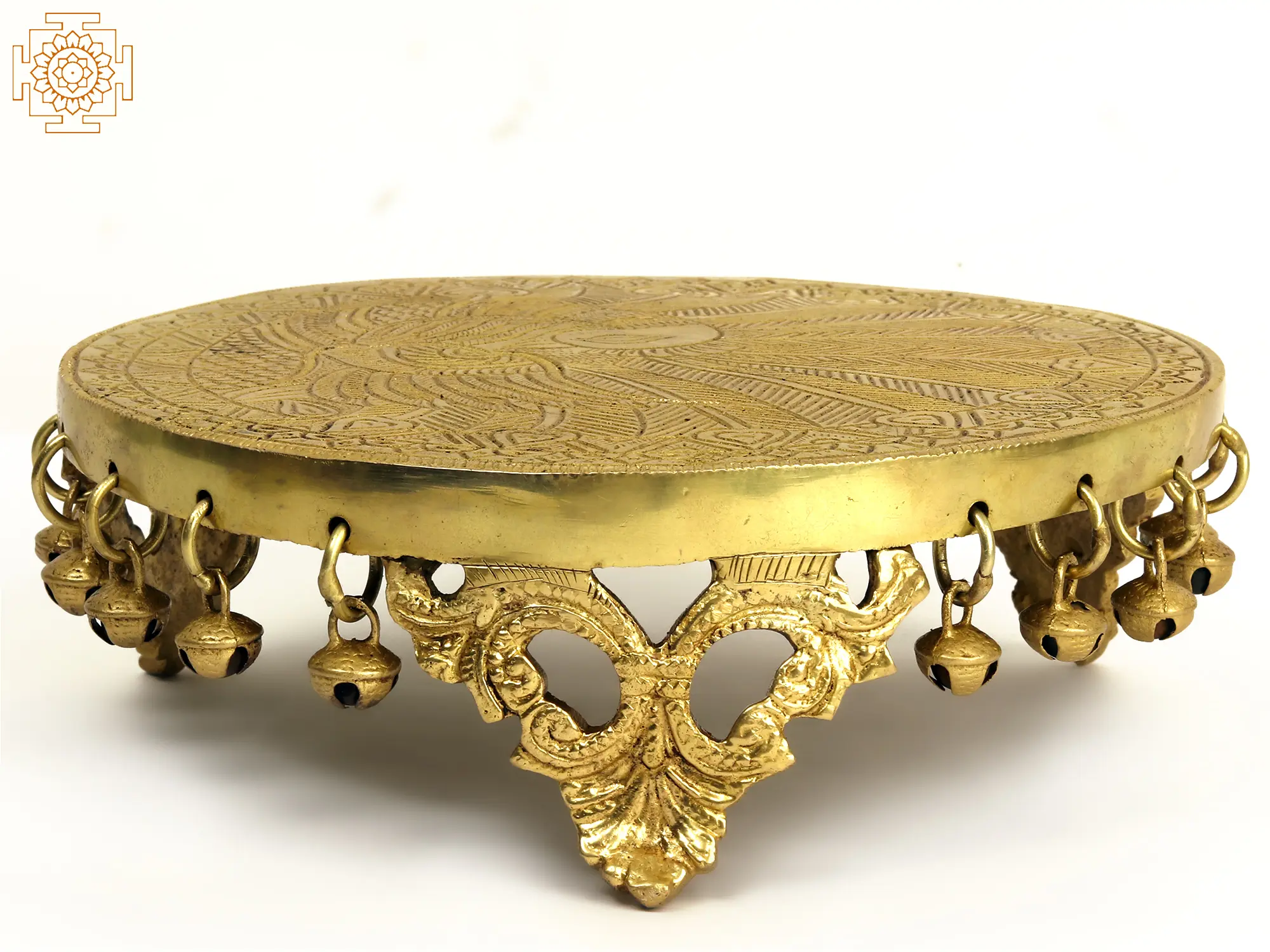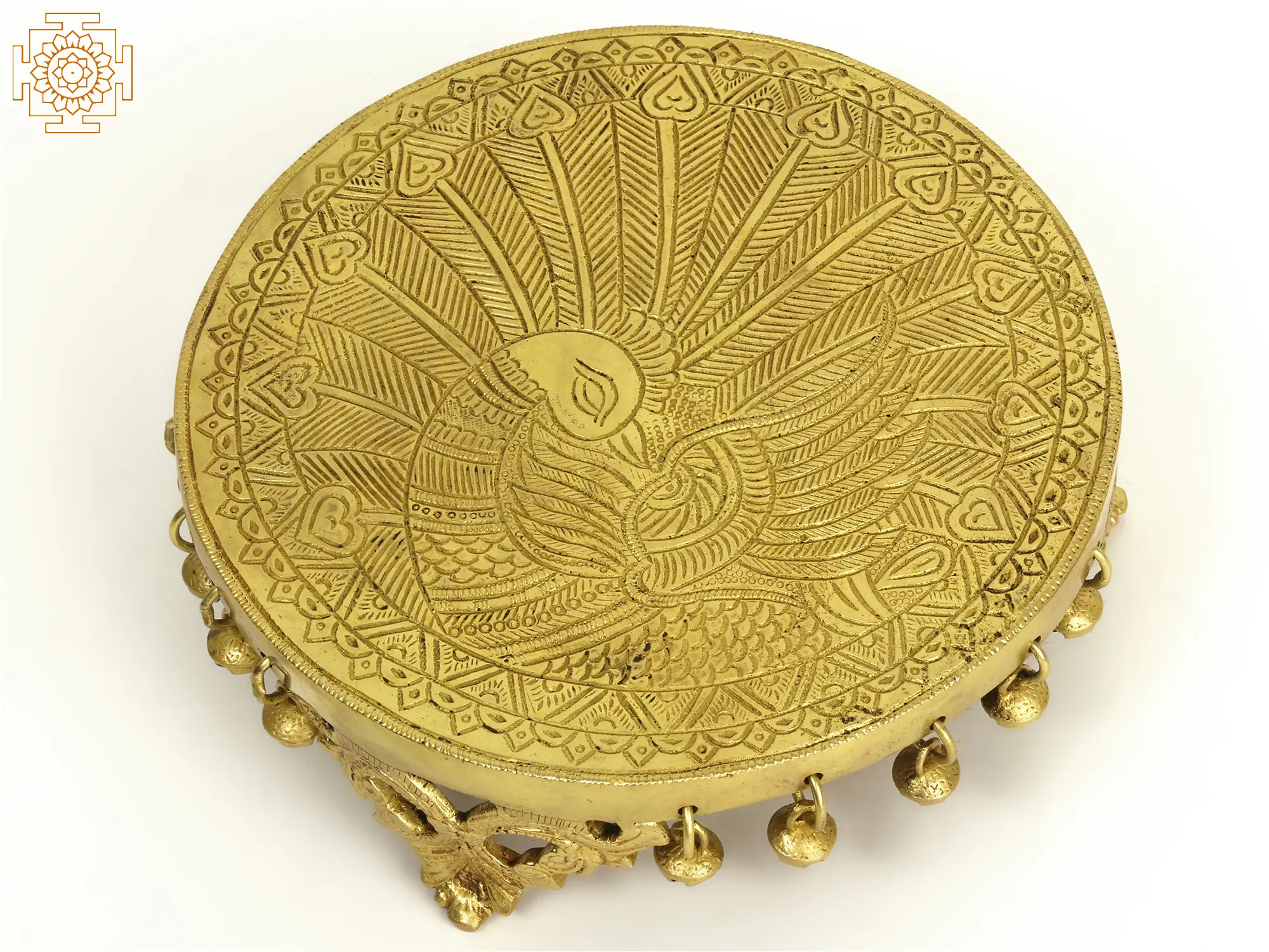 This Peacock Design Round Chowki featuring Dangling Ghungroos in Brass is a timeless piece that carries the charm and regal vibe of the bygone era. This exquisite piece combines artistic flair with traditional charm, showcasing a peacock-inspired design that spreads over the whole chauki. The intricately crafted brass is a testament to the age-old technique of chiselling. The piece is finally adorned with dangling ghungroos, creating a symphony of elegance and tradition. Perfect as a decorative accent or a thoughtful gift, this round chowki elevates your decor with its unique blend of craftsmanship and cultural richness, making it a captivating addition to your home.