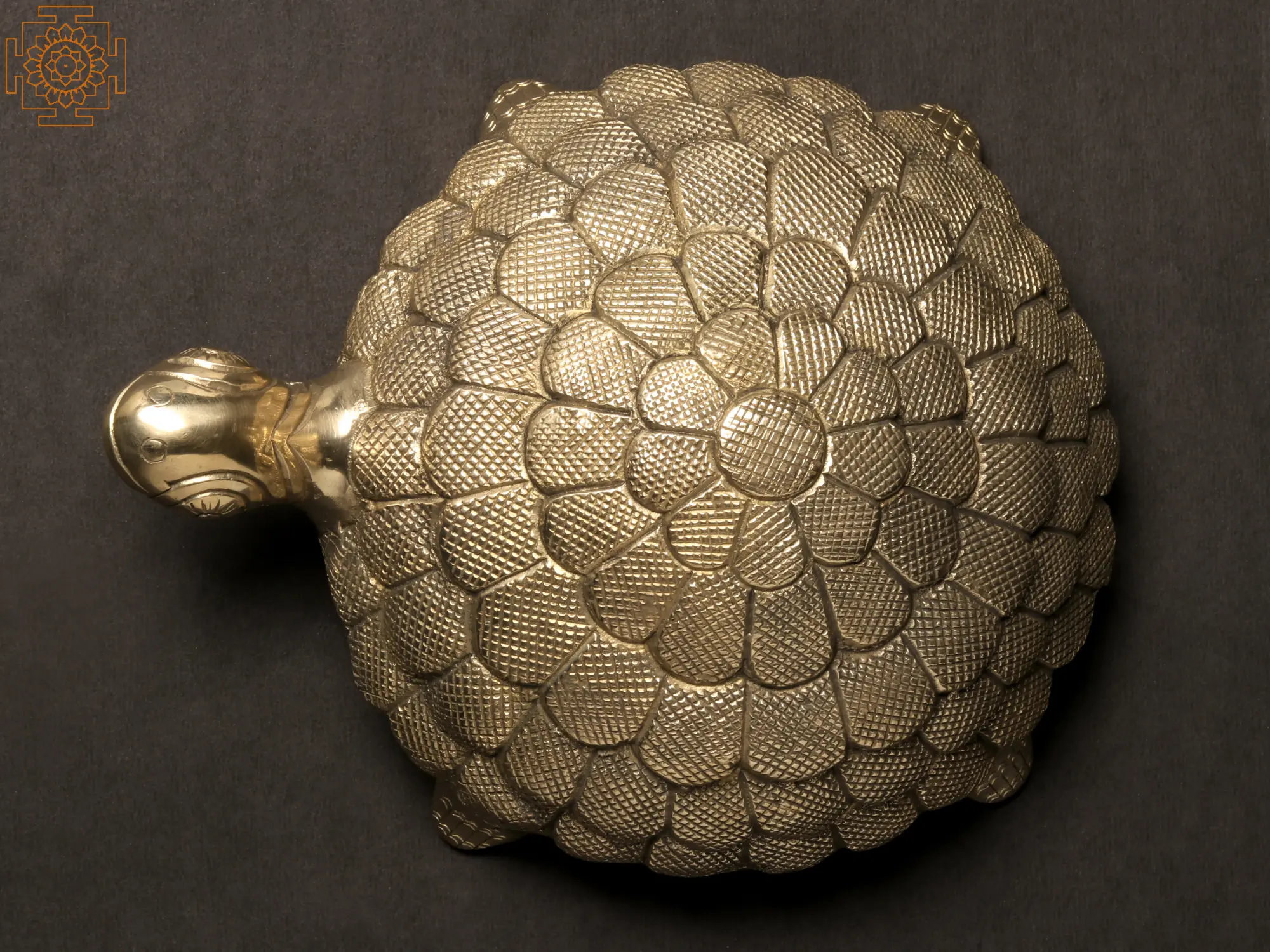 The stunning brass tortoise in its golden touch has a hard and protective spherical shell all around with a flat base. Its carapace is covered by an outer layer, engraved magnificently with individual scoots. These protective scales on the shell would protect the tortoise from predators. The tortoise with its one-sided body parts, the round bright black eye, nostrils, the club-like foreleg and hind leg, head, and neck on its large mouth, looks elegant. This aesthetic and auspicious artifact would bring health, longevity, and good luck to you.
