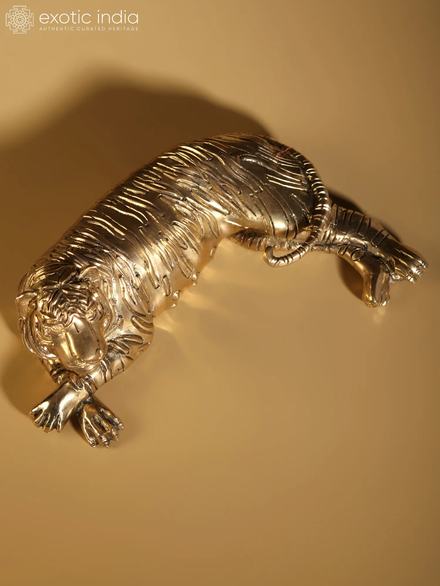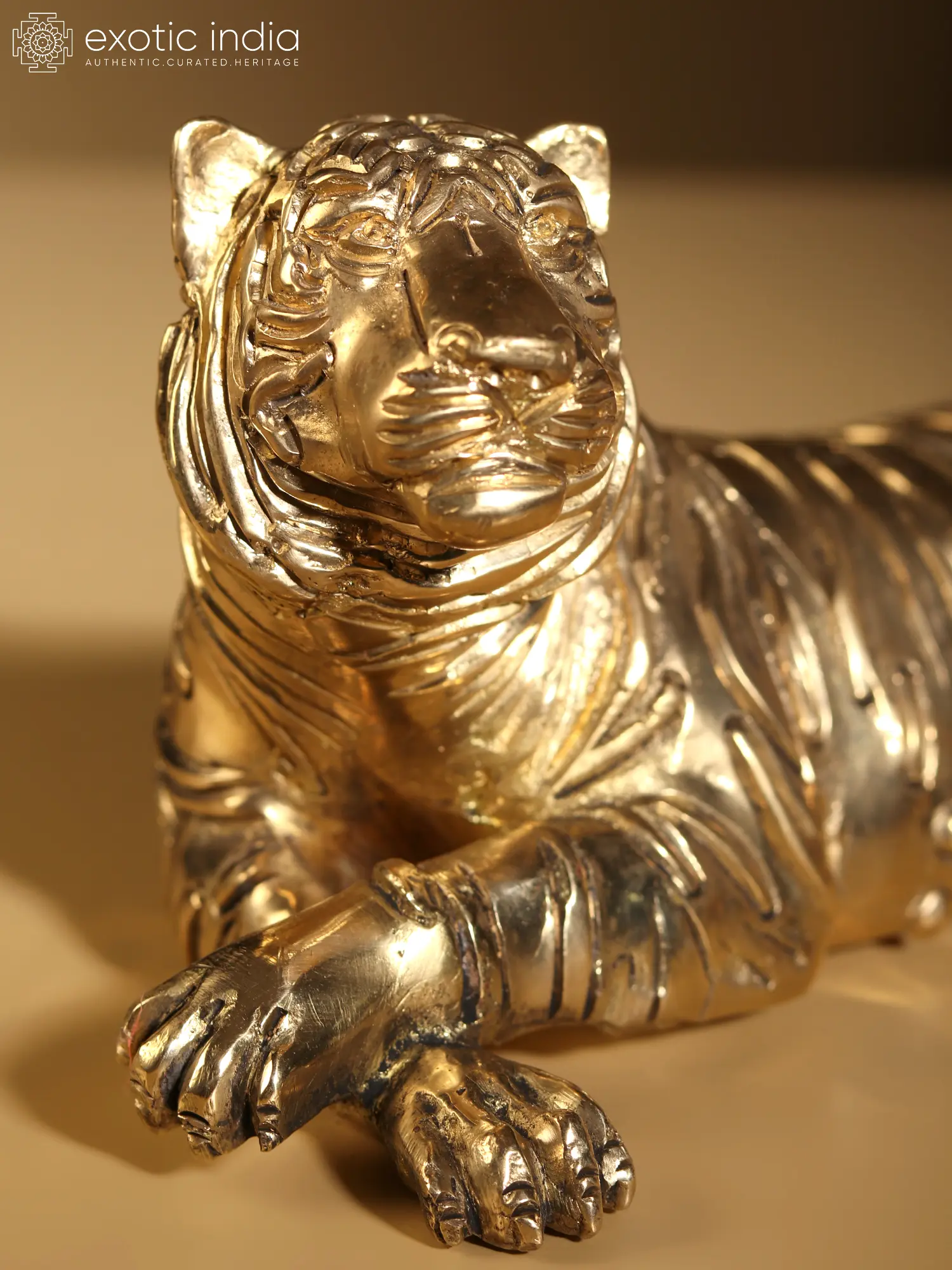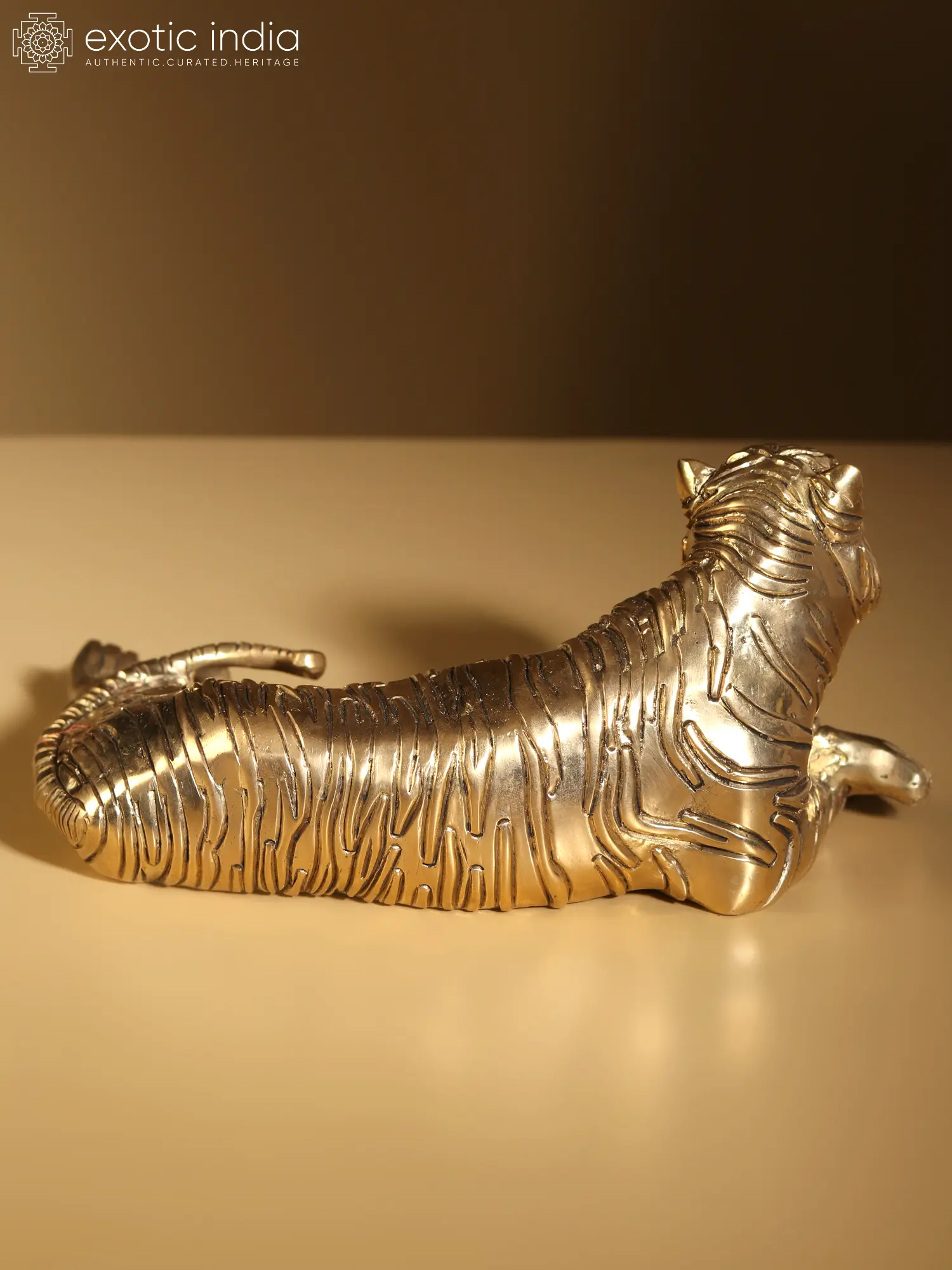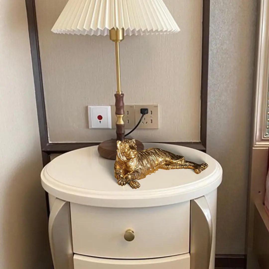 The "Relaxing Tiger Brass Statue" exemplifies this rich tradition, serving as a magnificent home decor item. Crafted with intricate brass lines mimicking natural patches, the statue captures the essence of a relaxing tiger in regal repose. Such artistic representations not only pay homage to India's artistic heritage but also elevate the ambiance of a space, infusing it with a majestic and timeless aura. This piece stands as a testament to the enduring allure of the tiger motif in Indian art, seamlessly blending tradition with contemporary elegance.