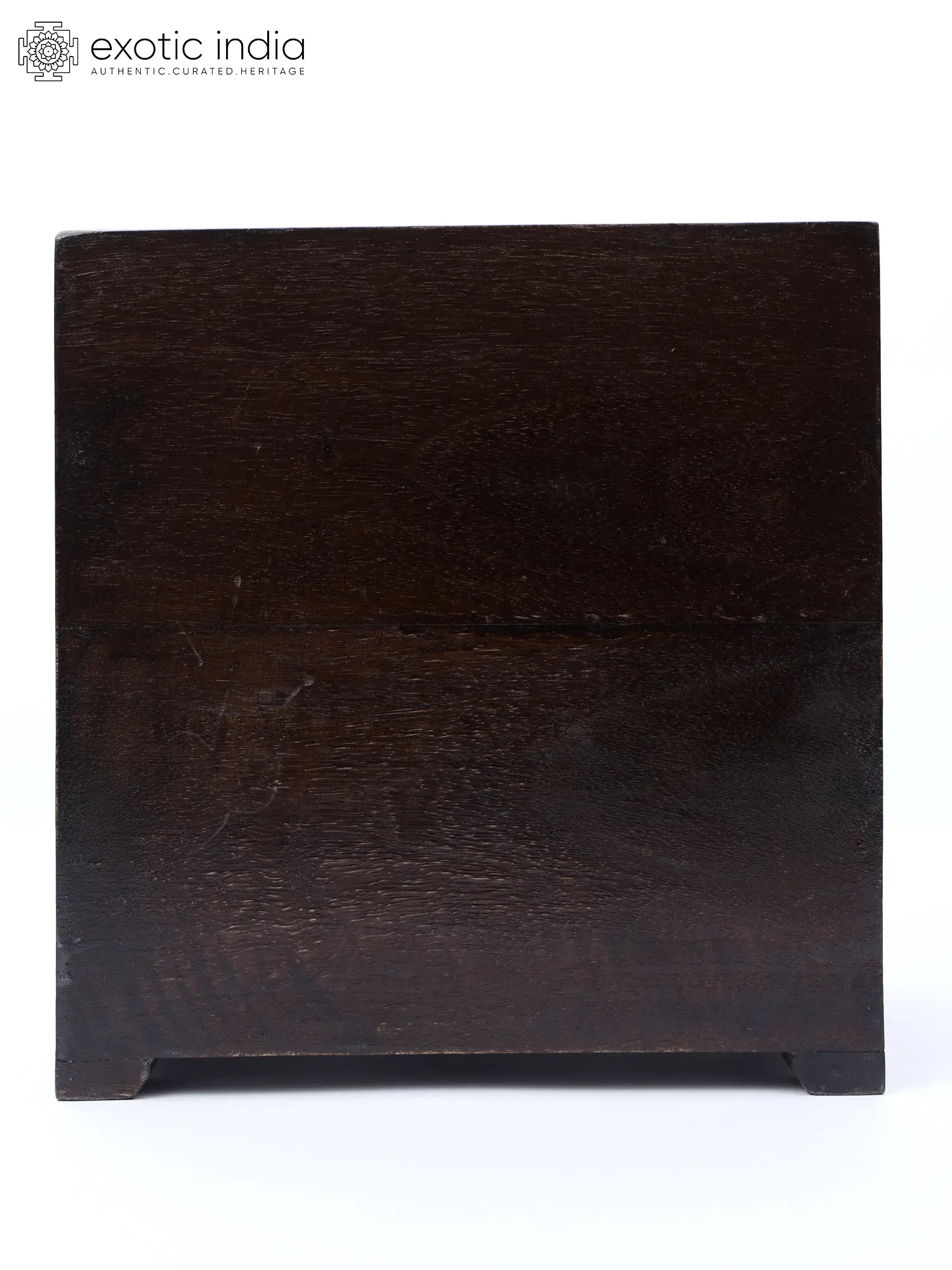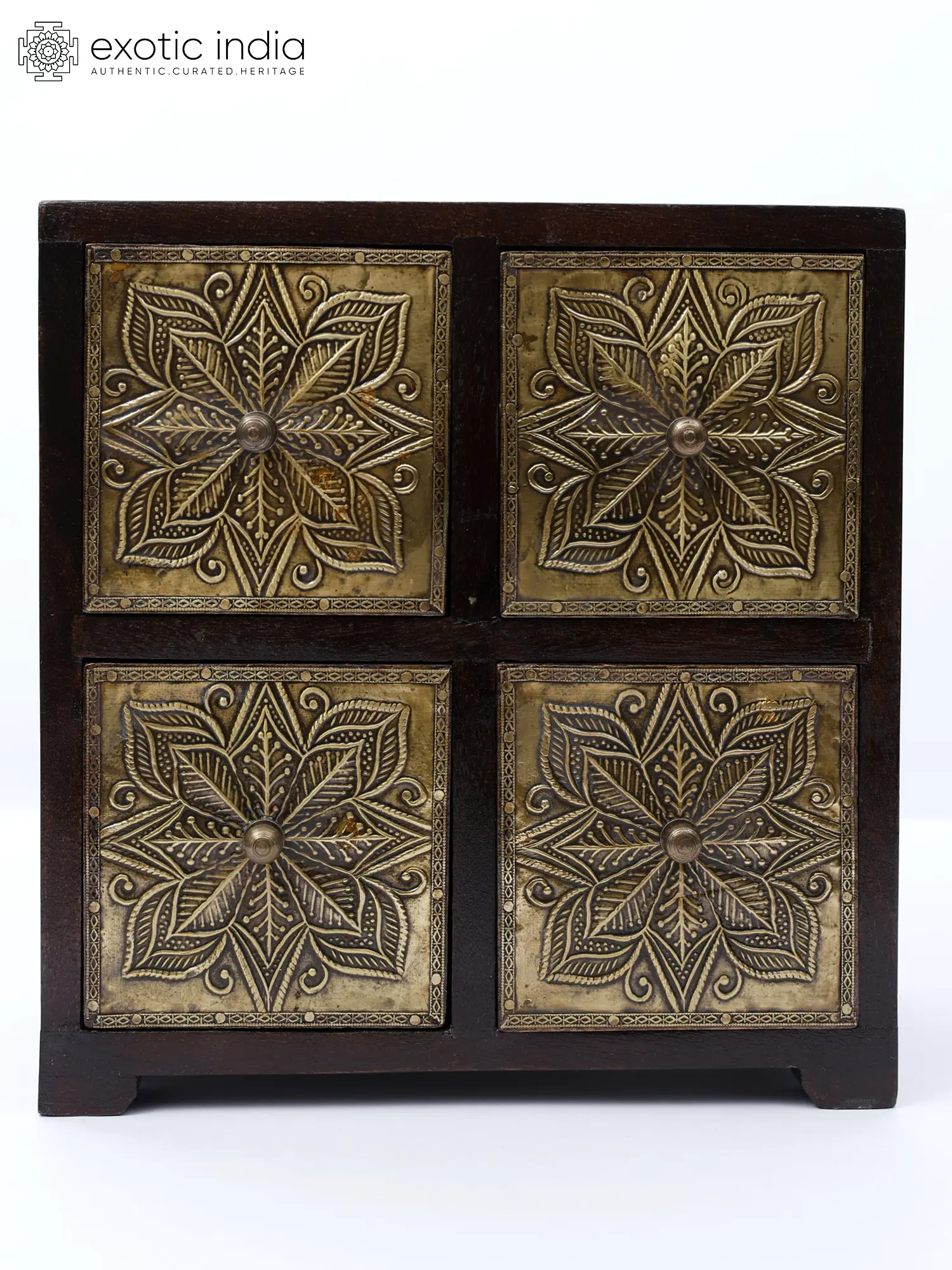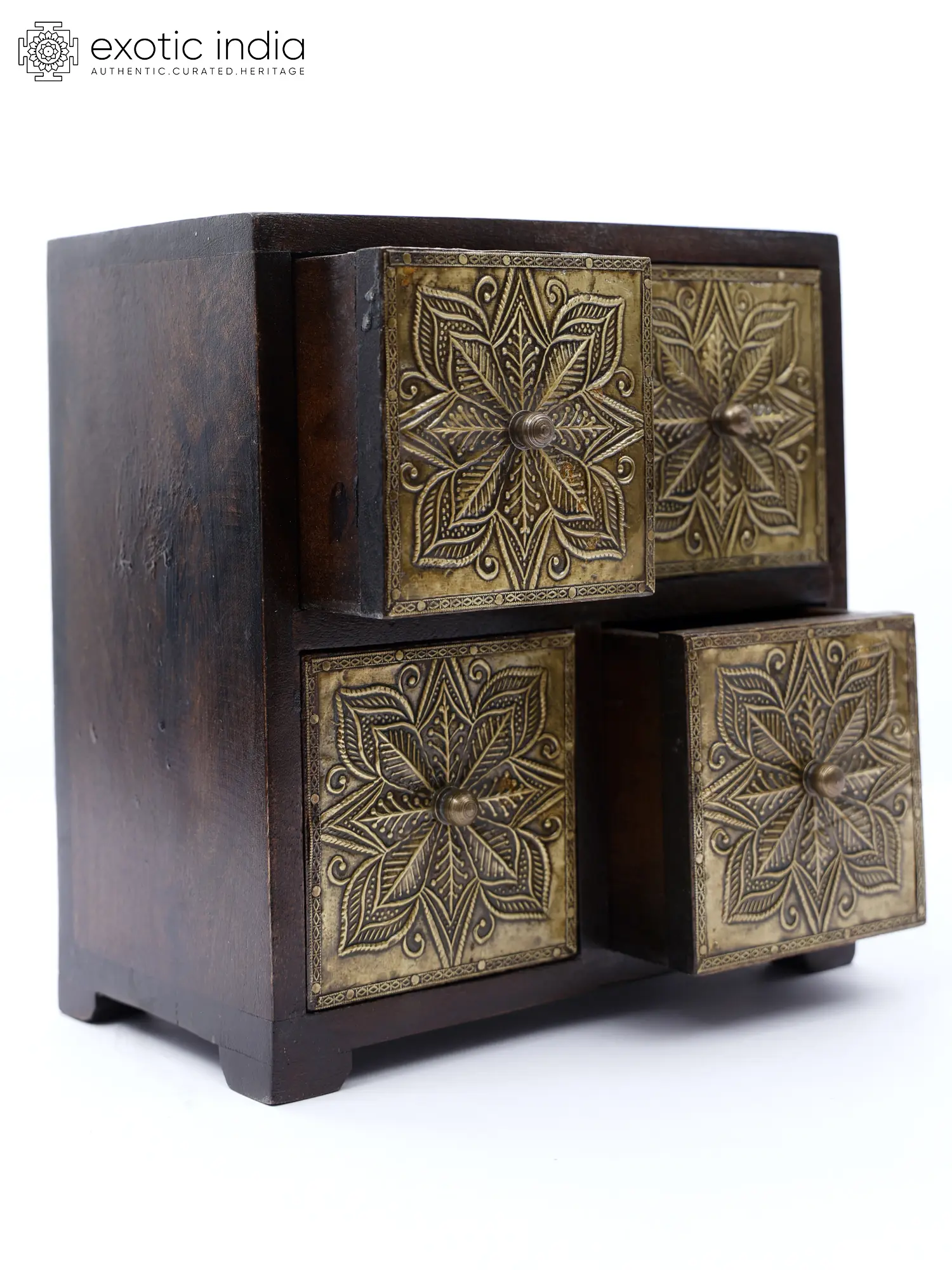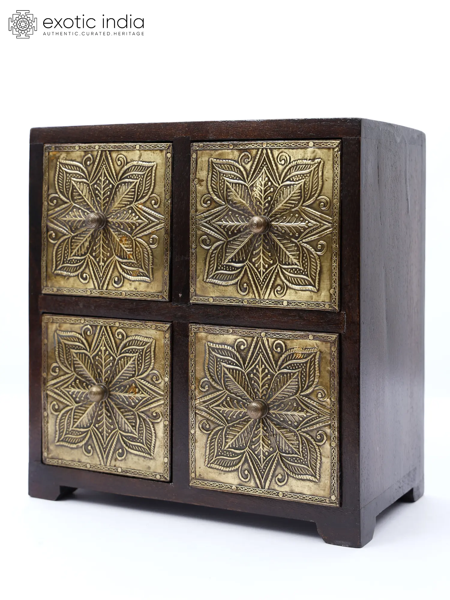 Store your stuff aesthetically with this exquisite brass and wood chest, crafted with artistic elements and the touch of Indian craftsmanship. The wooden frame supports four beautiful drawers, each decorated with ethnic floral patterns and small globular handles. The blend of metal and wood creates that perfect balance of modern and traditional appeal in this chest, making it a lovely addition to any space.