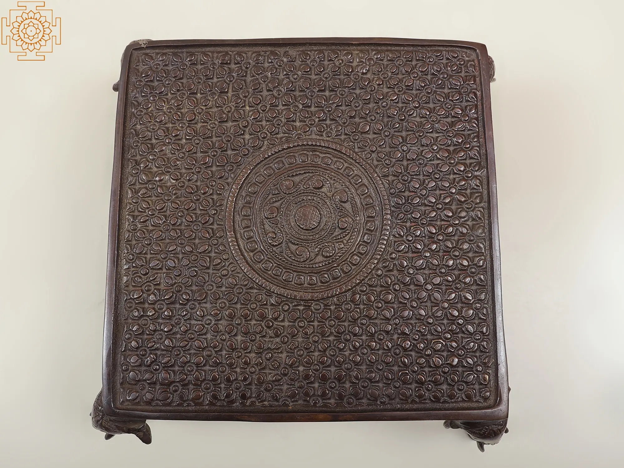 This pedestal (Chowki) is a stunning combination of purpose and creativity. Crafted with care in brass, its legs smoothly morph into beautiful elephant heads, bringing a magical touch to your space. This magnificent “Chowki” perfectly combines usefulness and beauty, making it a flexible decorative piece or a one-of-a-kind side table.