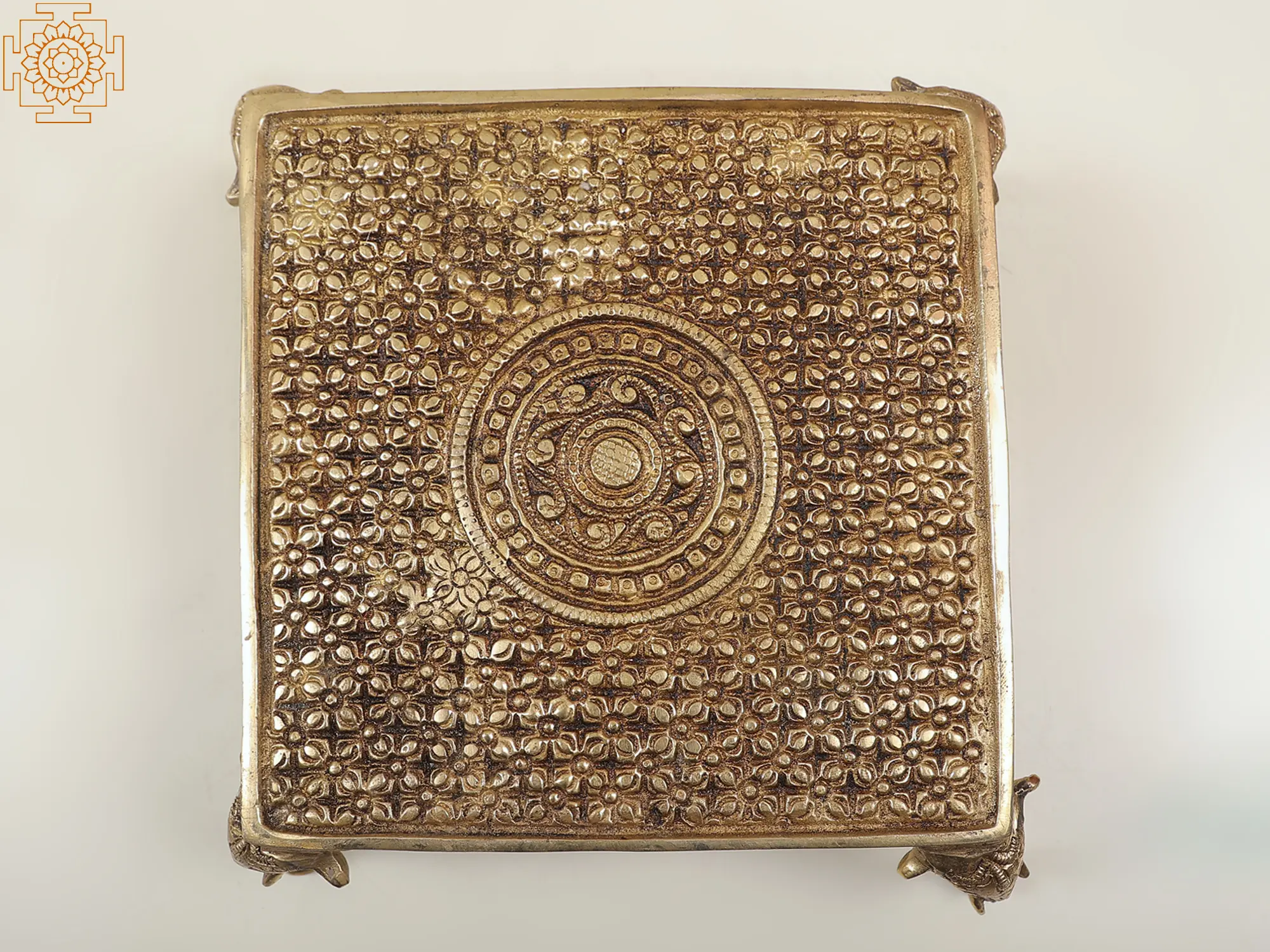 This pedestal (Chowki) is a stunning combination of purpose and creativity. Crafted with care in brass, its legs smoothly morph into beautiful elephant heads, bringing a magical touch to your space. This magnificent “Chowki” perfectly combines usefulness and beauty, making it a flexible decorative piece or a one-of-a-kind side table.