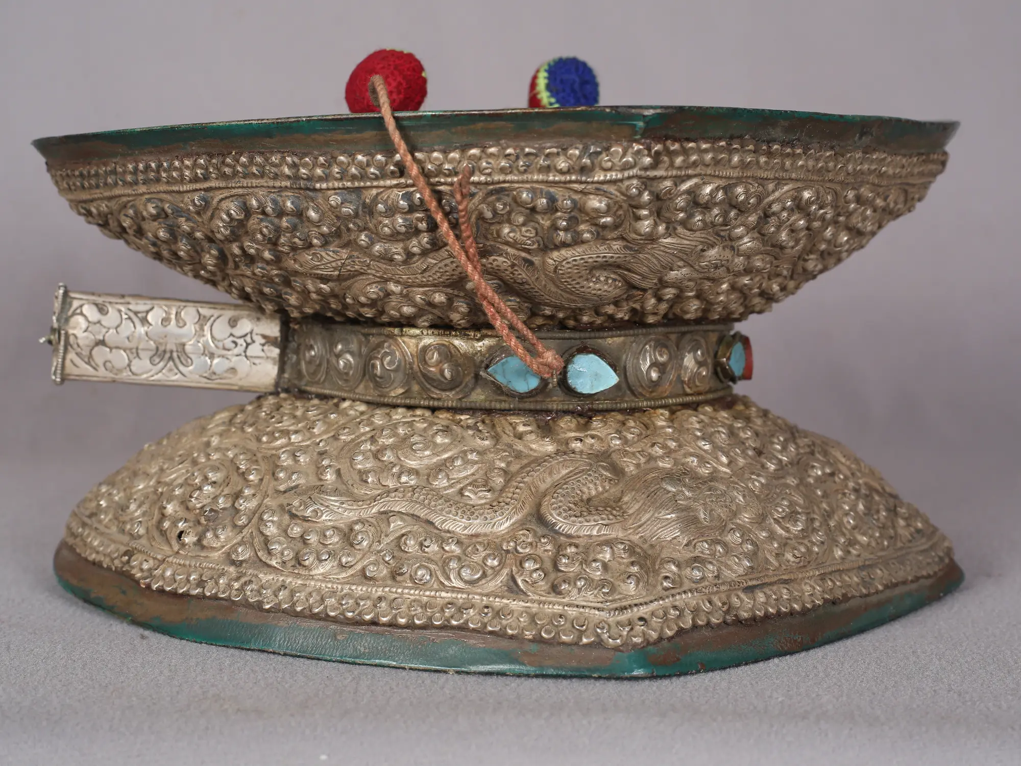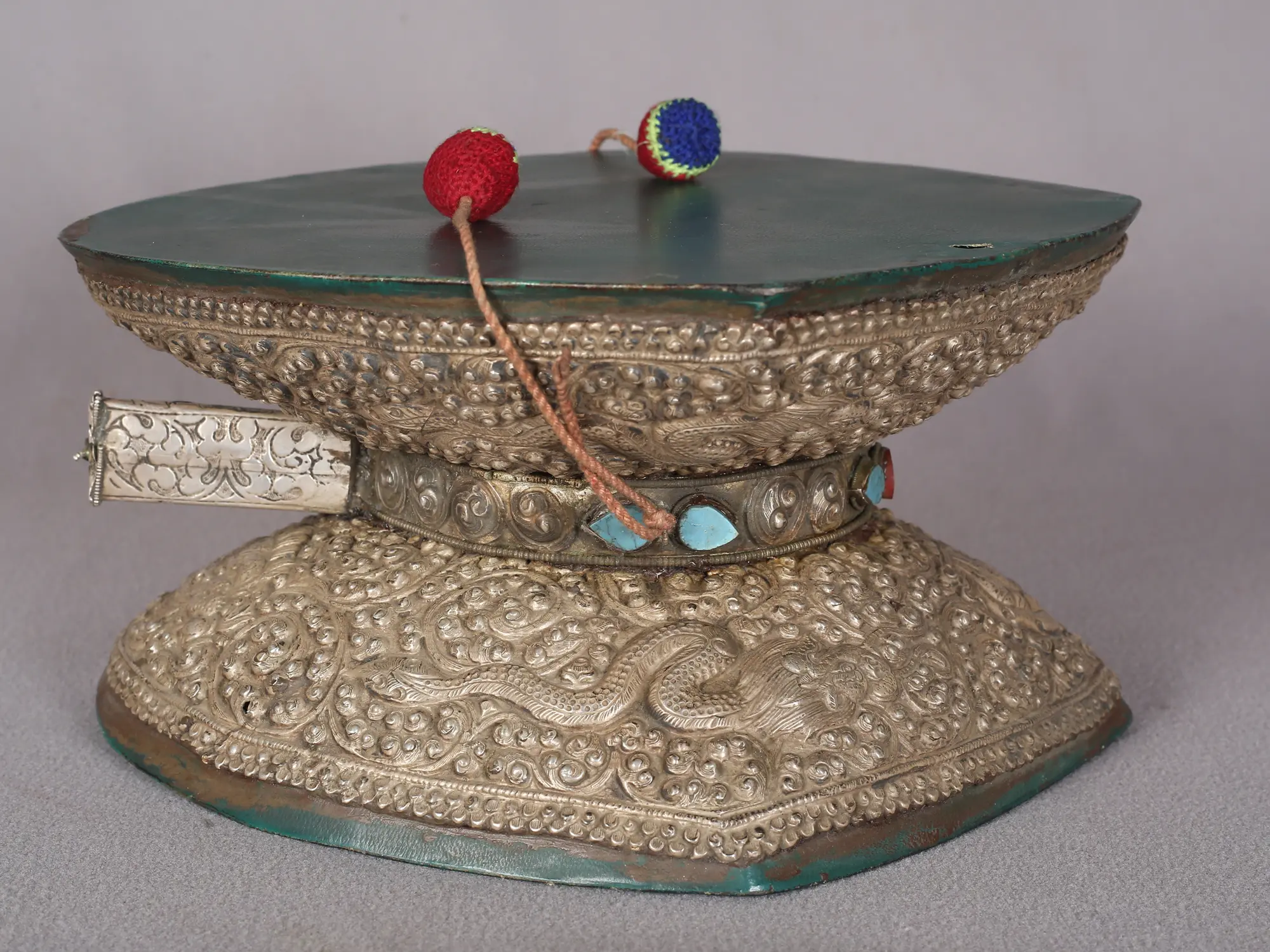 This Tibetan Buddhist Ritual Drum, “the enchanting Damaru,” is a magnificent blend of creativity and devotion. It is a symphony of beautiful artistry, adorned with mesmerizing flower and dragon themes and embellished with magnificent stones. In the tapestry of Tibetan Buddhism, the “Damaru” becomes a holy instrument, resonating in Tantric practices (Chod rituals) to overcome obstacles. It is more than just a decor piece made of silver and wood; rather, it is a conduit for spiritual energies.